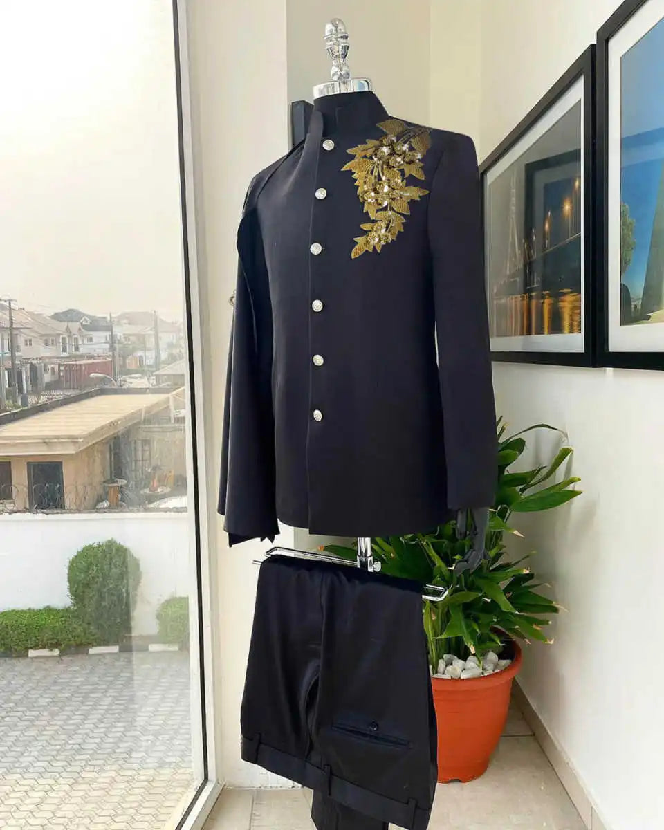 Make a bold, theatrical statement with a tailor‑made 2‑piece suit that pairs an appliqué‑and‑sequin embellished blazer with a dramatic cape. Designed for cosplay, parties, performances, and grooms who want a standout tuxedo, this customizable set blends couture embellishment with precise tailoring for maximum visual impact and wearable comfort.