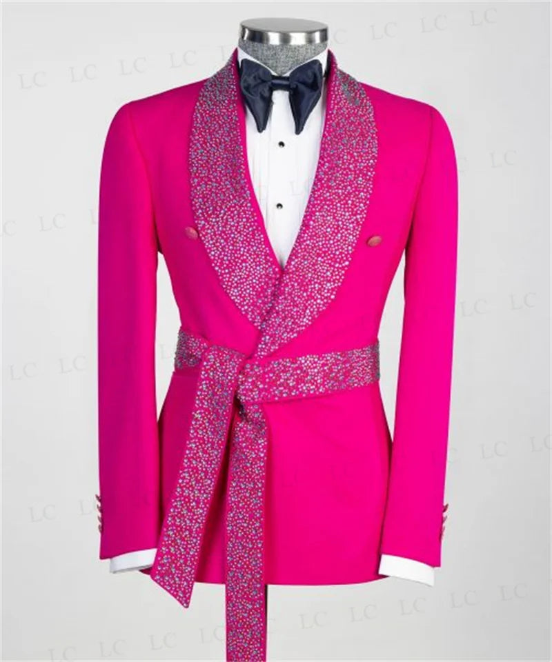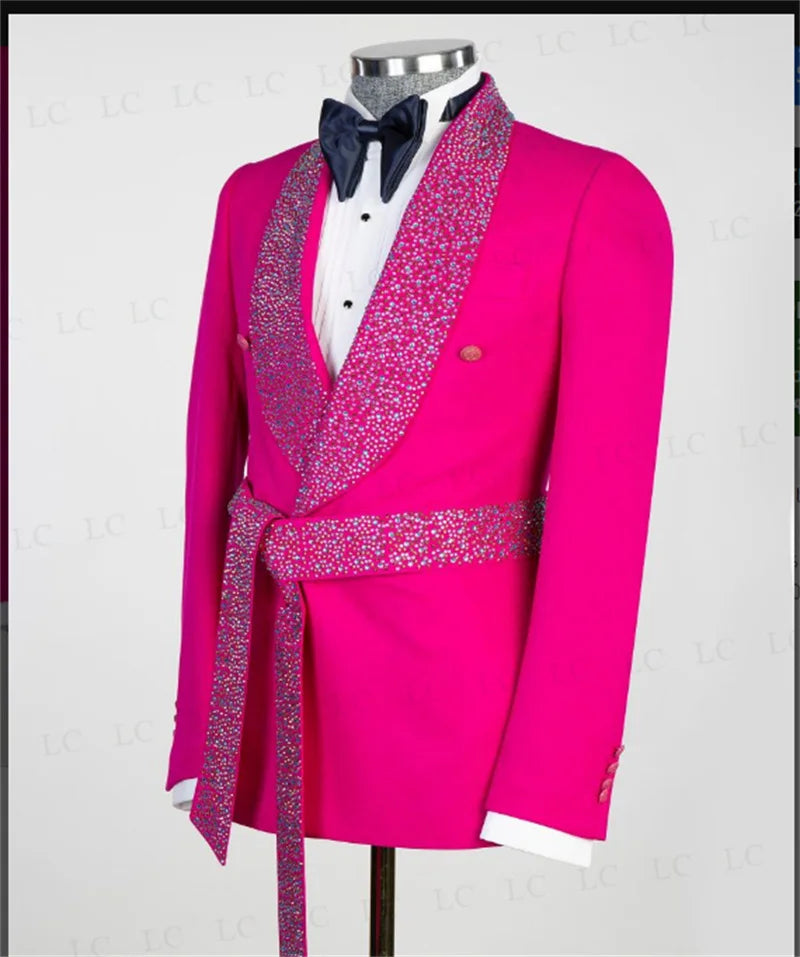 Men Suits Beads Crystal Luxury 2 Pieces Blazer PantOne Button With Belt Wide Lapel Formal Party Wedding Groom Plus Size Tailored