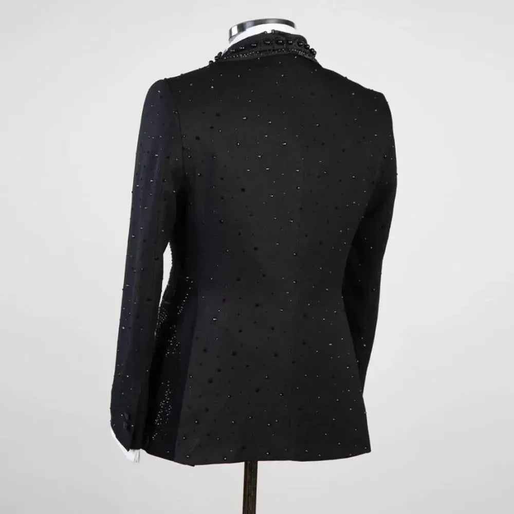 Make your wedding day unforgettable with this exquisite tailor-made 3-piece men’s suit, crafted for grooms who want a refined, couture-inspired look. This ensemble—featuring a shawl lapel one-button coat, matching vest, and tailored pants—is richly detailed with hand-applied pearl beading that adds a soft, elegant sheen and artisanal character without overwhelming the timeless silhouette.