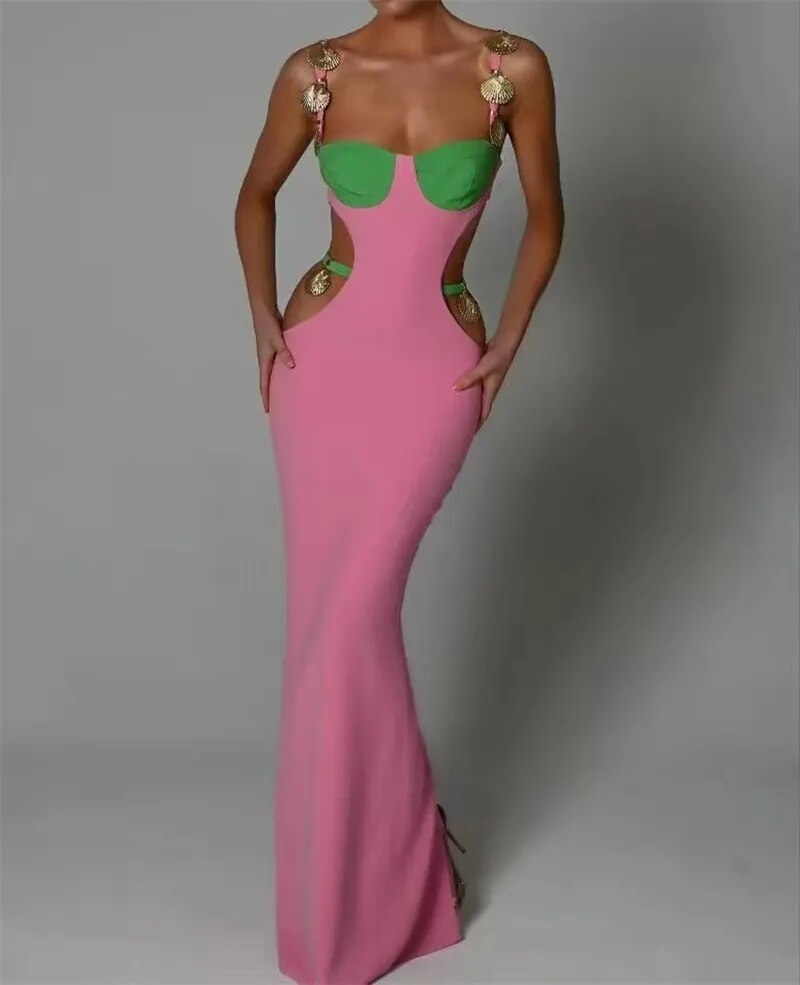 Mermaid Long Bandage Women Prom Dress Sexy Hollow Strap Sleeveless Formal Red Carpet Party Evening Gown Splicing Colors In Stock