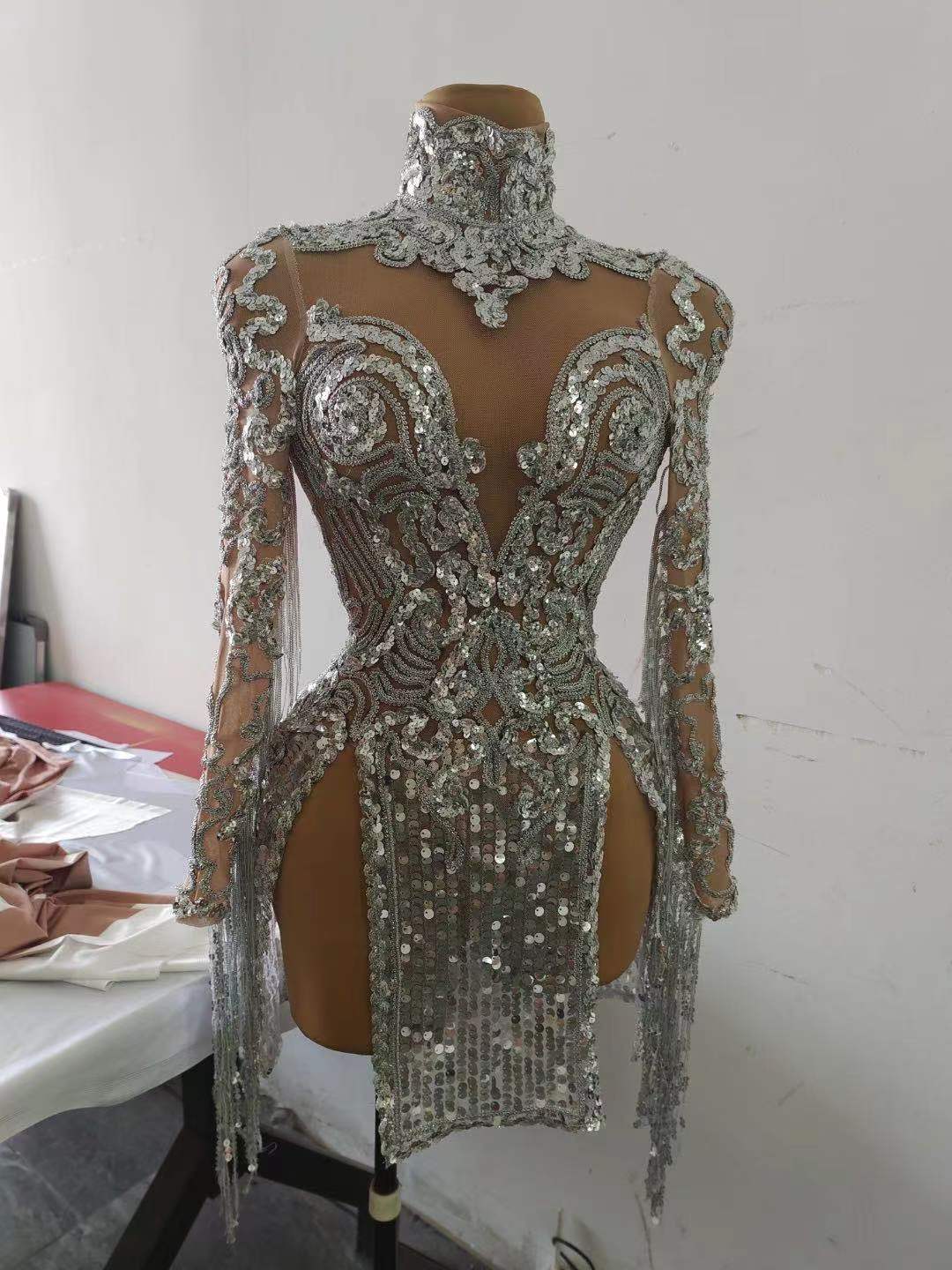 Mesh Crystals Party Long Tassel Sleeve Club Dress Sexy Jazz Singer Dancer Stage Costumes