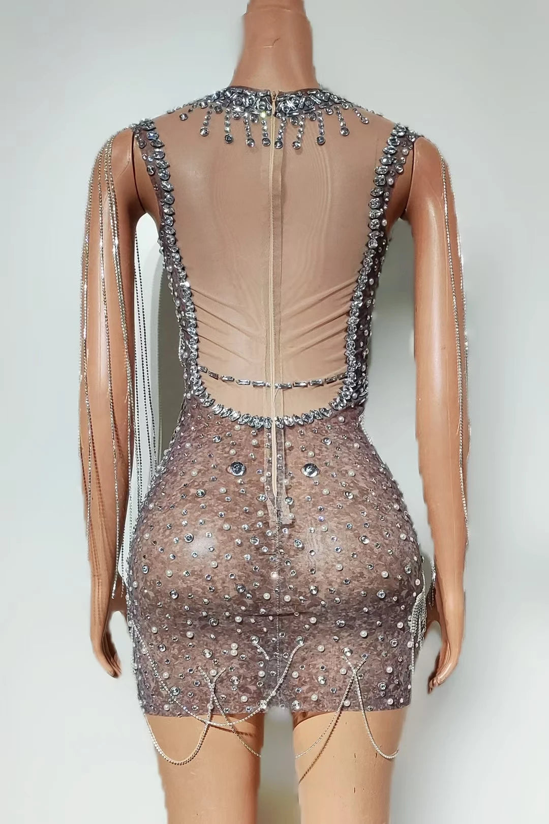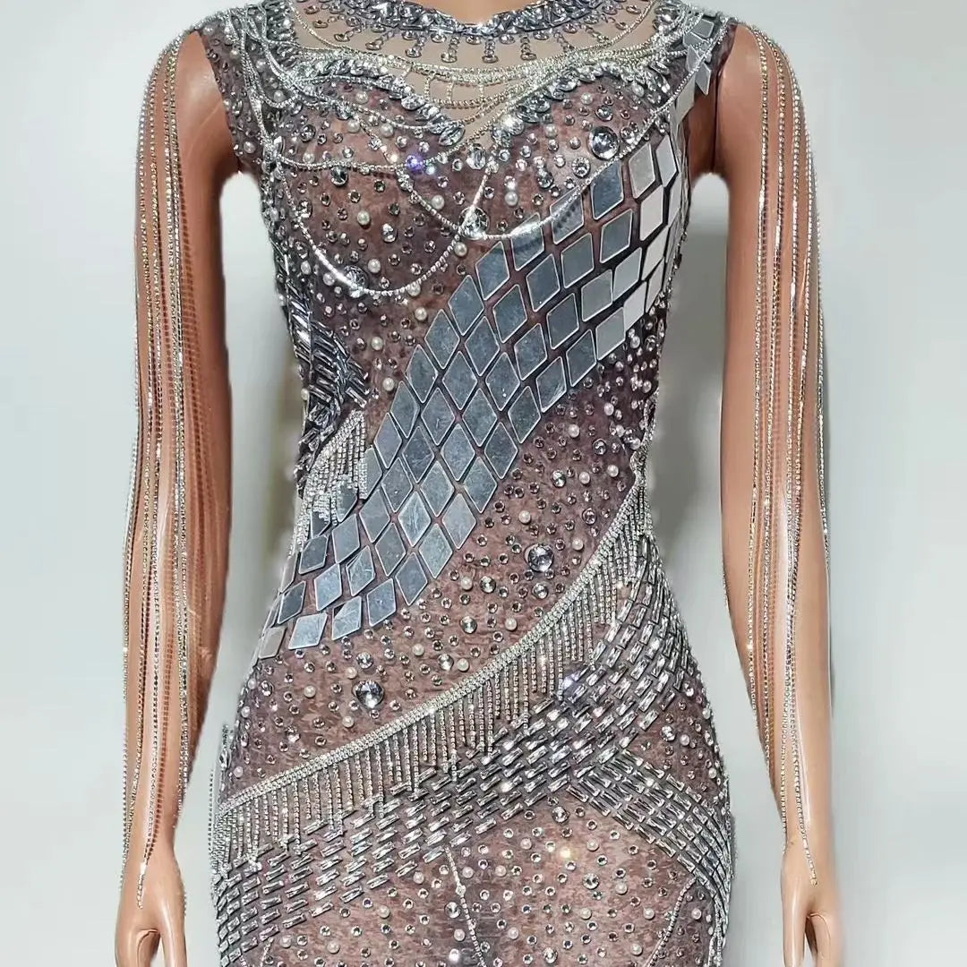 Mesh Tight And Sexy Rhinestone Tassel PearlSequin Hip Hugging Short Skirt Party Nightclub Barrampoline Performance Costume