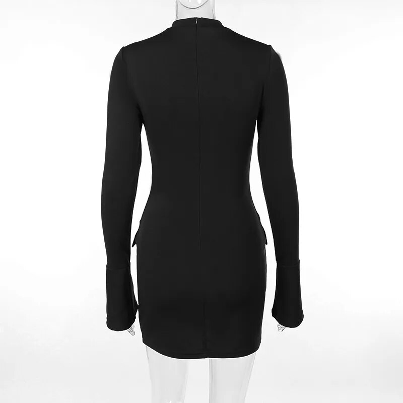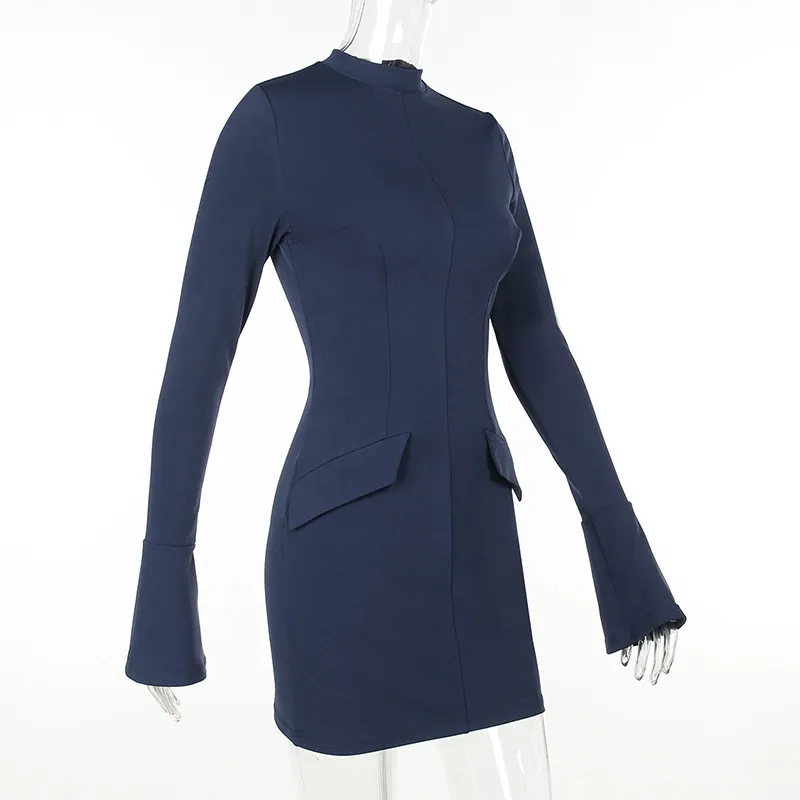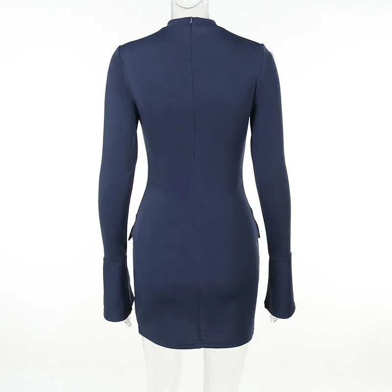 Dark Blue Two Pocket Sexy Mini Dress For Women Autumn Winter New Long Sleeve Bodycon Club Party Dress Elegant