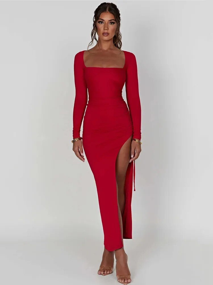 Long Sleeve Ruched High Split Maxi Dress Women Square Collar Drawstring Bodycon Sexy Party Long Dress Elegant Autumn
