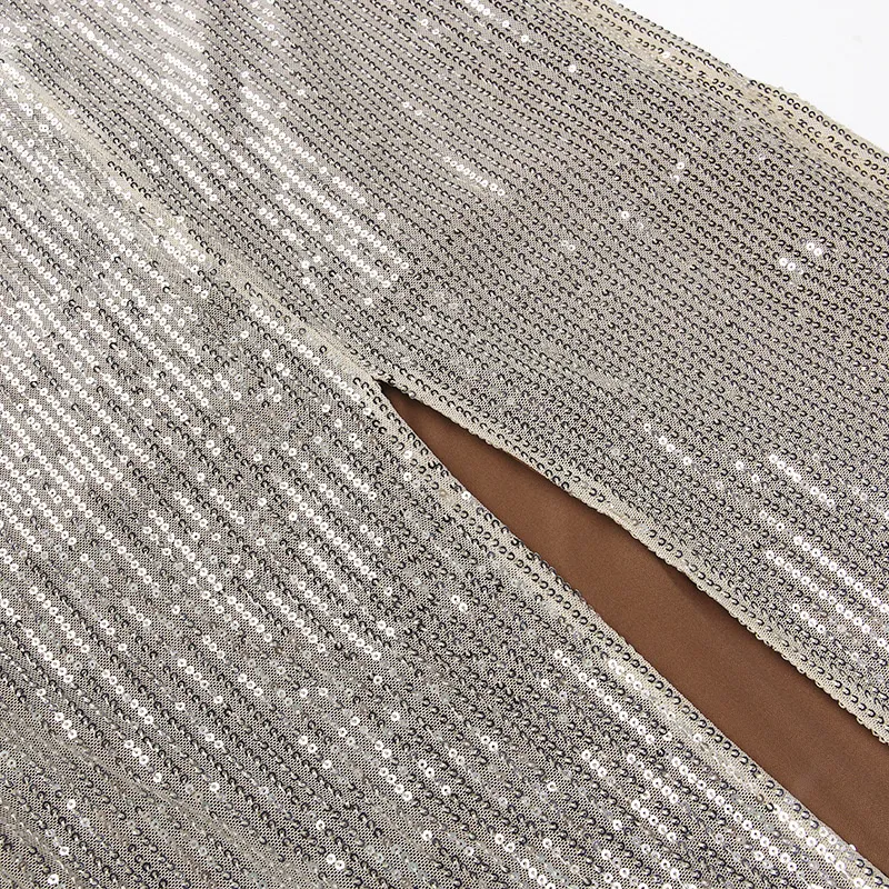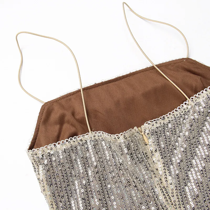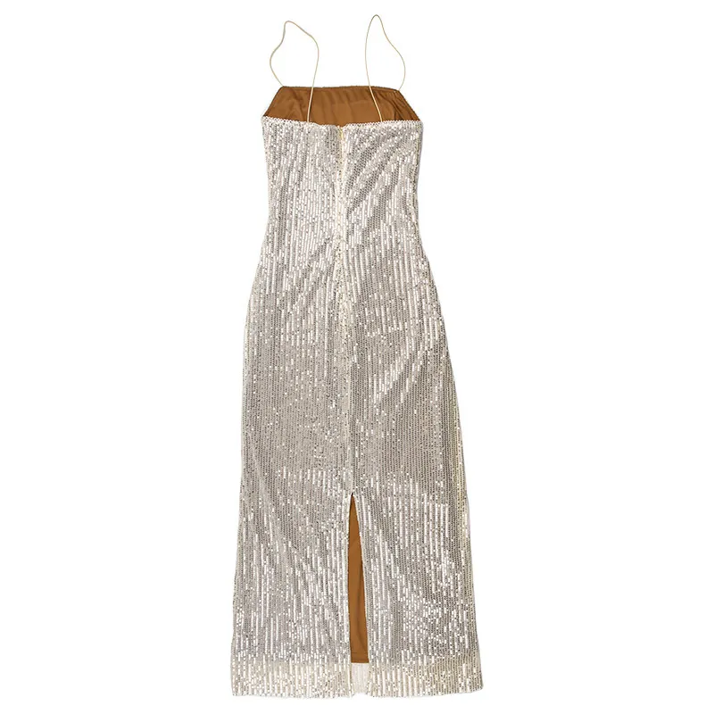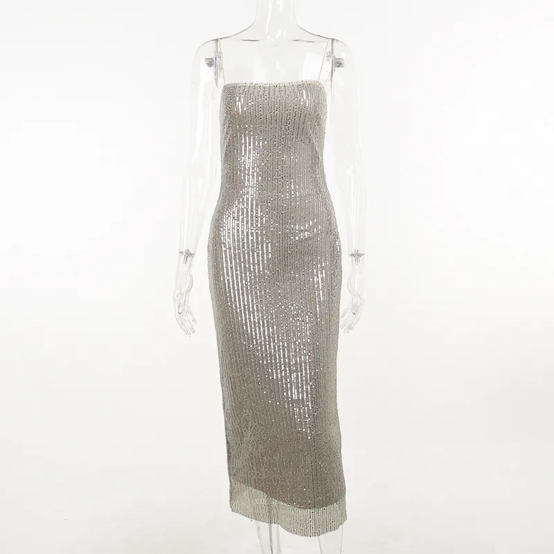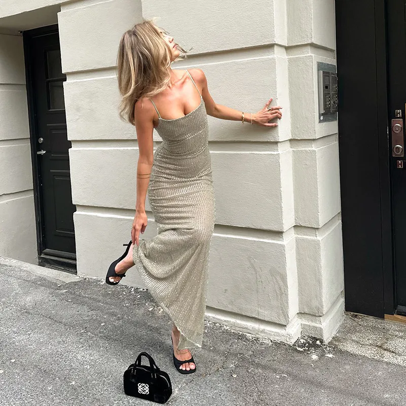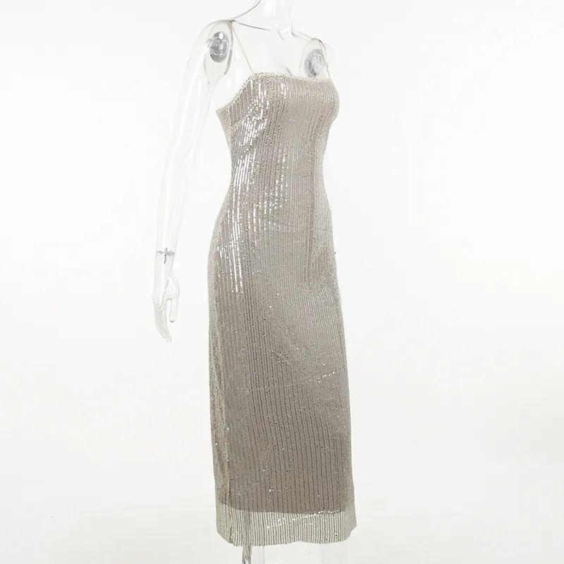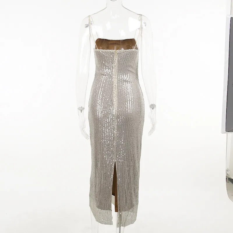 Spaghetti Strap Sparkle Maxi Dress Women Glitter Elegant Split Sleeveless Long Dress Fashion Sexy Party Club Dress