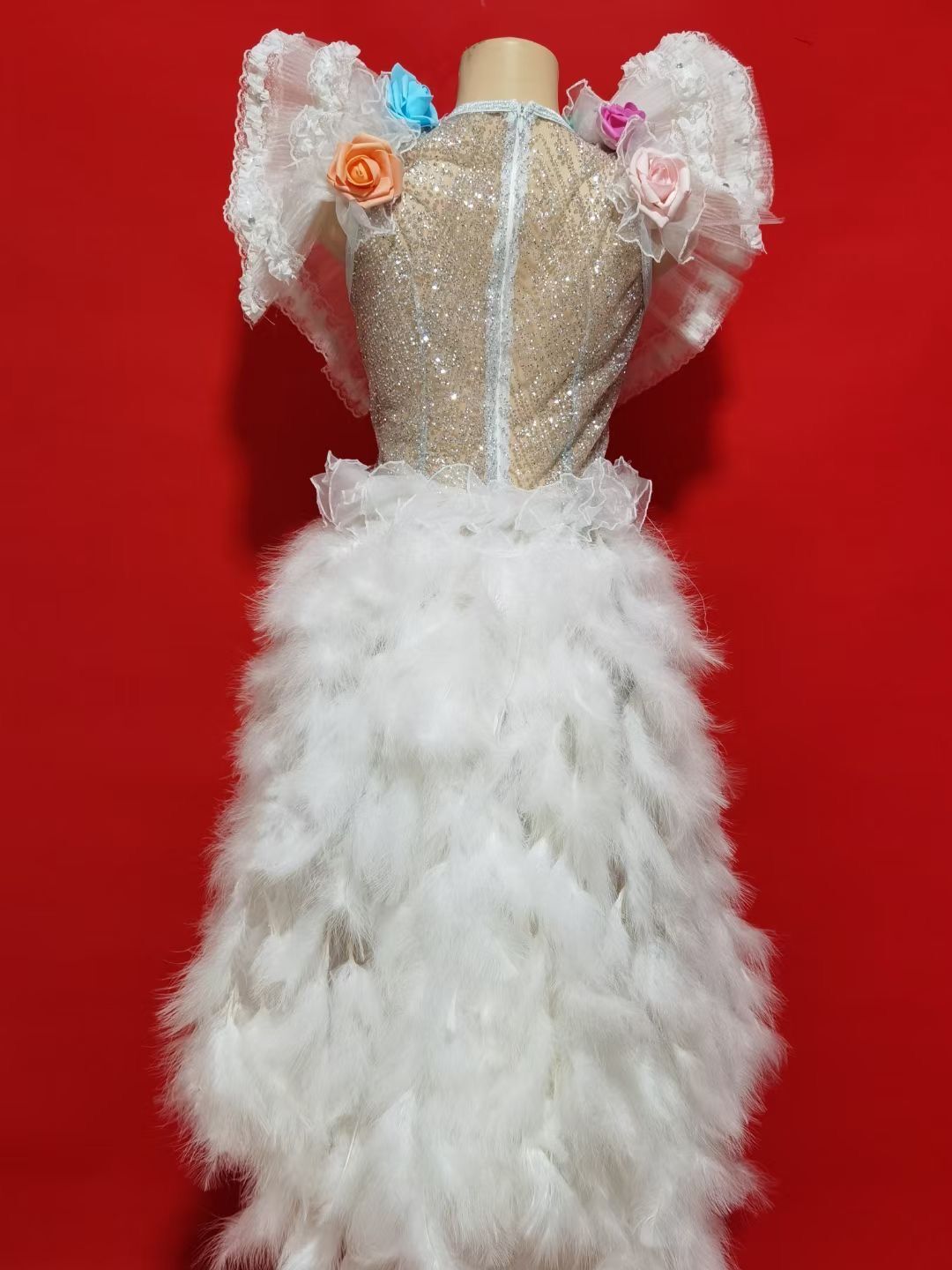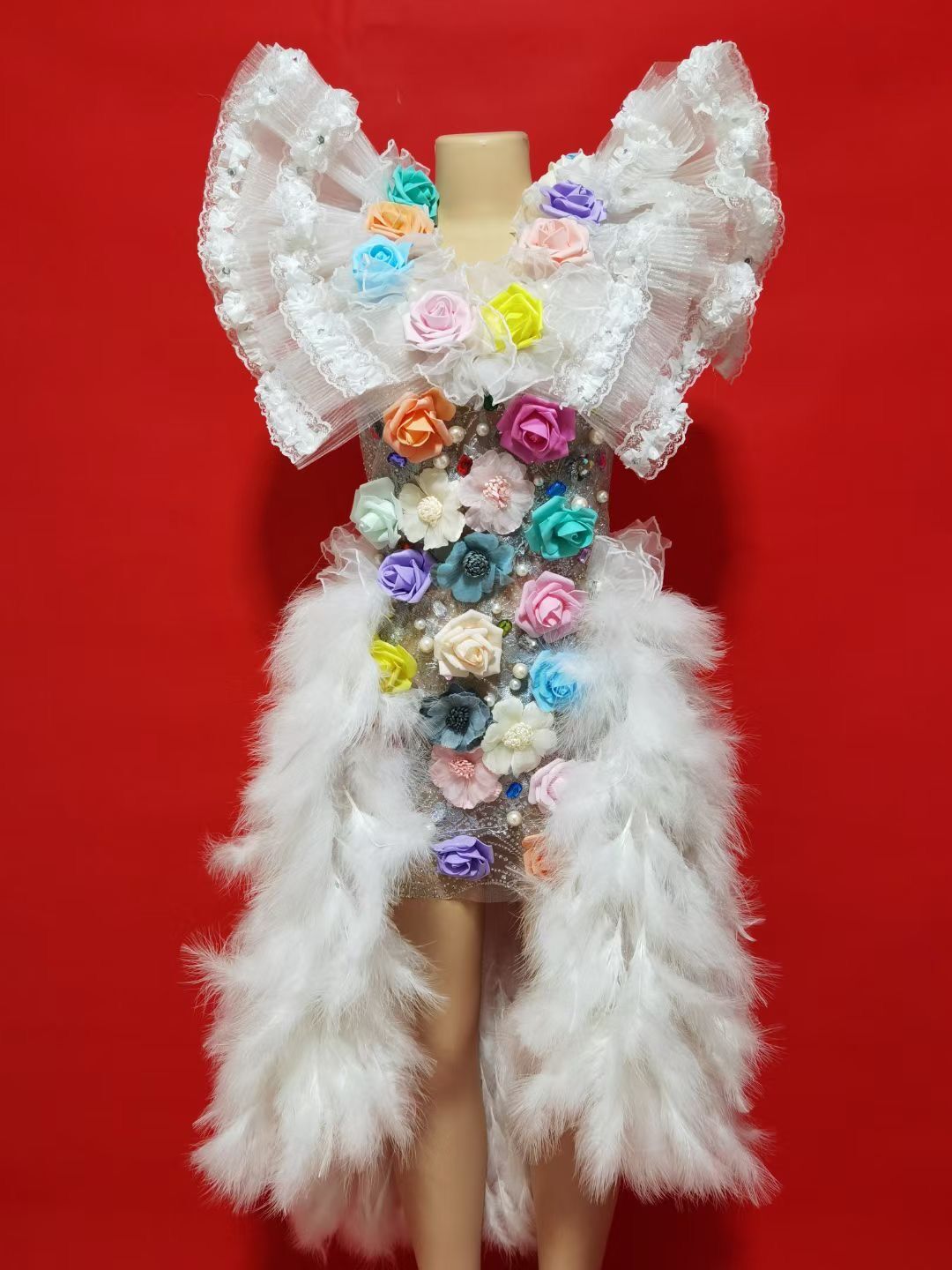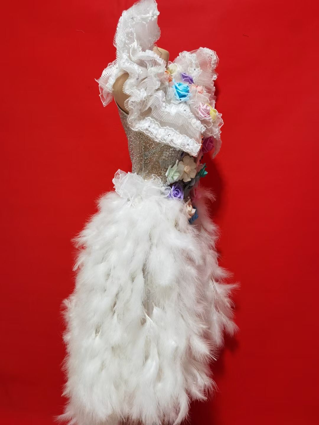 Multi-color Flowers Rhinestones Pearls White Feather Dress Birthday Celebrate Costume Evening Dance Performance Dress