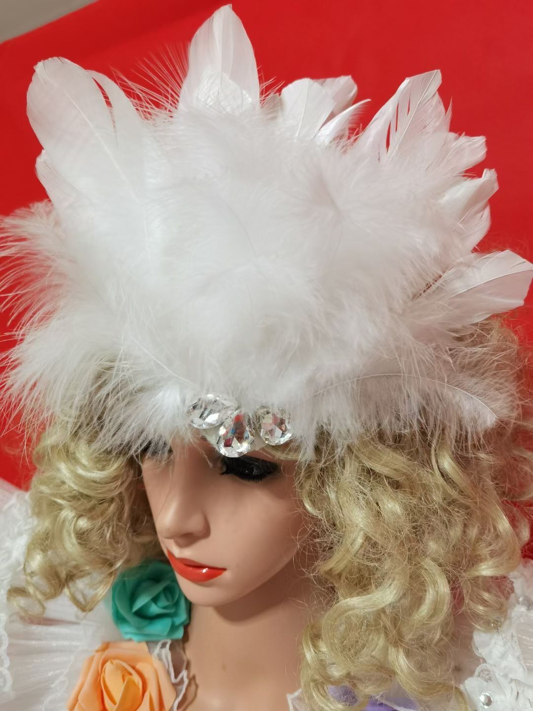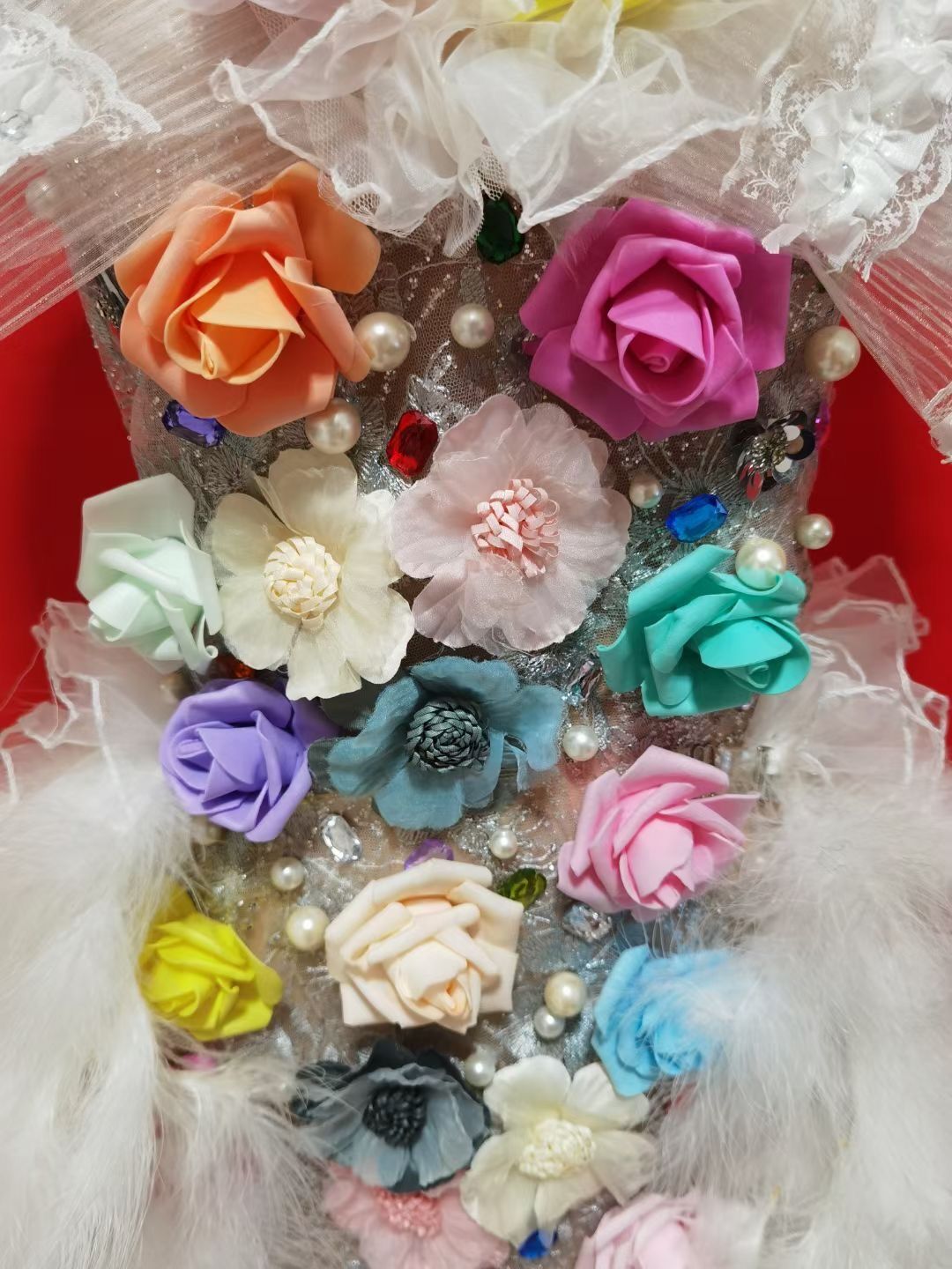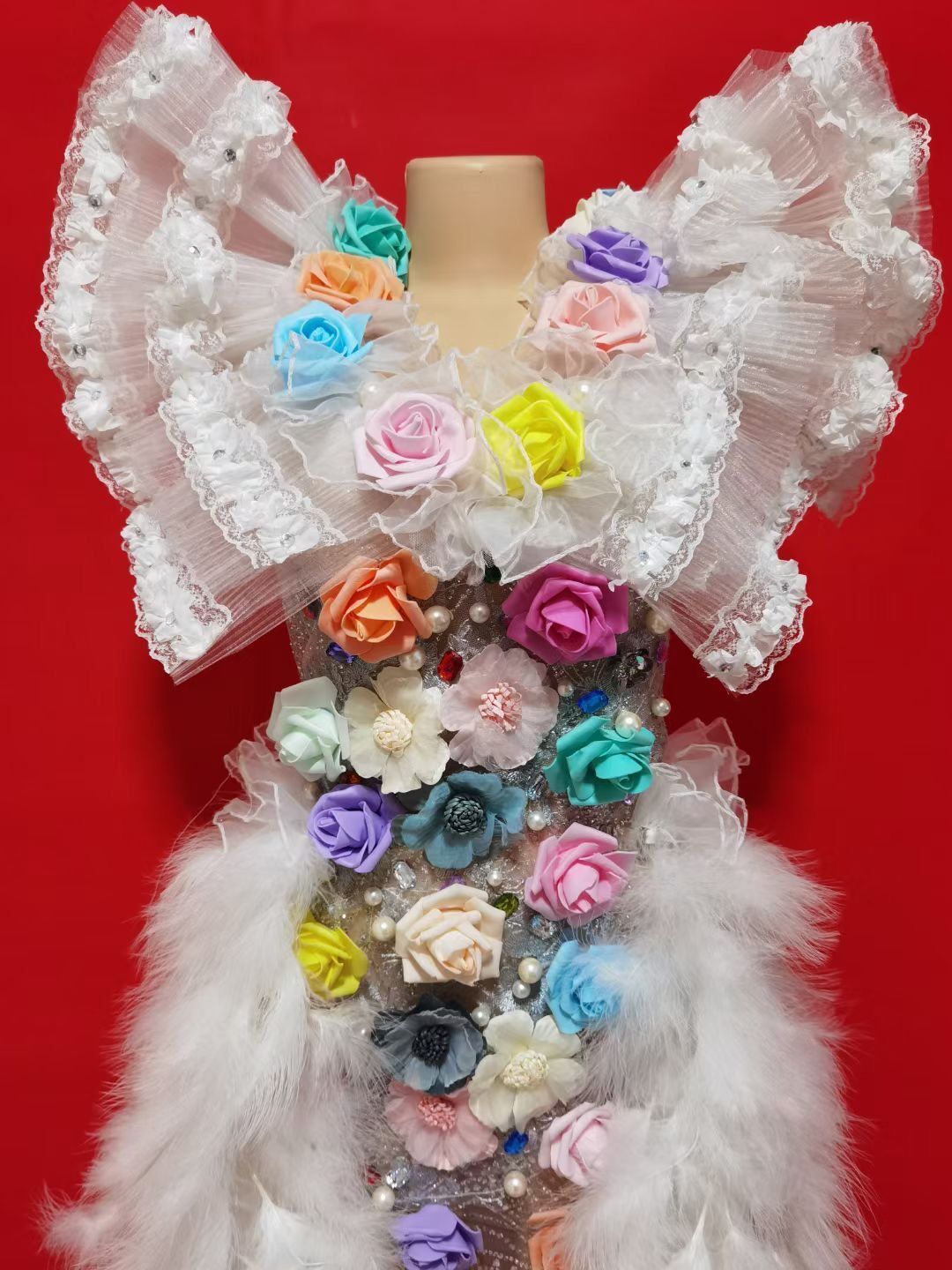 Multi-color Flowers Rhinestones Pearls White Feather Dress Birthday Celebrate Costume Evening Dance Performance Dress