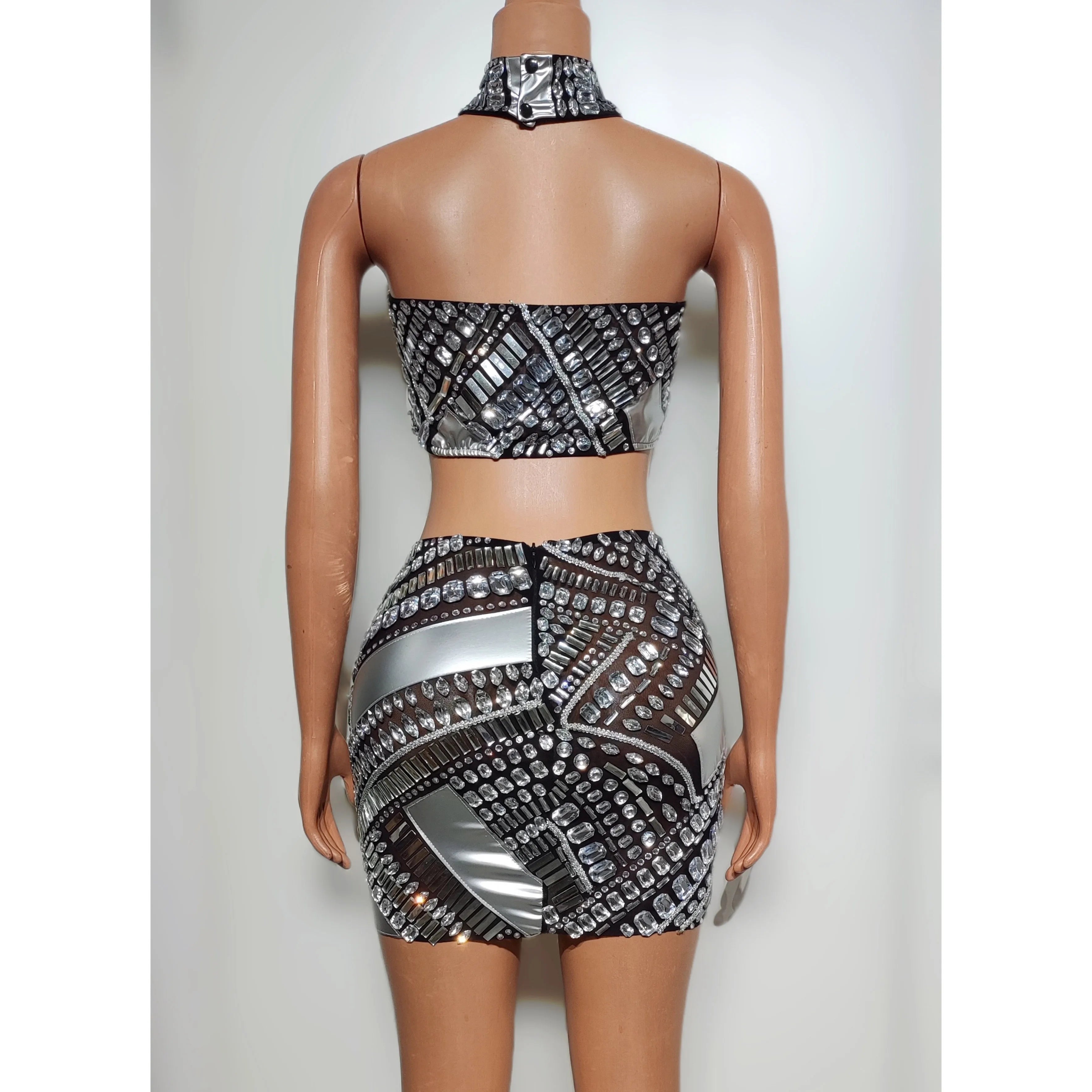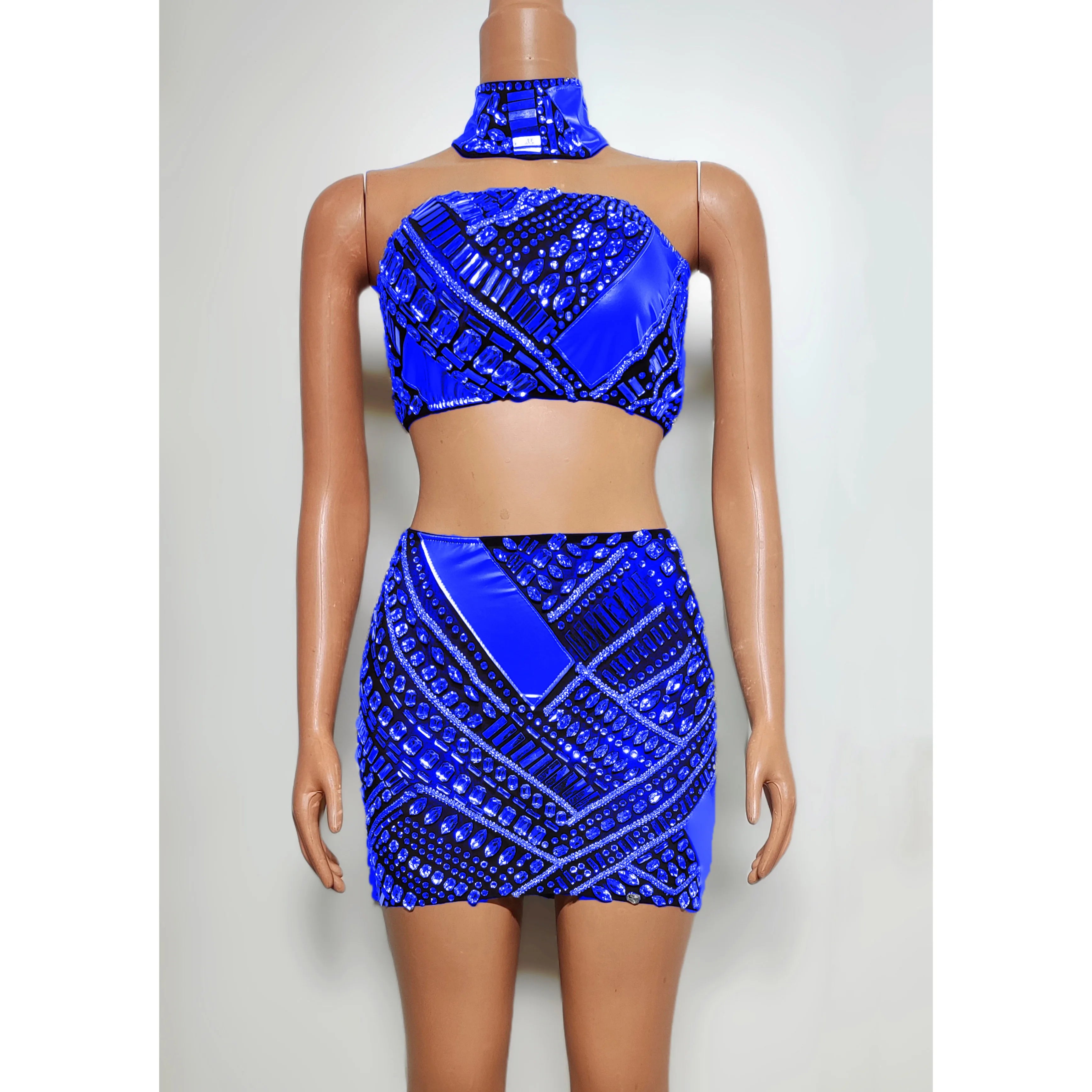 Multi-Color Rhinestone Festival Clothing Gogo Wear Sexy Nightclub Bar Club Performance Cotume Women Collar Crop Tops Skirt