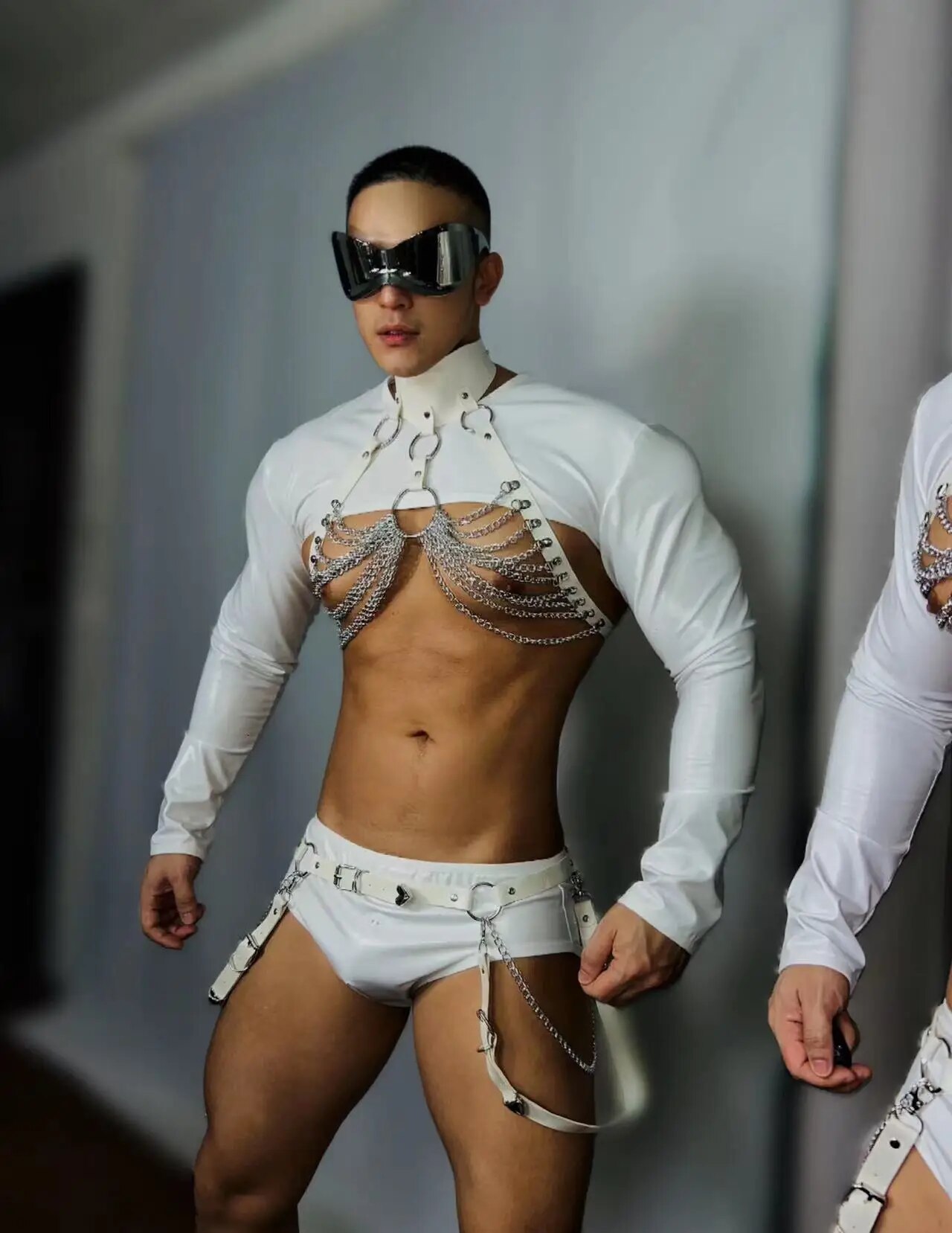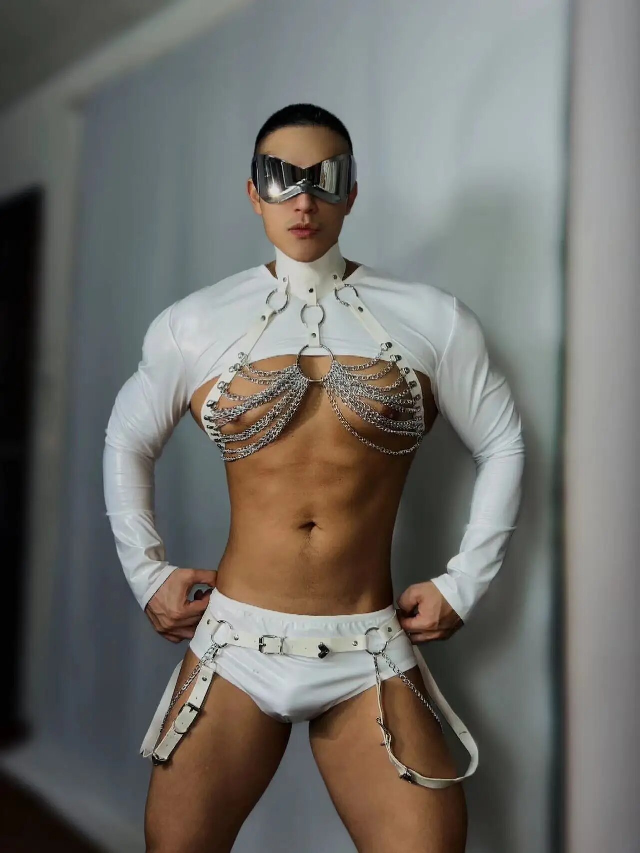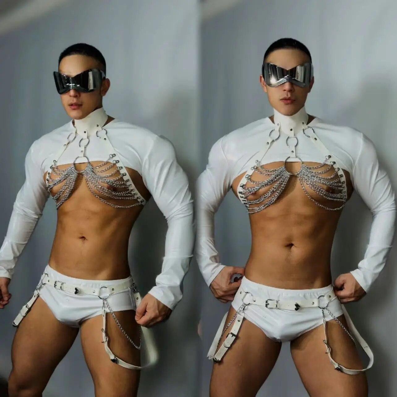 Muscle Man Club Party Show Rave Outfit Sexy Nightclub Bar White Chest Chains Pole Dance Costume DJ Dancer Performance Clothes