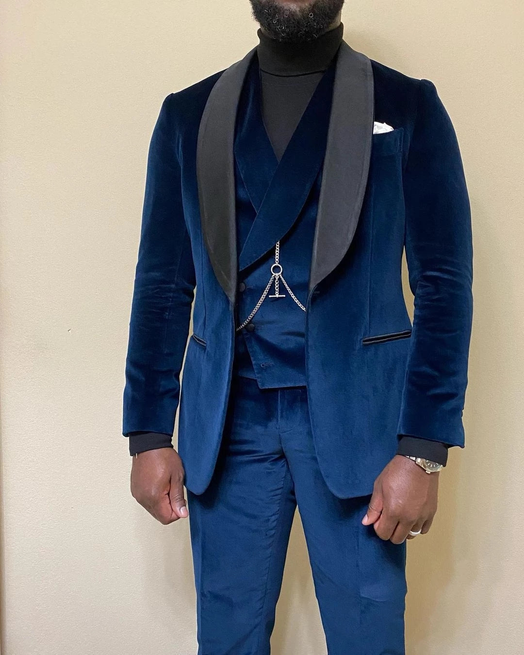 The Navy Blue Velvet Men's Suit is a sophisticated 3-piece ensemble tailored for weddings and formal occasions. This slim fit suit features a one-button blazer with a shawl lapel, exuding timeless elegance and refined style. The set includes a vest and pants, perfect for grooms and distinguished gentlemen looking to make a lasting impression. Embrace classic charm with this distinguished and versatile suit.