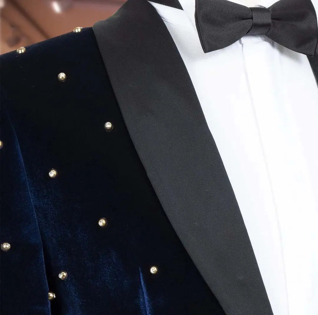 ??Make a statement with this navy velvet blazer men's suit paired with black pants. The suit features intricate appliques and a one-button closure for a sleek look. The wide satin lapel adorned with pearls adds a touch of elegance, making it perfect for formal events, weddings, and hosting duties. Custom-made to fit plus sizes, this ensemble exudes sophistication and style.