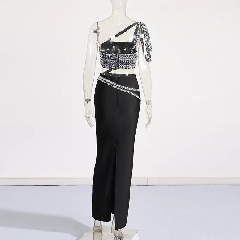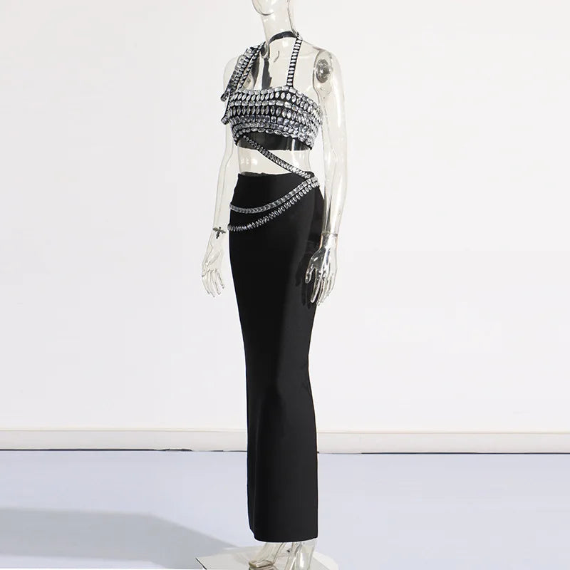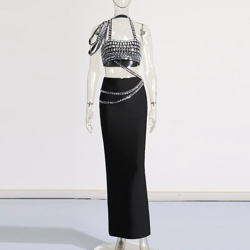 Make a dramatic entrance with thisNew Arrival Black Color Women Sexy 2 Pieces Bodycon Long Bandage Dress— a striking two-piece set designed for nightclub glamour, VIP parties, and celebratory nights where bold style meets high sparkle. This ensemble combines sculpting bandage construction with oversized crystal accents to create a confident, head-turning silhouette.