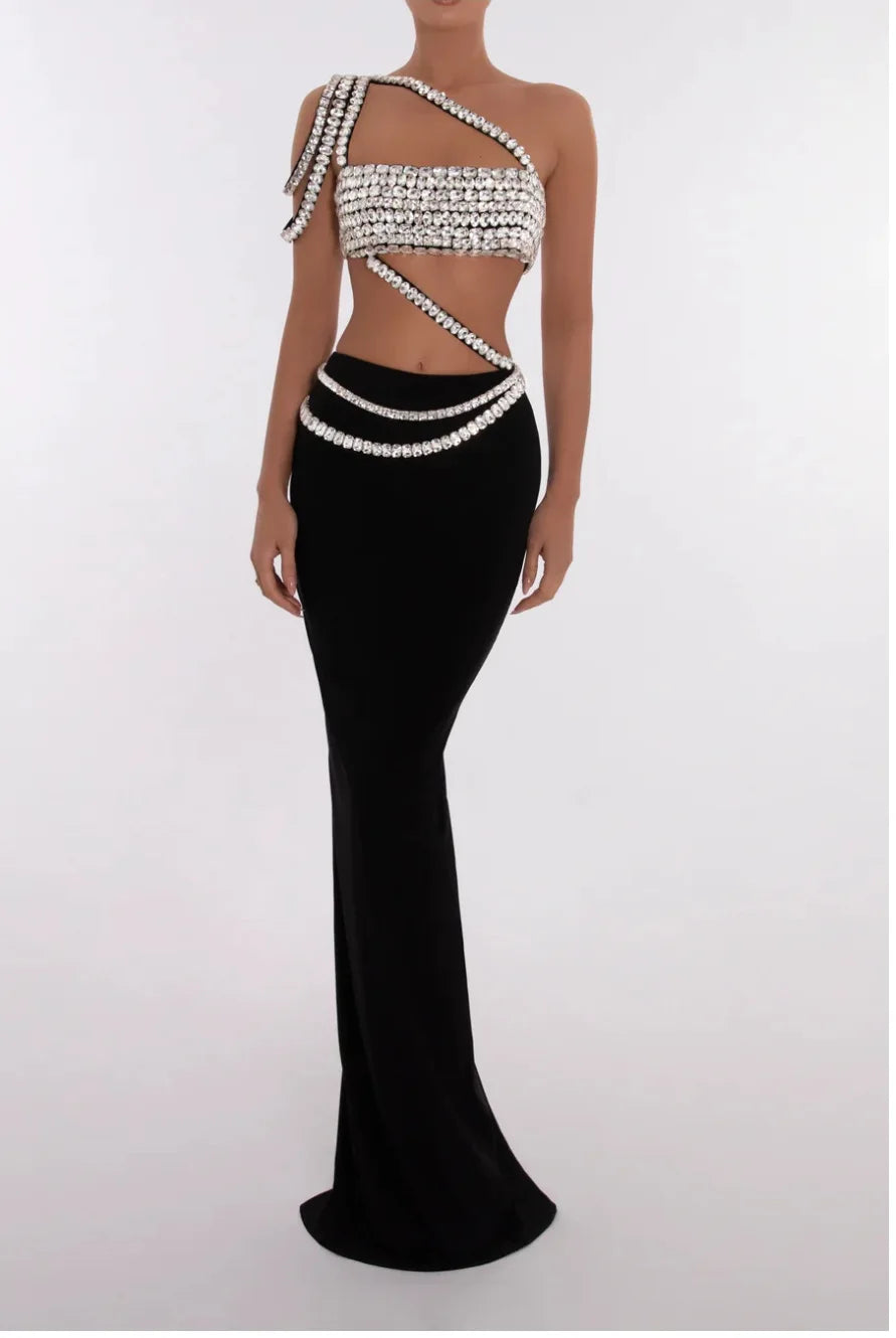 Black Color Women Sexy 2 Pieces Bodycon Long Bandage Dress Big Crystal Fashion Nightclub Party Celebrate Dress