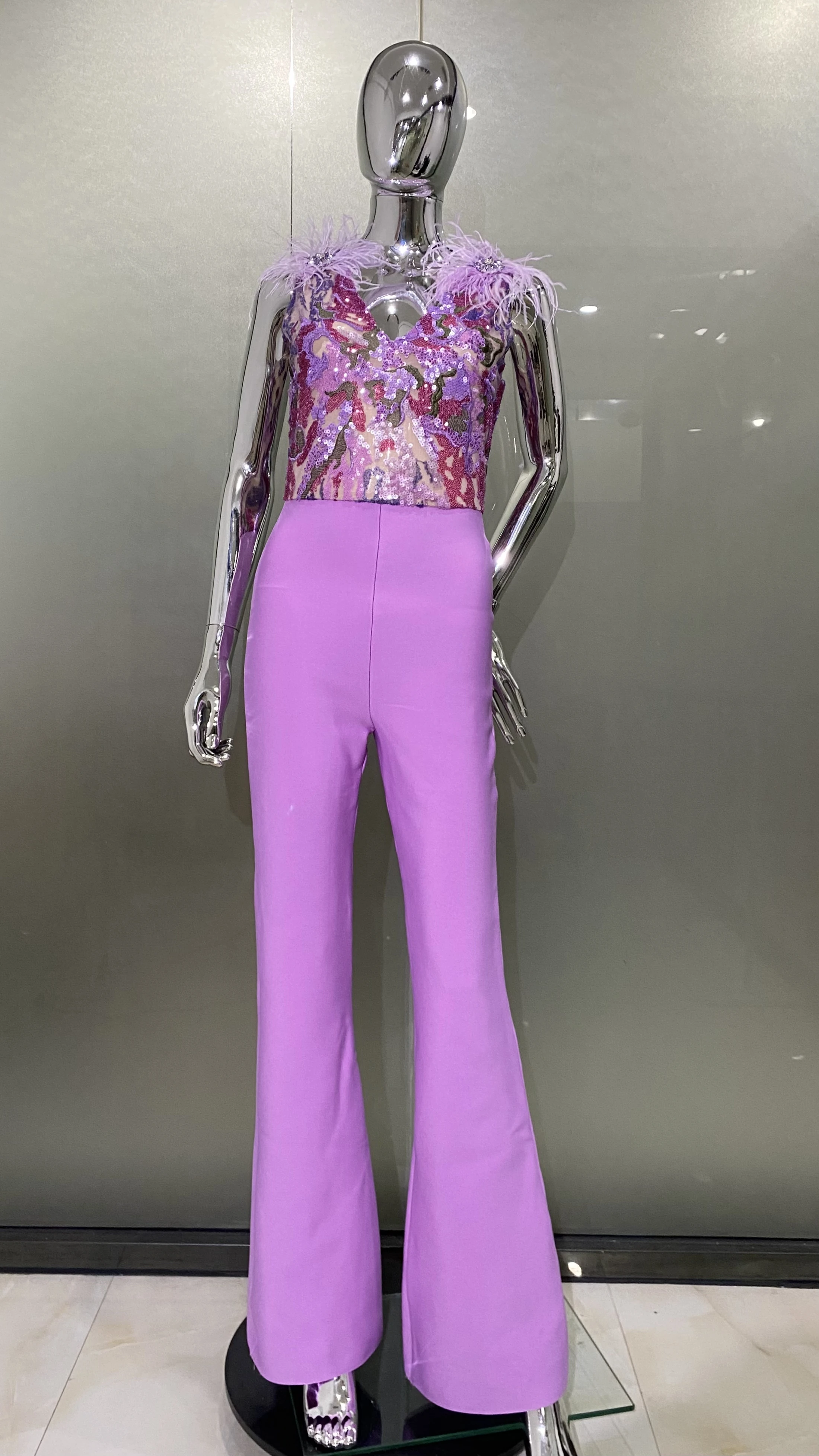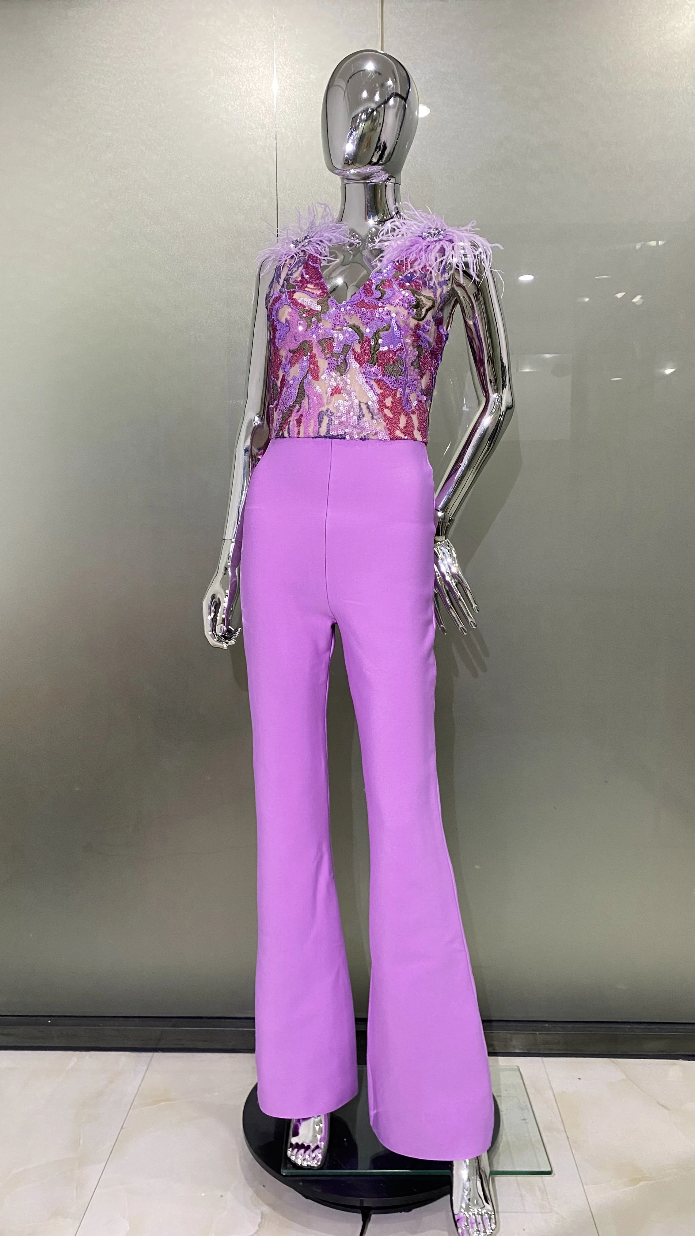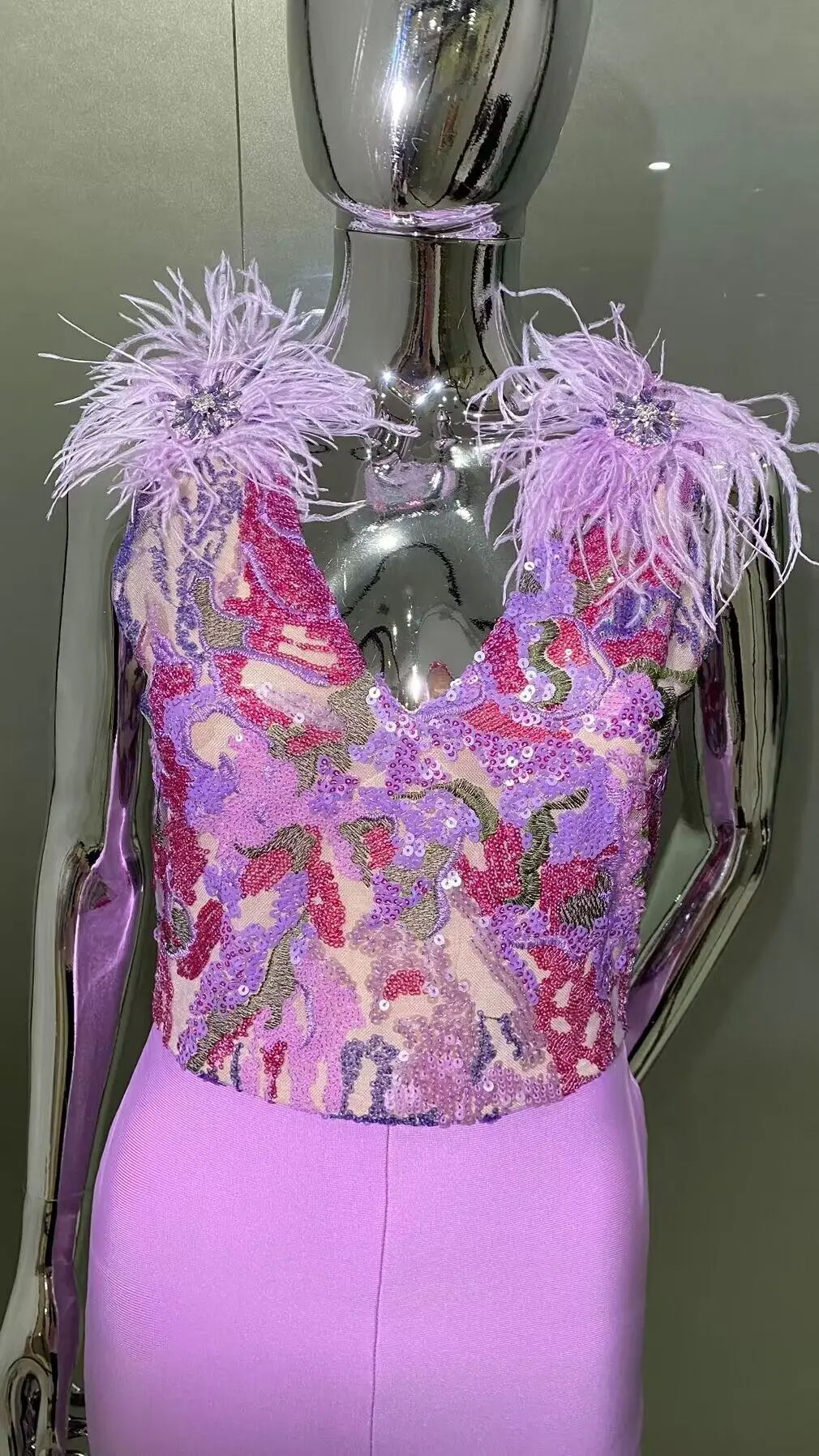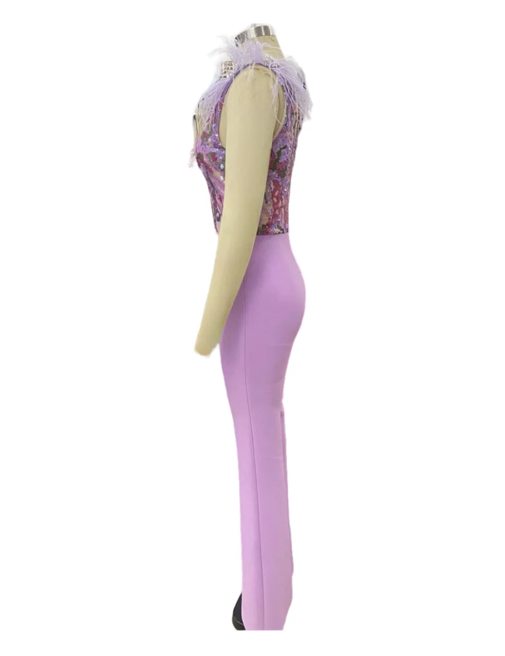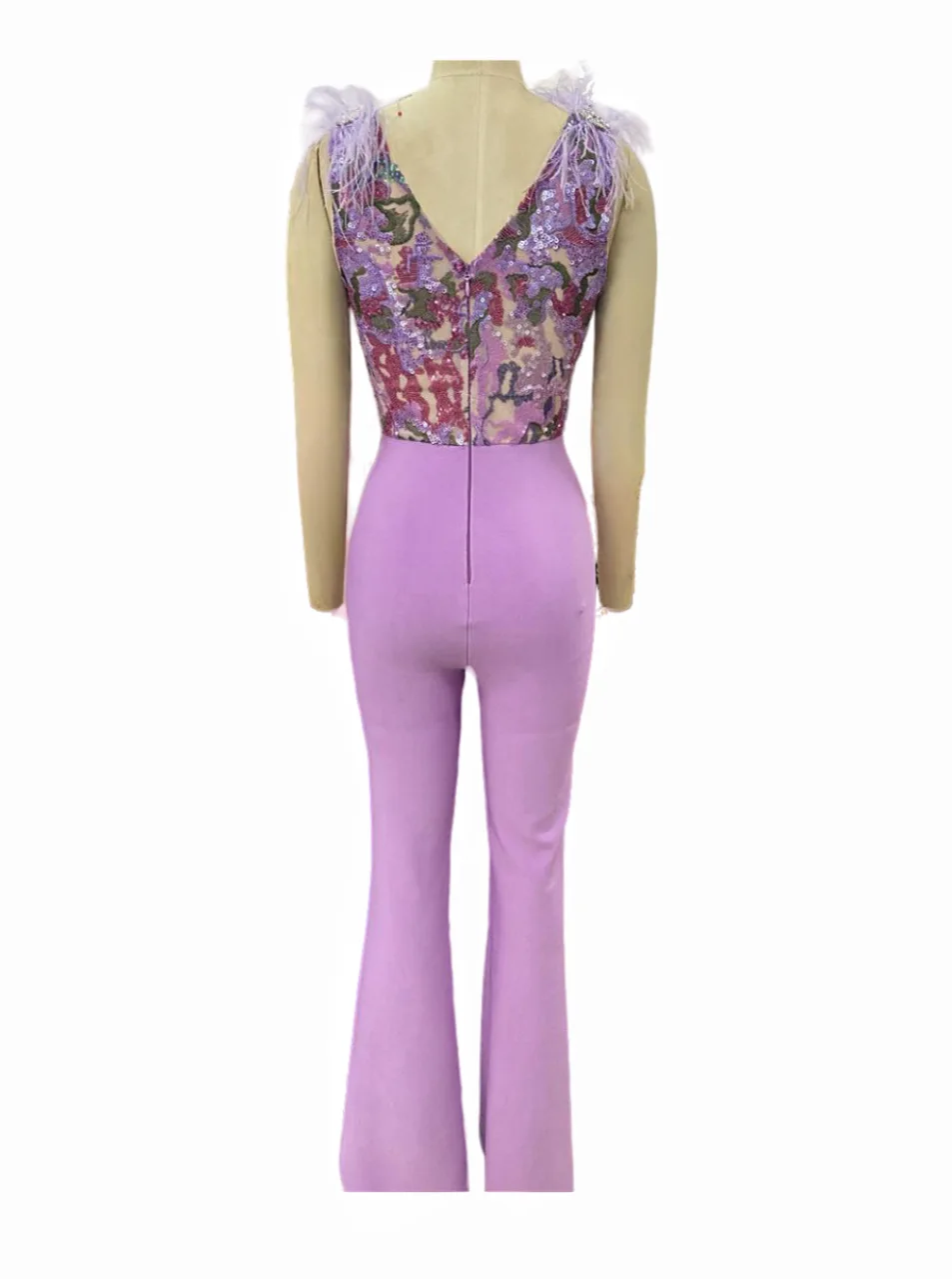 Sequin Embroidered V-neck Sleeveless Feathers Purple High-waisted Romper Fashion Evening Party Outfit