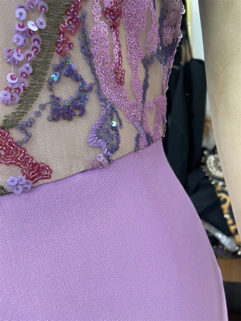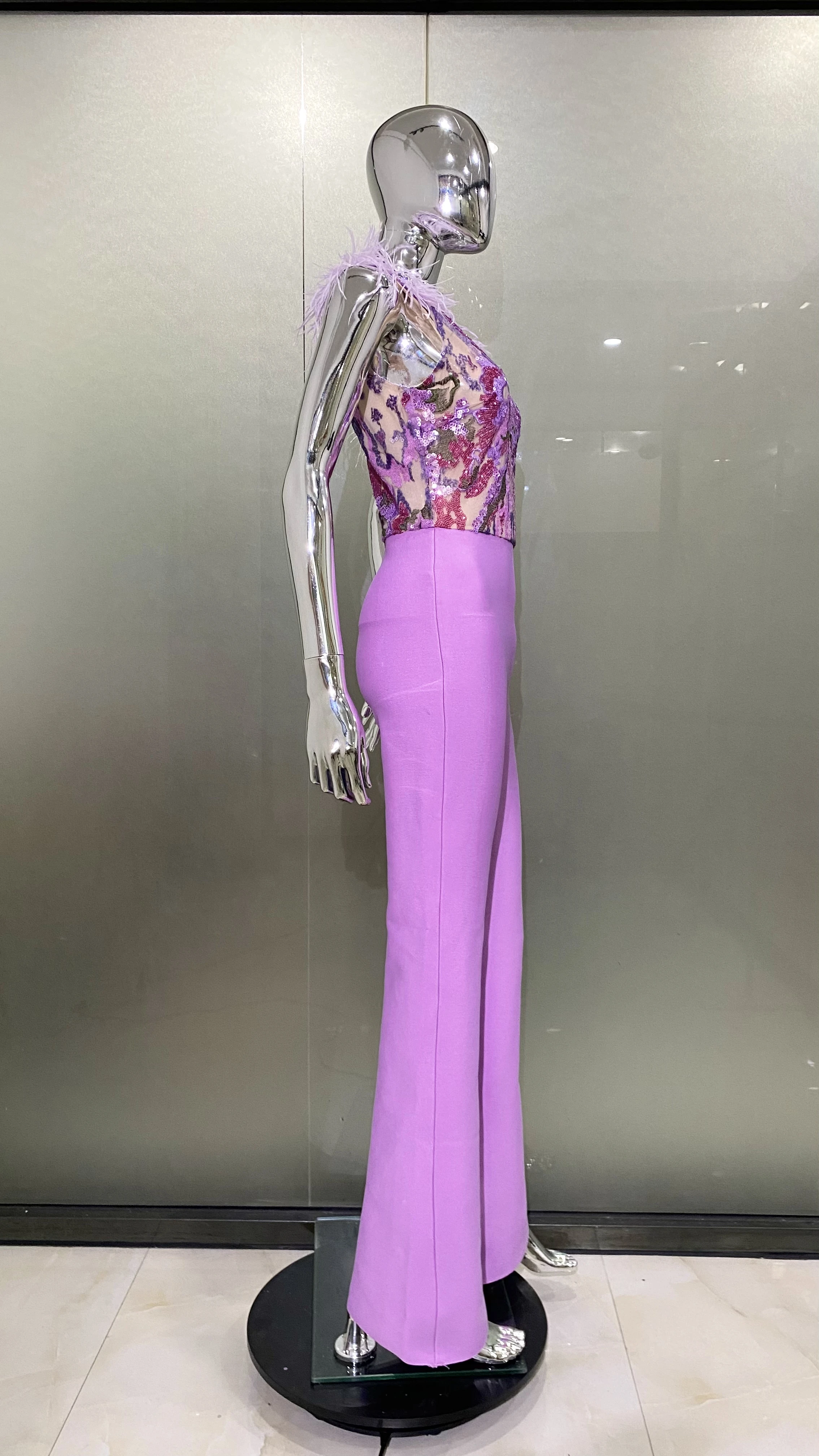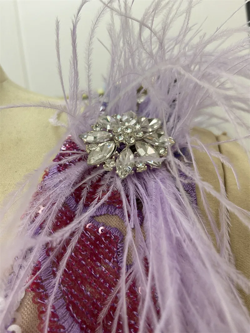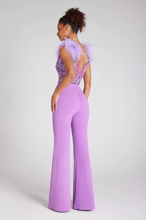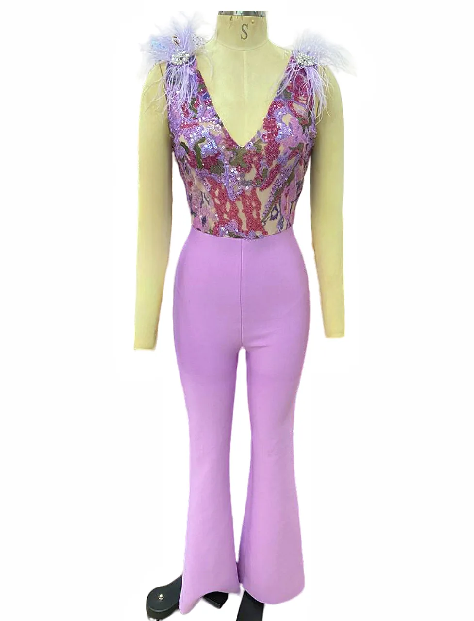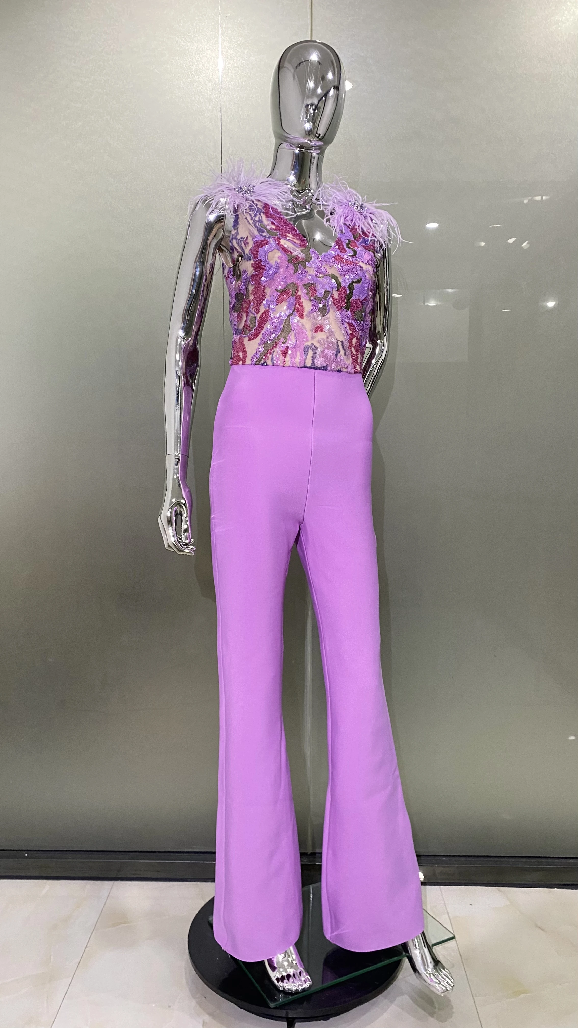 Sequin Embroidered V-neck Sleeveless Feathers Purple High-waisted Romper Fashion Evening Party Outfit
