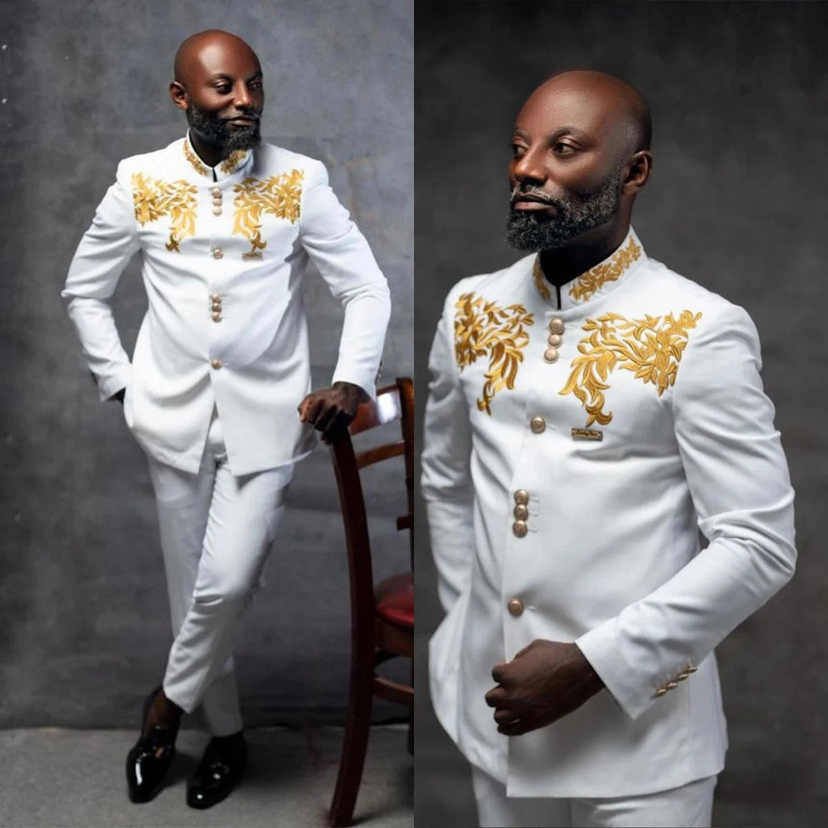 This new design men's suit set features 2 pieces including a blazer and pants with gold buttons and appliques. The slim-fit design and no lapel create a modern and sleek look, perfect for formal events such as weddings, work wear, and prom. Tailored for a comfortable and stylish fit, this suit is ideal for the fashion-forward groom or anyone looking to make a statement at a special occasion. Make a stylish impression with this tailored and contemporary suit for your next event.