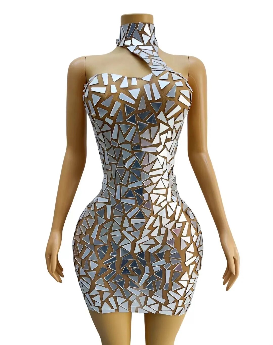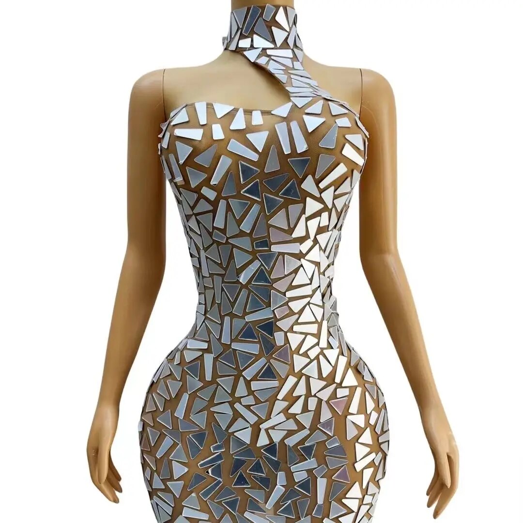 New Designed Shining Silver Mirrors SleevelessBirthday Celebrate Transparent Mlni Dress SexyStretch Costume Outfit Prom Quabo