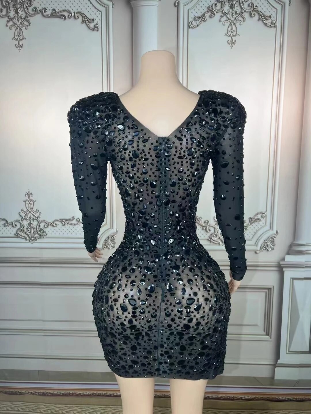 Sparkly Black Rhinestones Transparent Dress Prom Evening Sexy See Through Crystals Costume Birthday Party Clothes