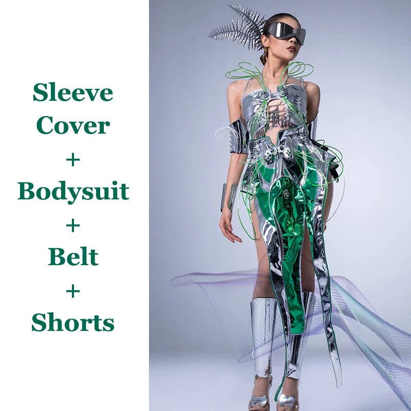 A bold, punk‑futuristic go‑go dancer costume designed for nightclubs, raves, festivals, drag, and stage performances. Combines aggressive punk hardware with futuristic materials and modular features so performers can move freely, stand out under lights, and adapt the look quickly between sets.