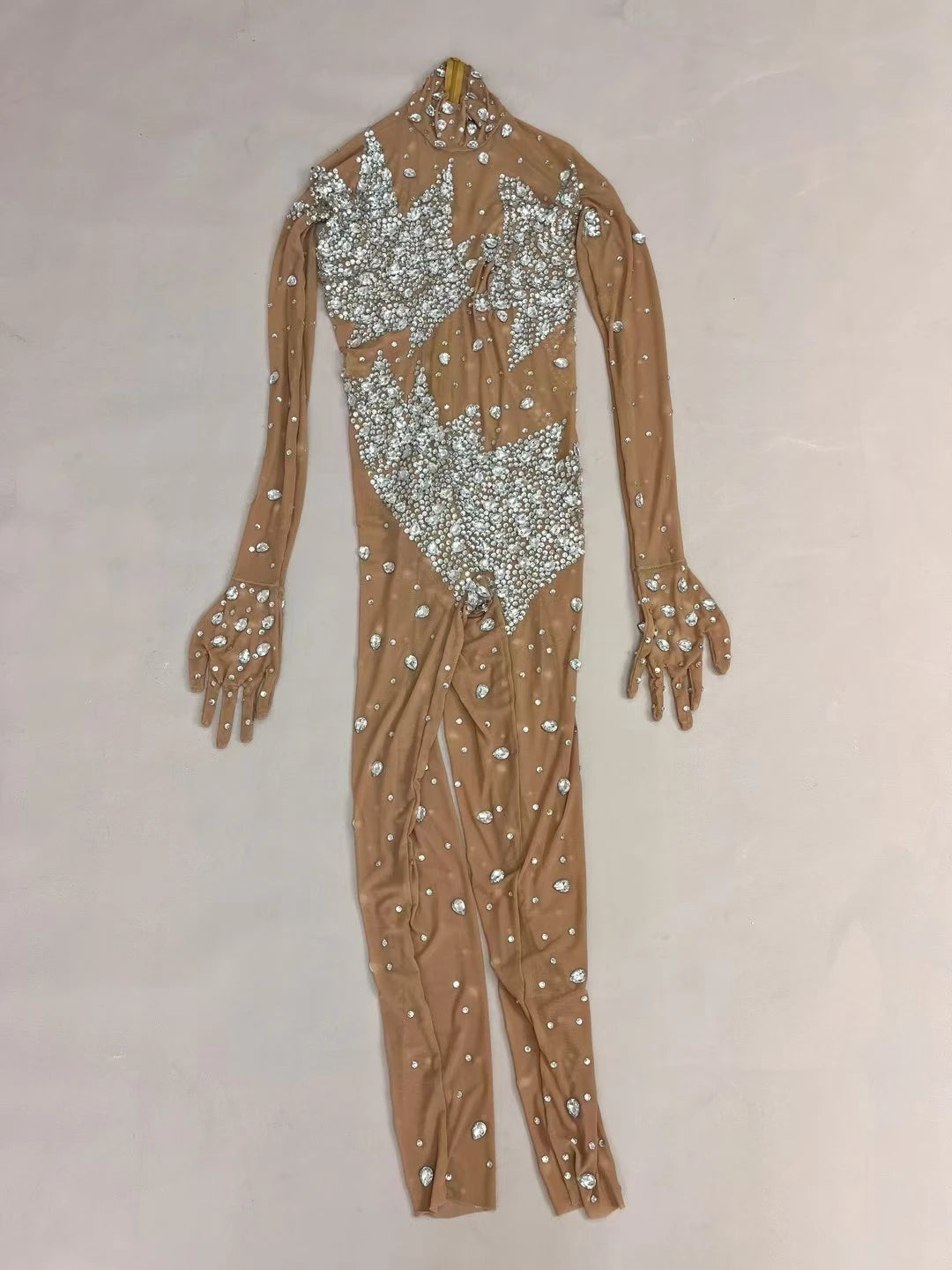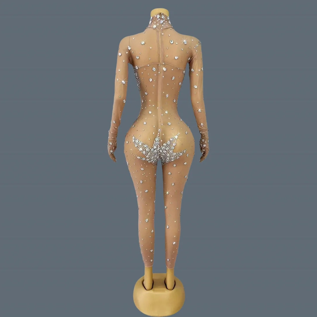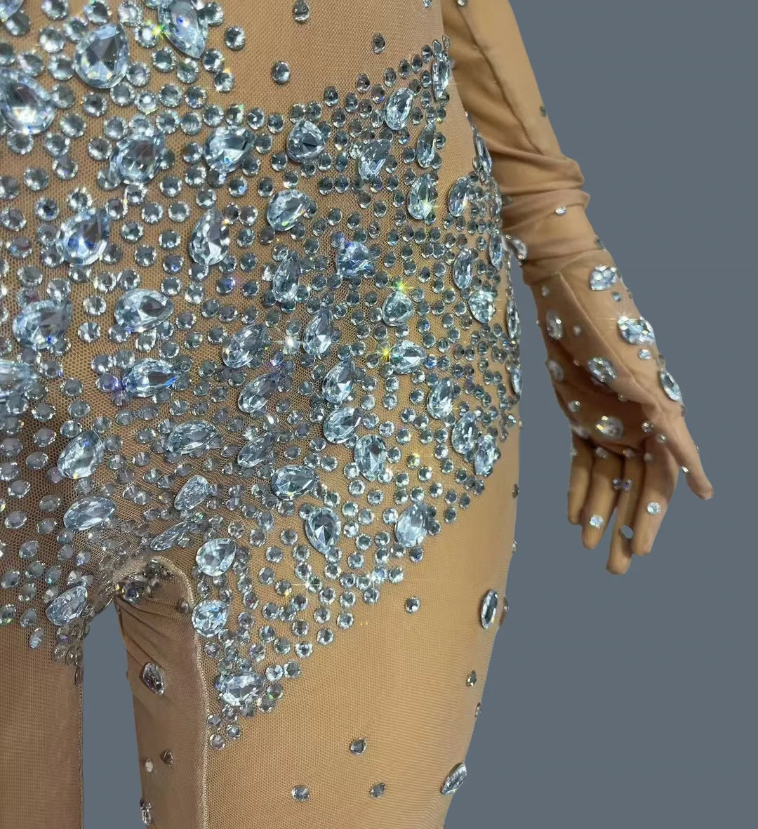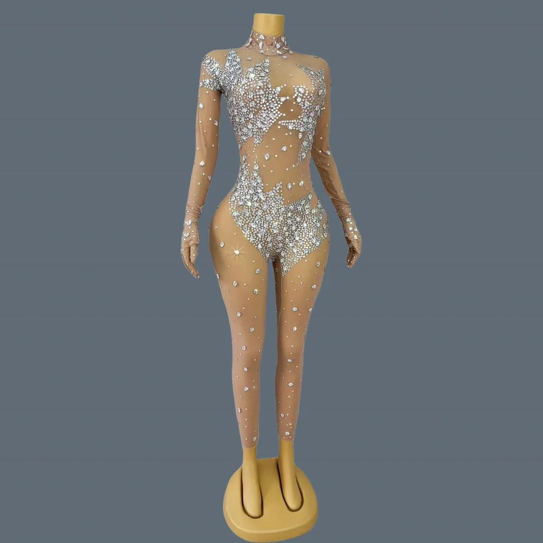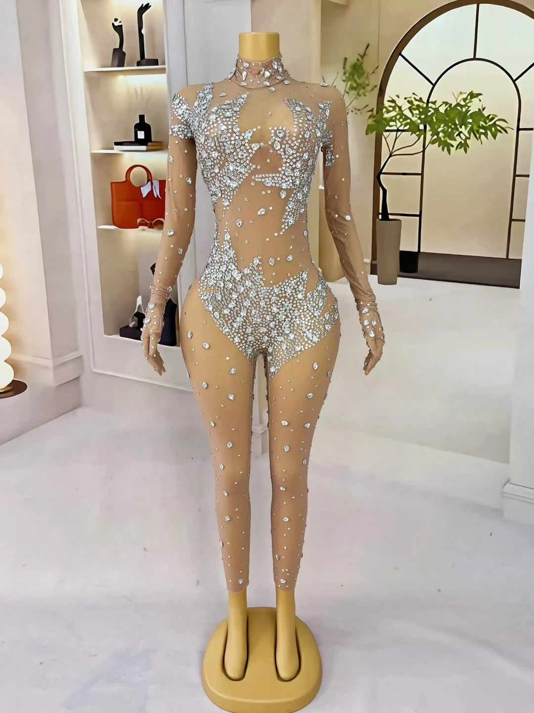 Step into the spotlight with the New See-Through Mesh Jumpsuit, adorned with Sparkly Rhinestone Crystals. This stunning bodycon design features chic leggings that flatter your figure while offering a daring, transparent look. Perfect for birthday parties, club outings, or dance events, this outfit combines glamour and style, ensuring you stand out on any occasion. Shine bright and make an unforgettable impression with this eye-catching dance wear!