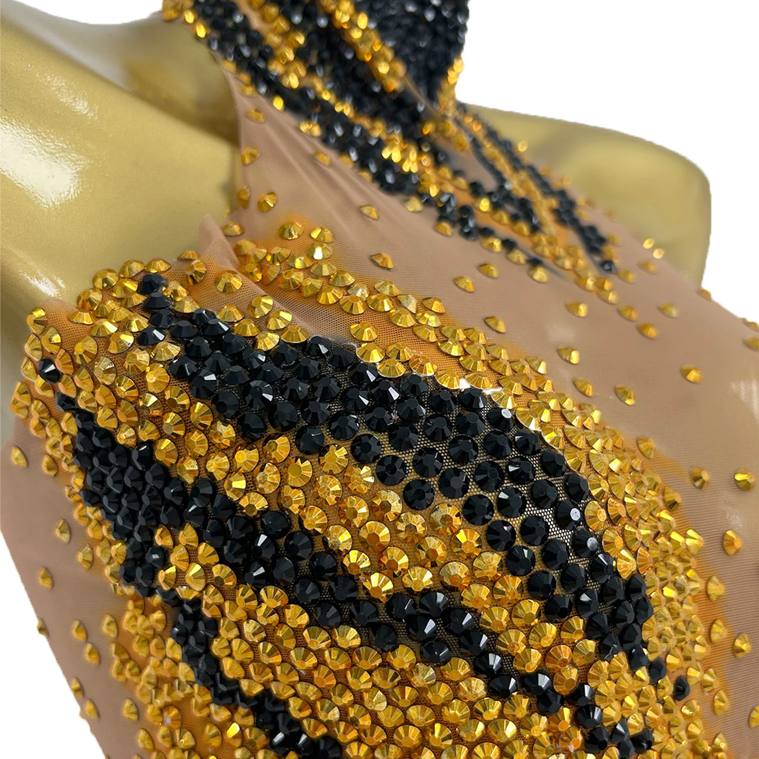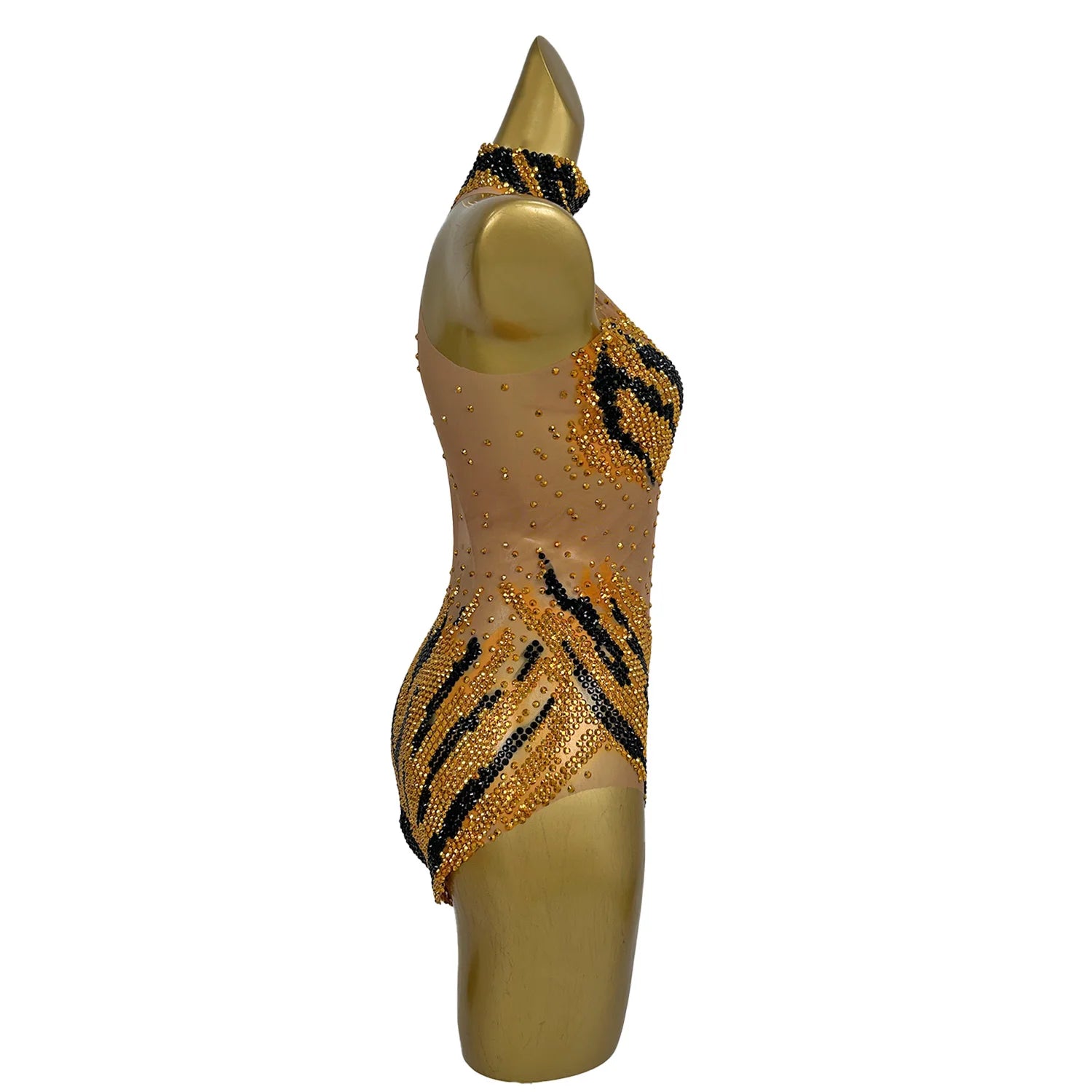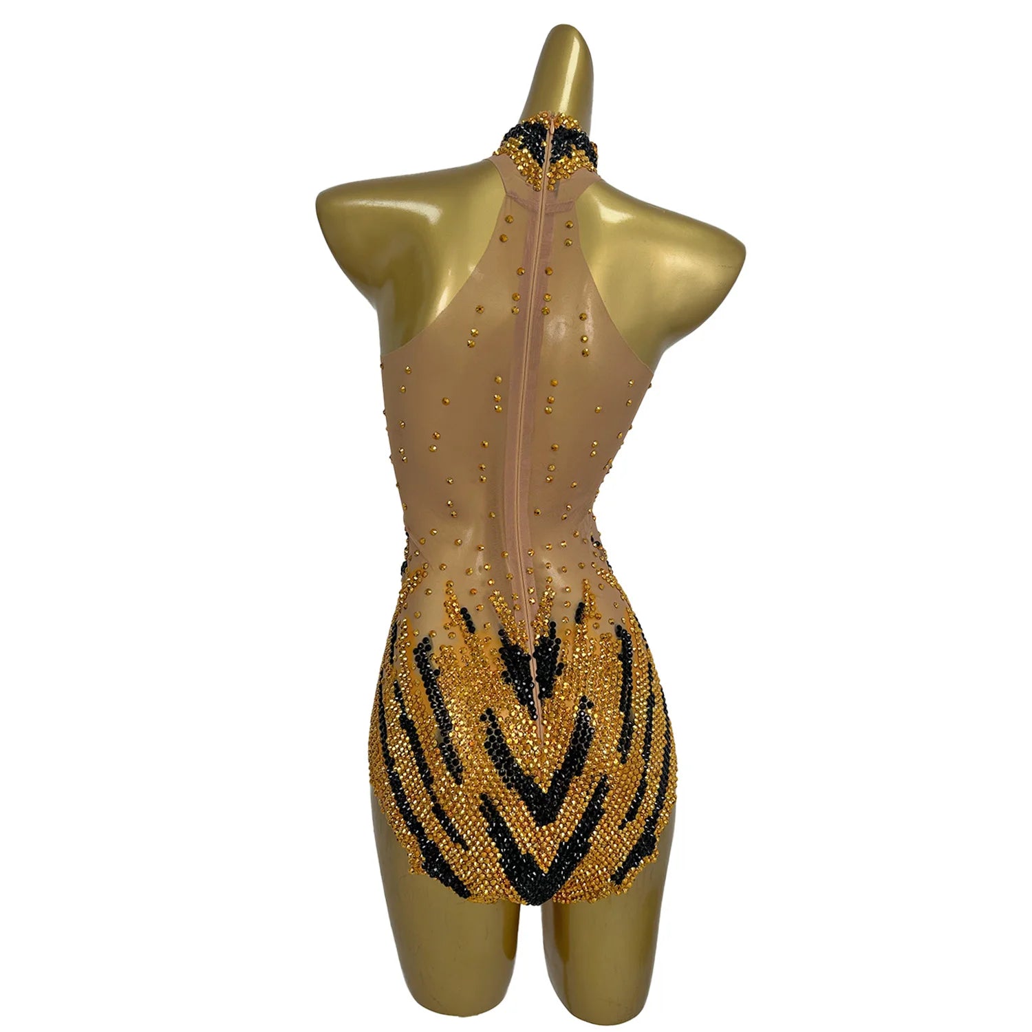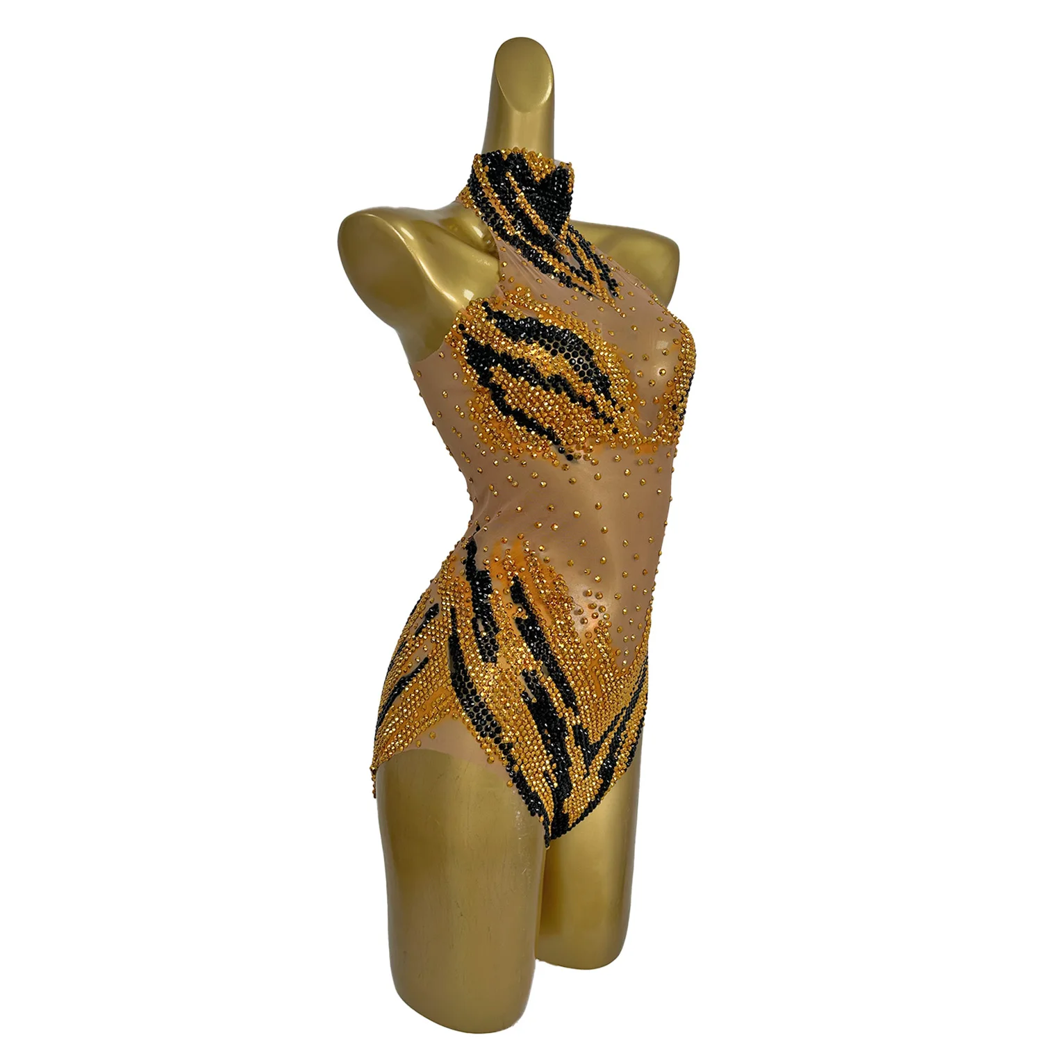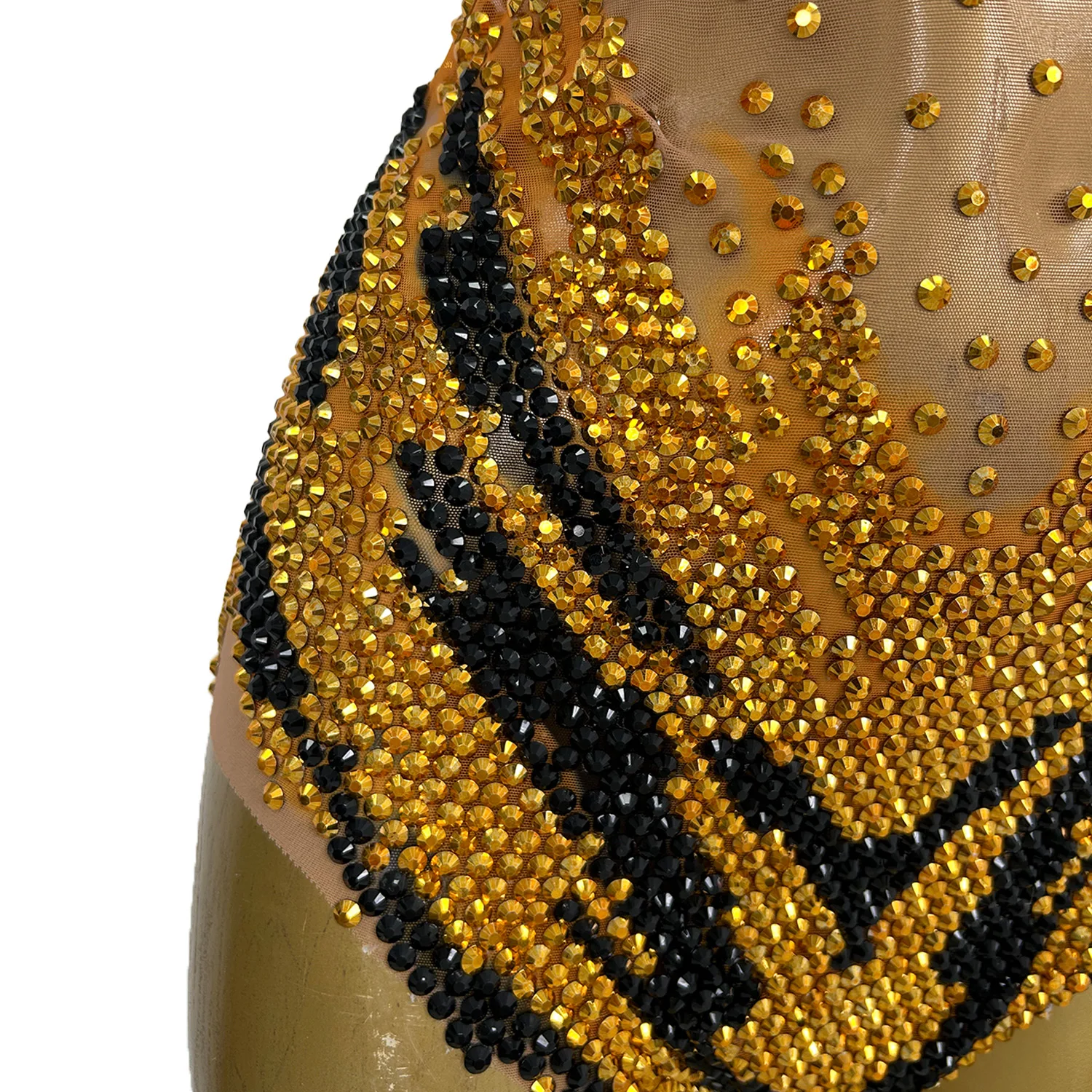 New Stretch Skinny Gold Rhinestone Bodysuit Women Prom Party Club Costumes Pole Dance Stage Outfit Sexy Womens Playsuit Huniu