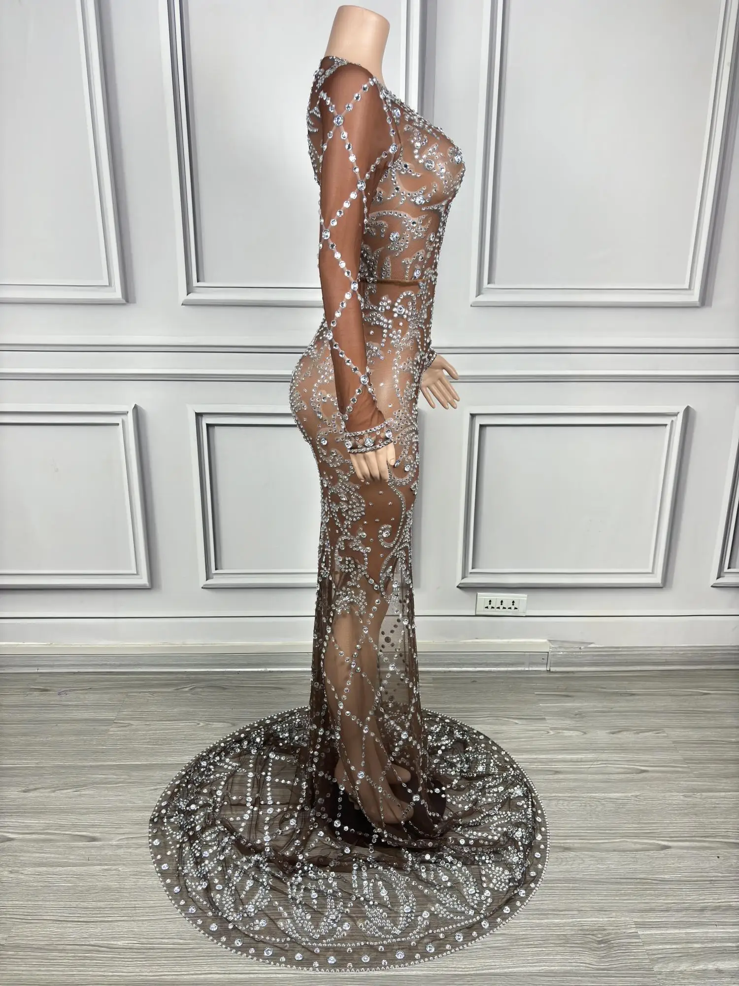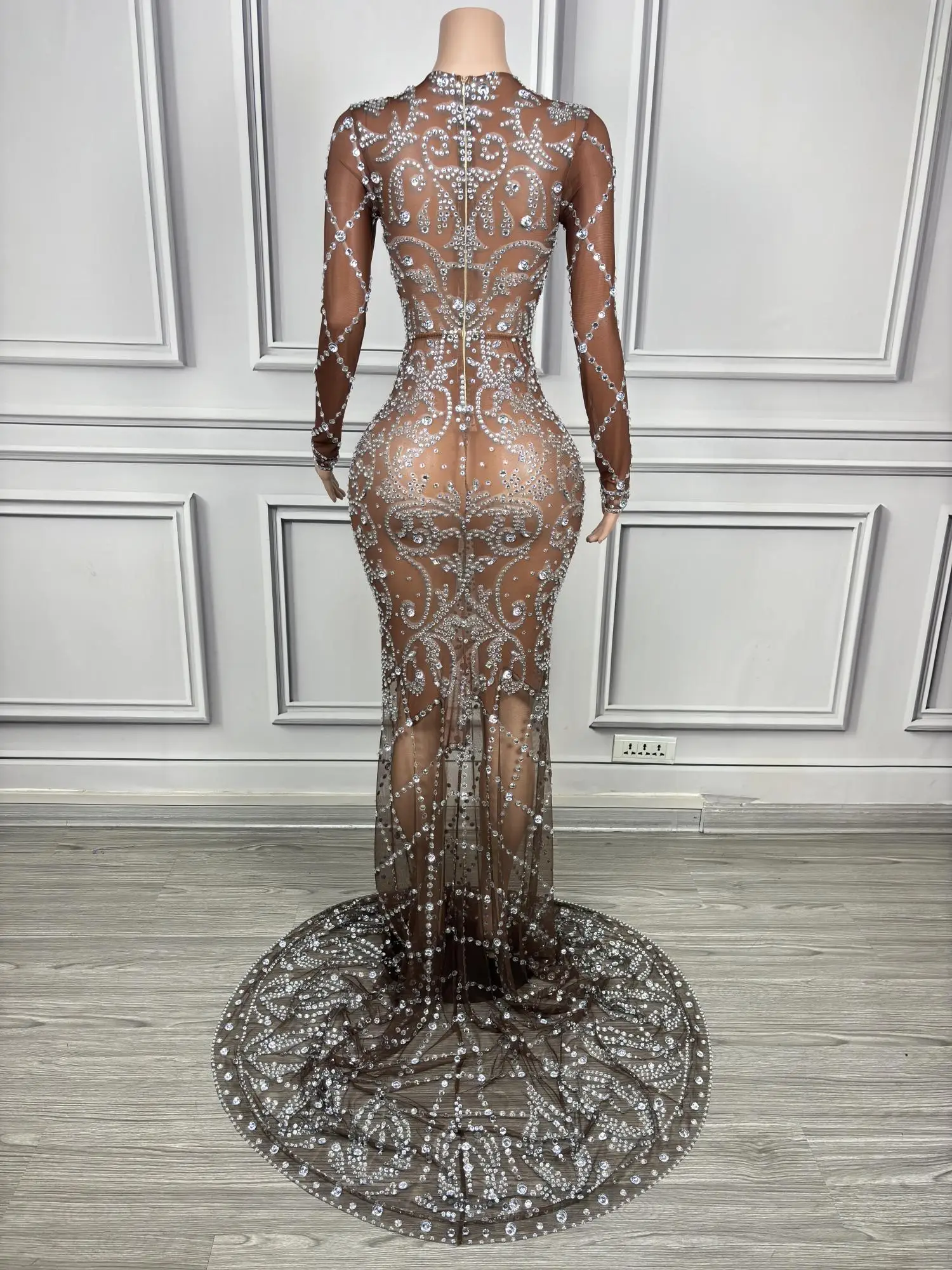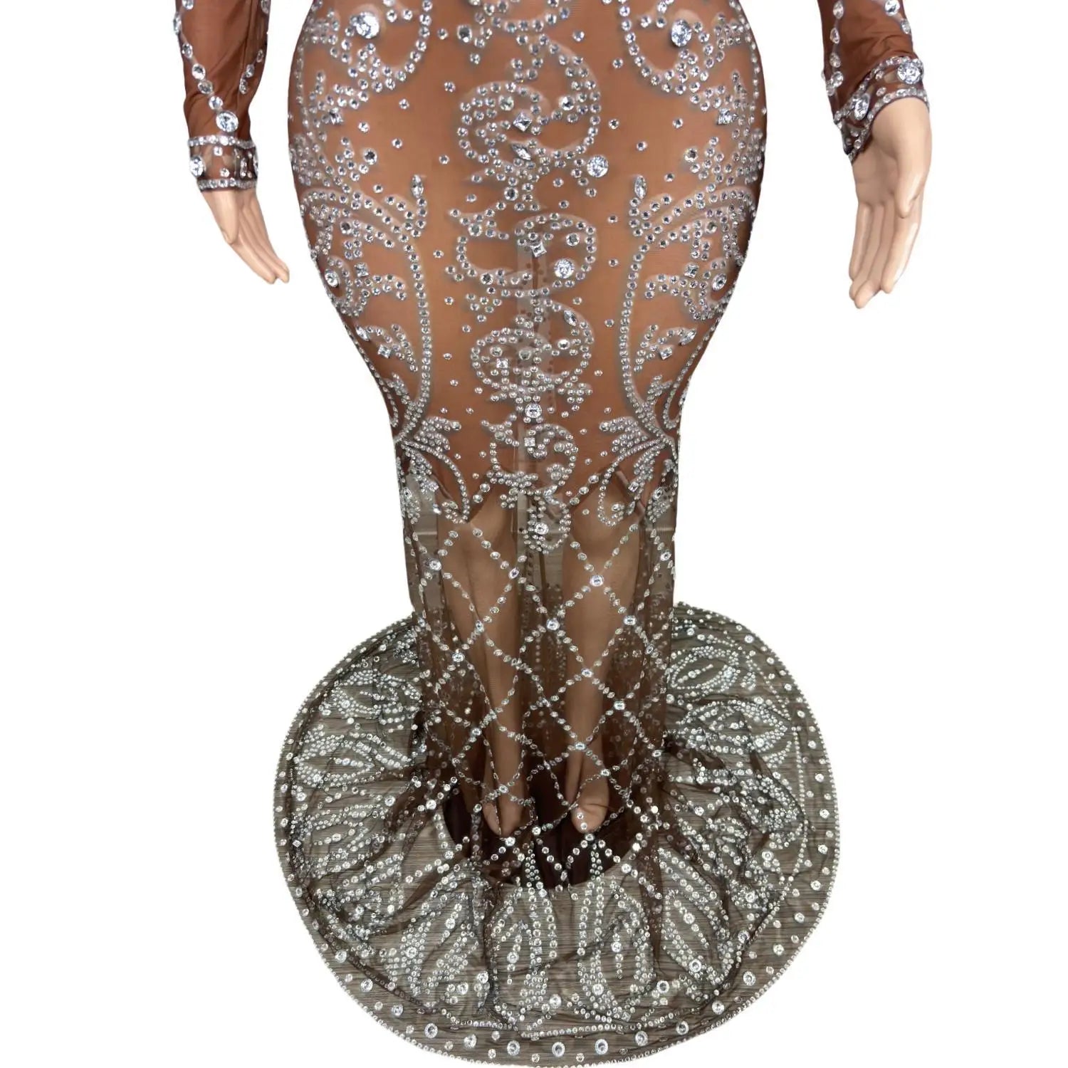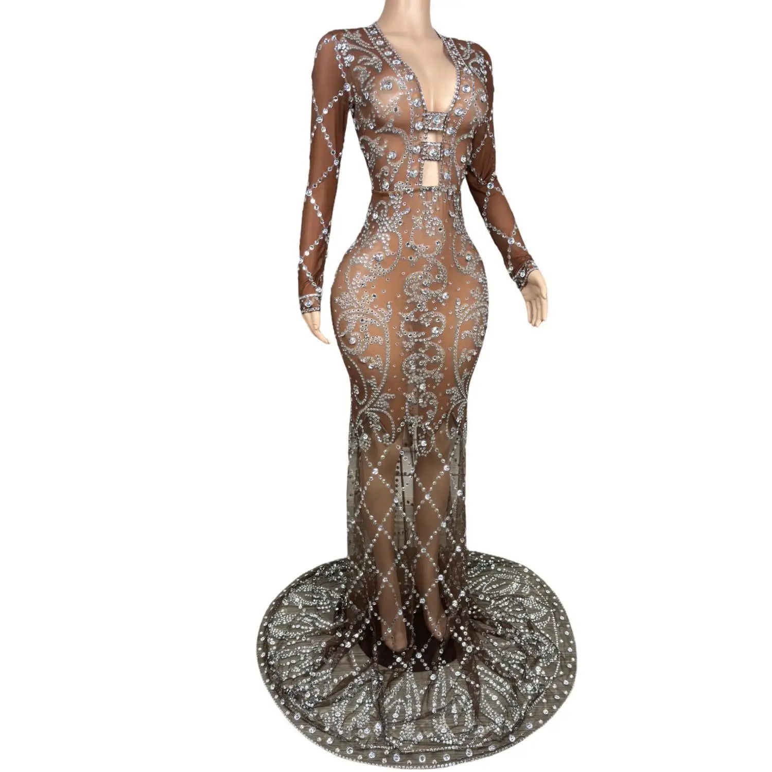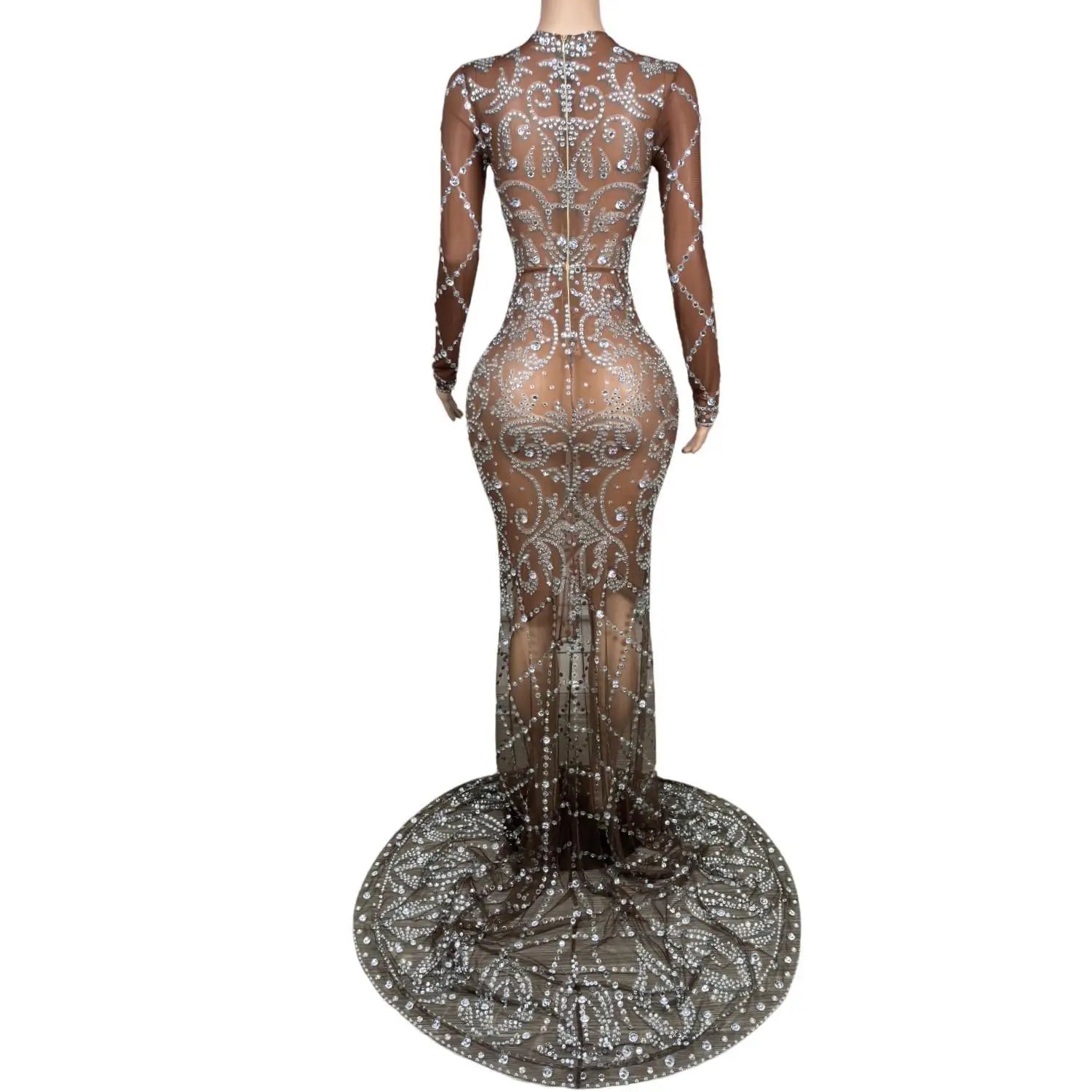 New Style Diamonds Long Tail Dress Evening Bar Women Singer Dancer Dress Birthday Celebrate Prom Gwon Black Grils Dress Suofeiya