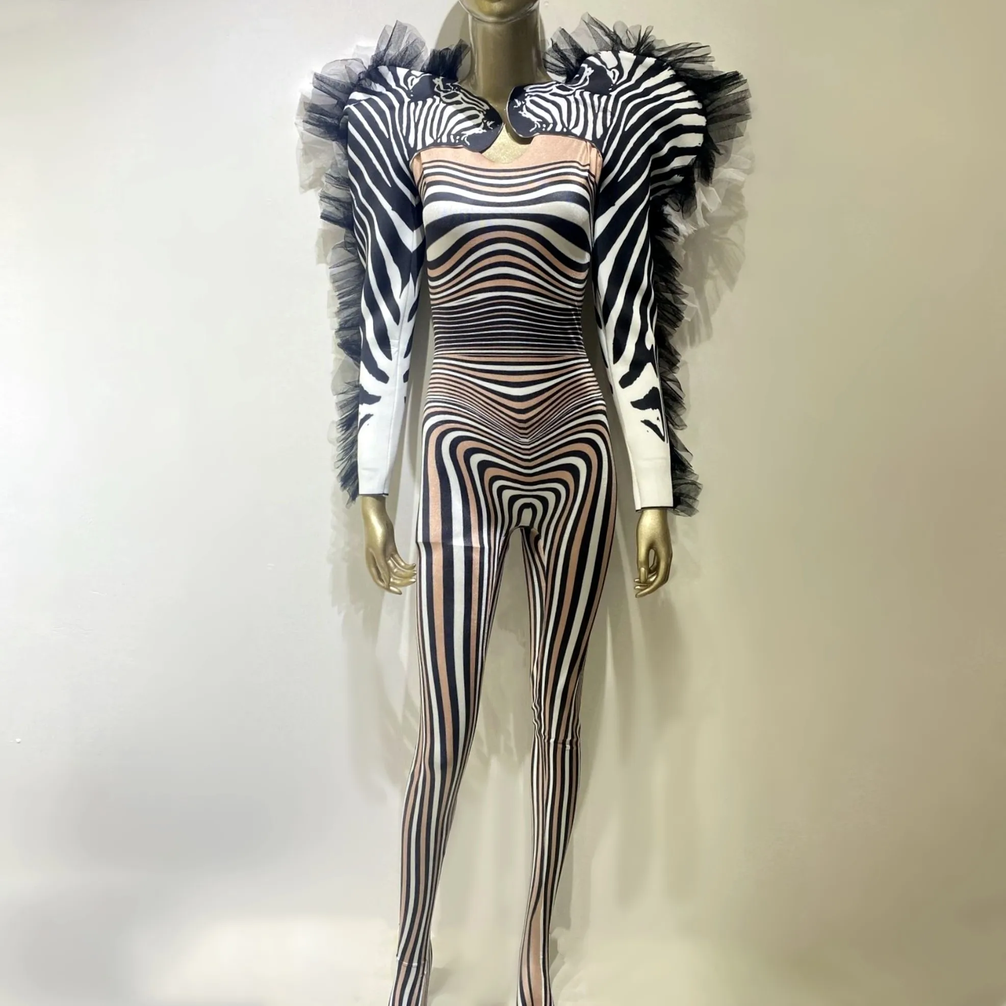 Zebra Pattern Jumpsuit Women Singer Sexy Stage Outfit Bar DS Dance Cosplay Bodysuit Costume Prom Clothes