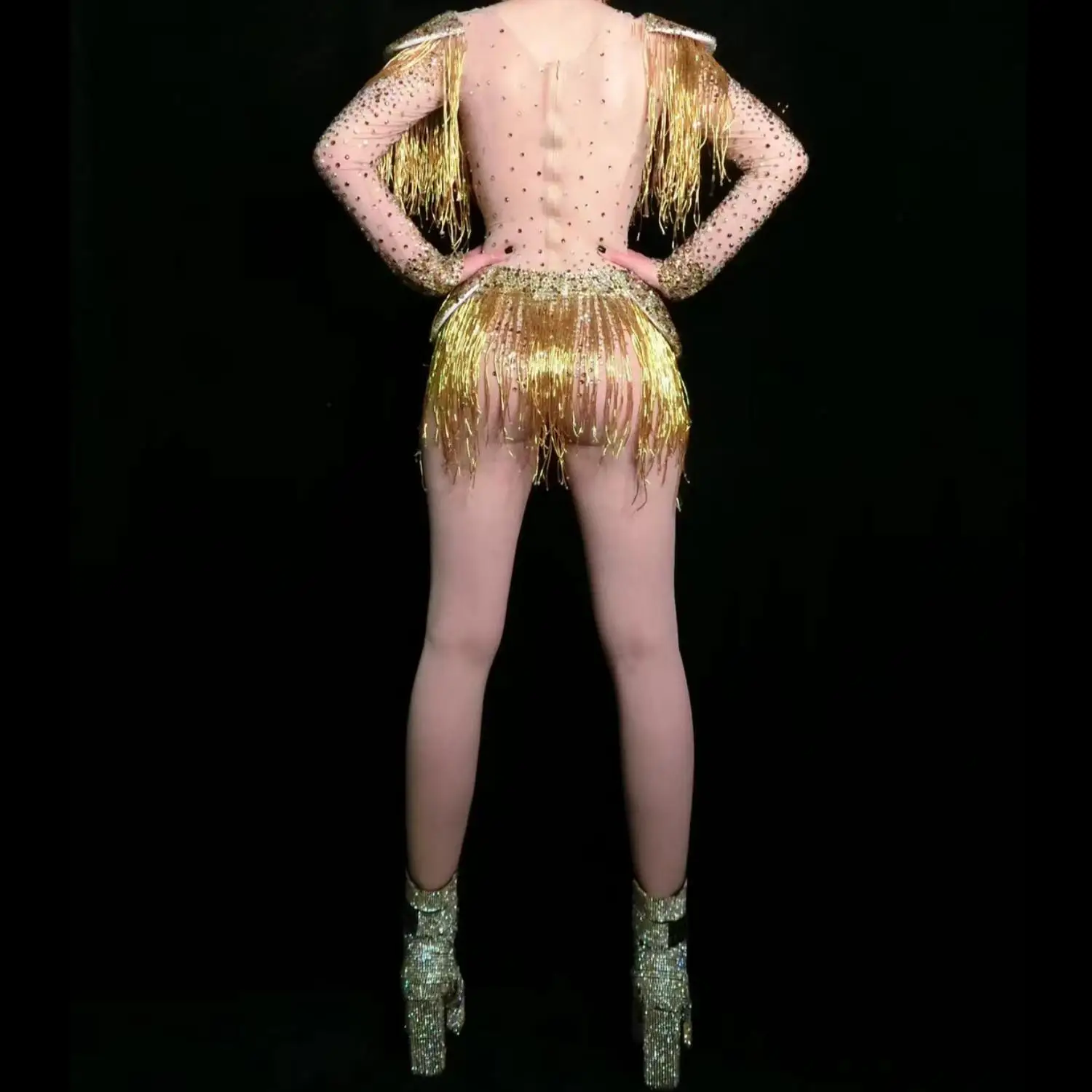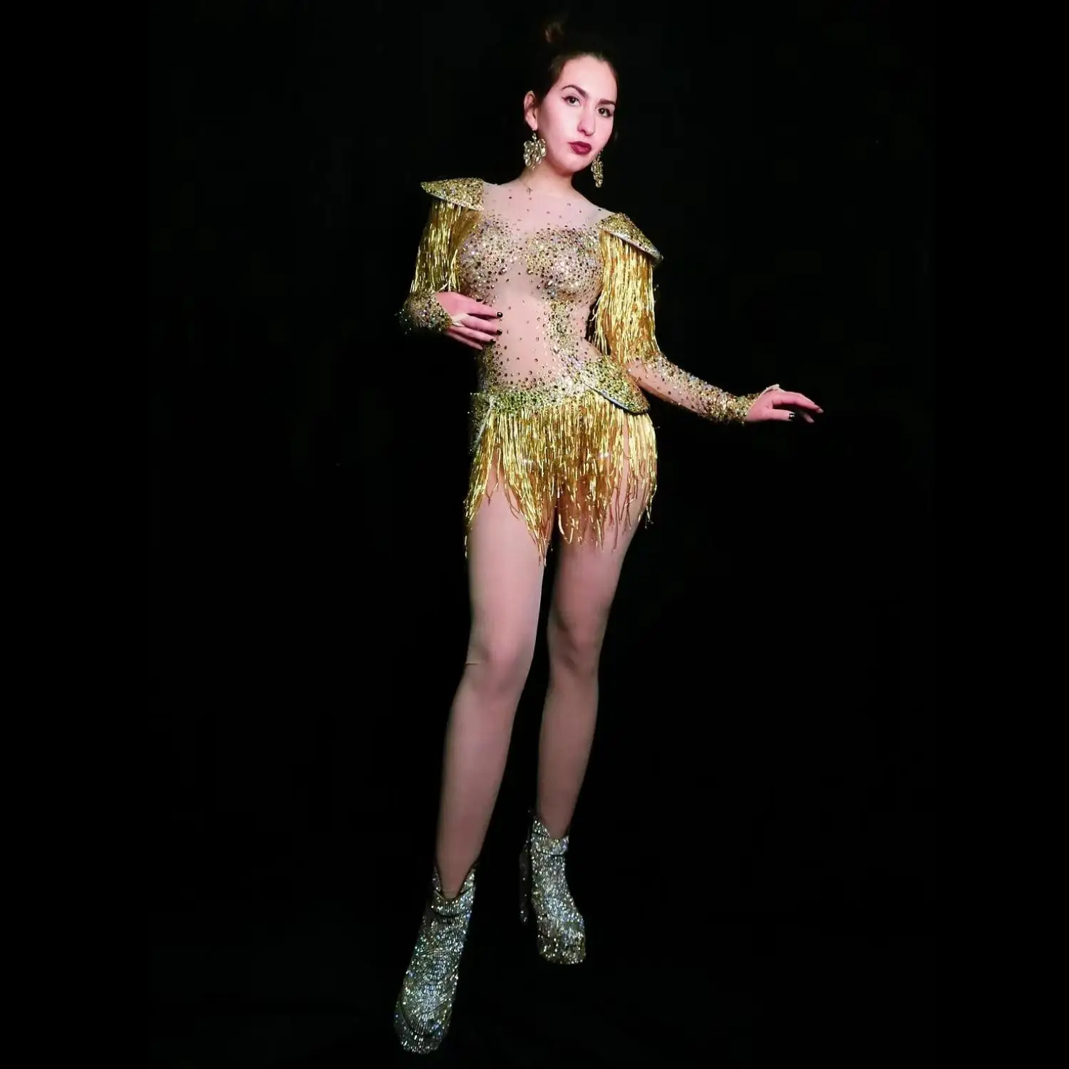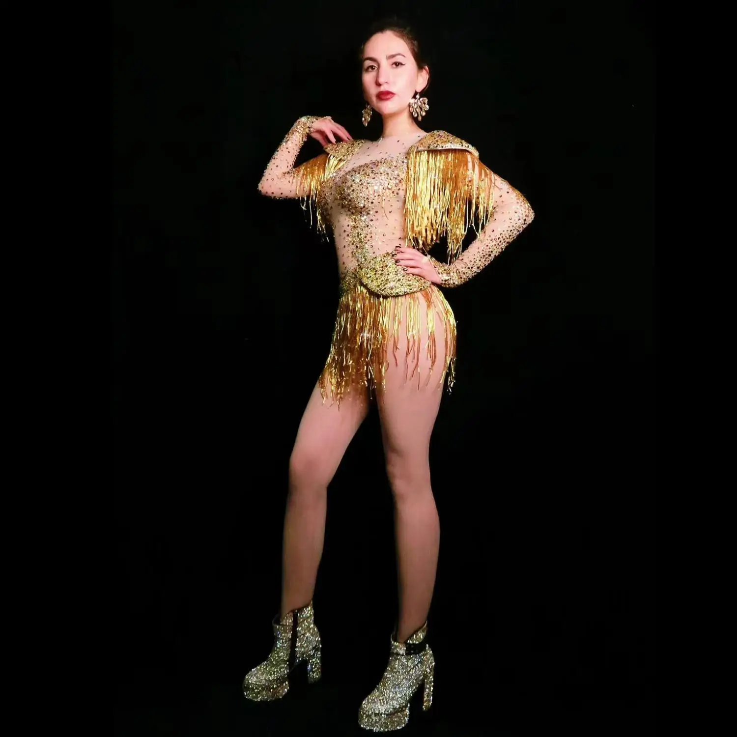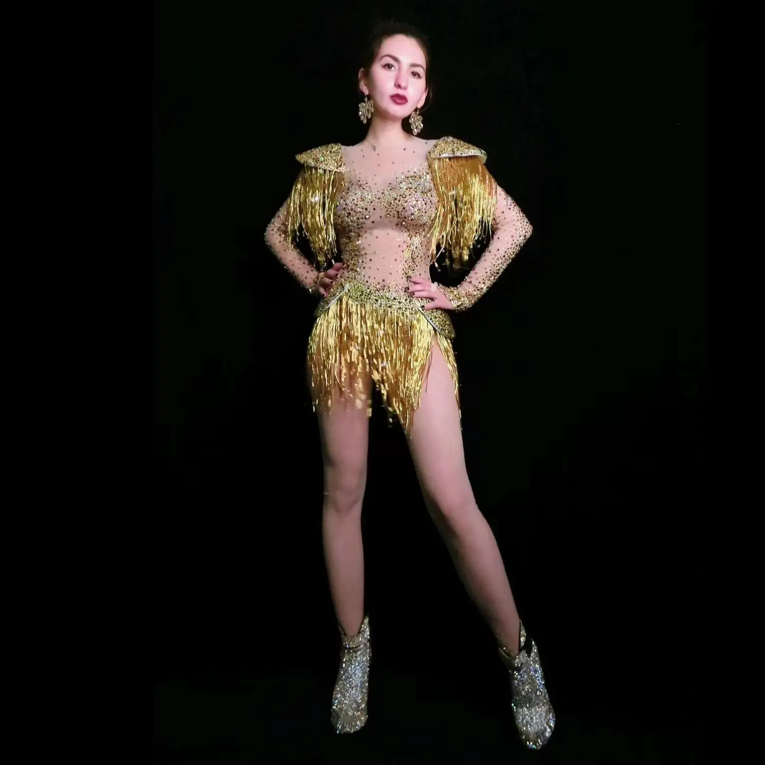 New Women Latin Dance Dress Sparkle Bodycon Latin Dancewear Gold Sequins Tassel Surround Glitter Crystal Dress Jinboli