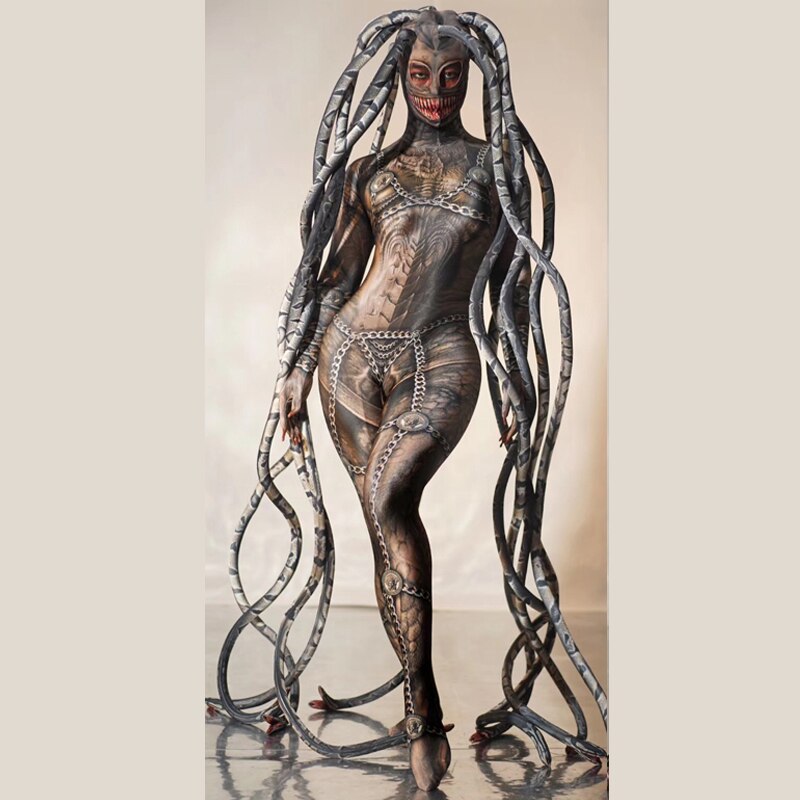 Nightclub Bar Dj Ds Costumes Halloween Cosplay Party Fake Meat Print Stretch Long Jumpsuit Costumes For Men And Women