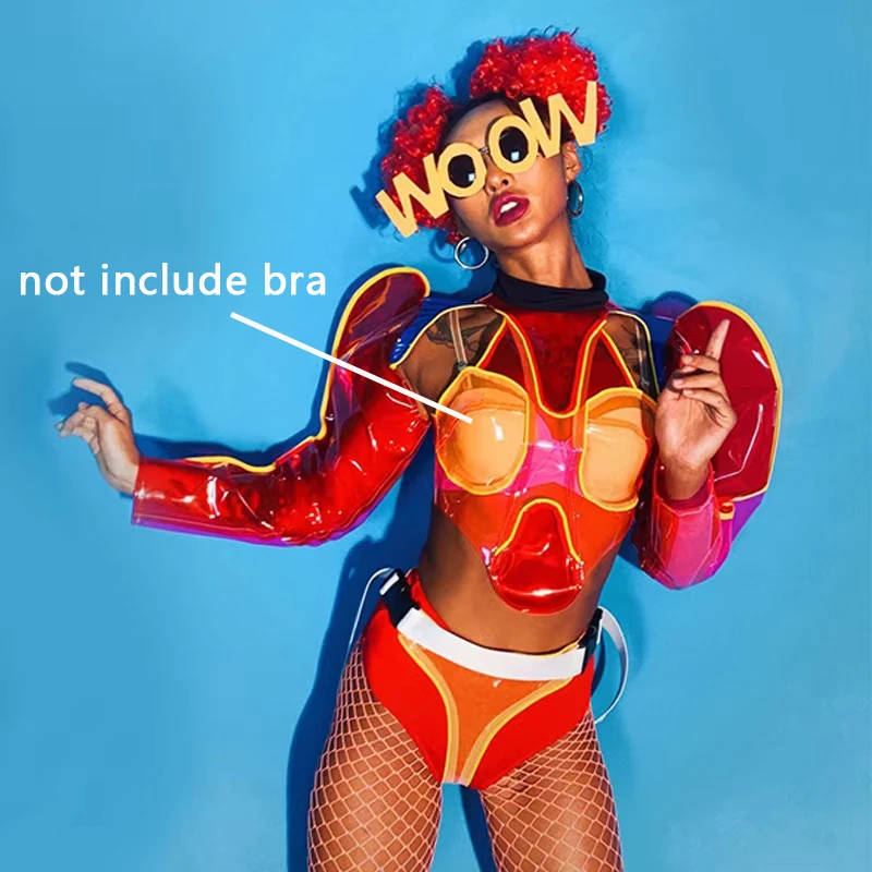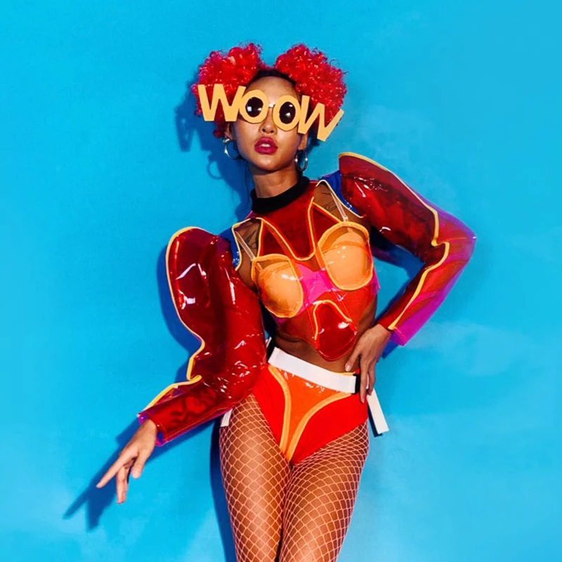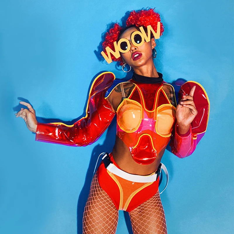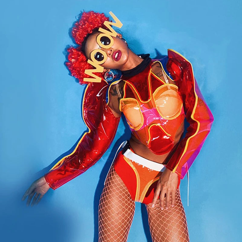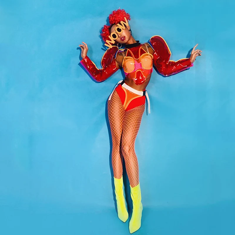 Nightclub Gogo Dance Costume Red Transparent Clown Rave Outfit Pole Dance Clothing Festival Clothing Jazz Dancewear