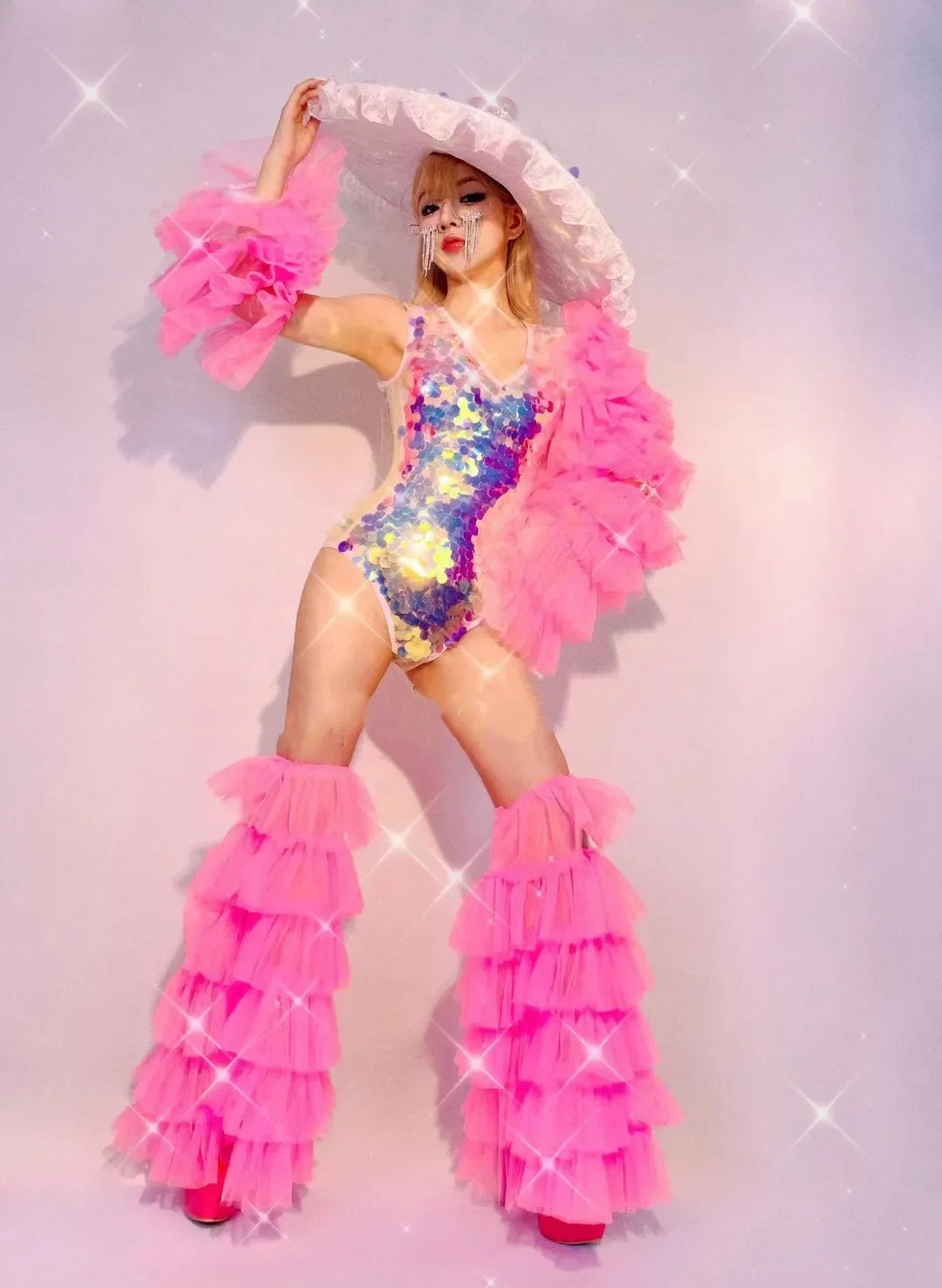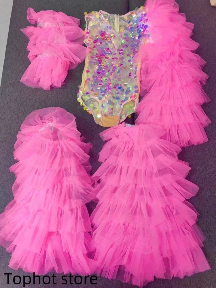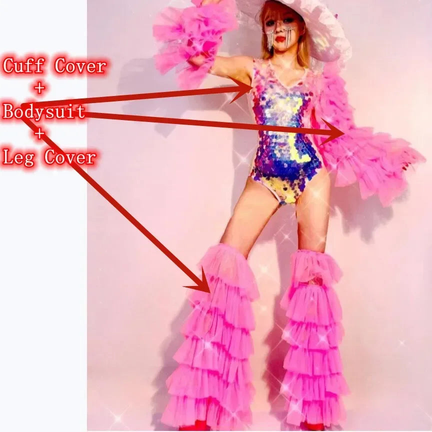 Make a bold statement with this dazzling nightclub gogo performance stage wear, featuring shiny scale sequins that catch the light and turn heads. The eye-catching pink bodysuit is complemented by flowy gauze leg covers, providing both comfort and flair. Perfect for raves, bar dances, or drag queen performances, this outfit is designed for those who love to shine on stage. Embrace your inner superstar and take your performance to the next level with this stunning costume!