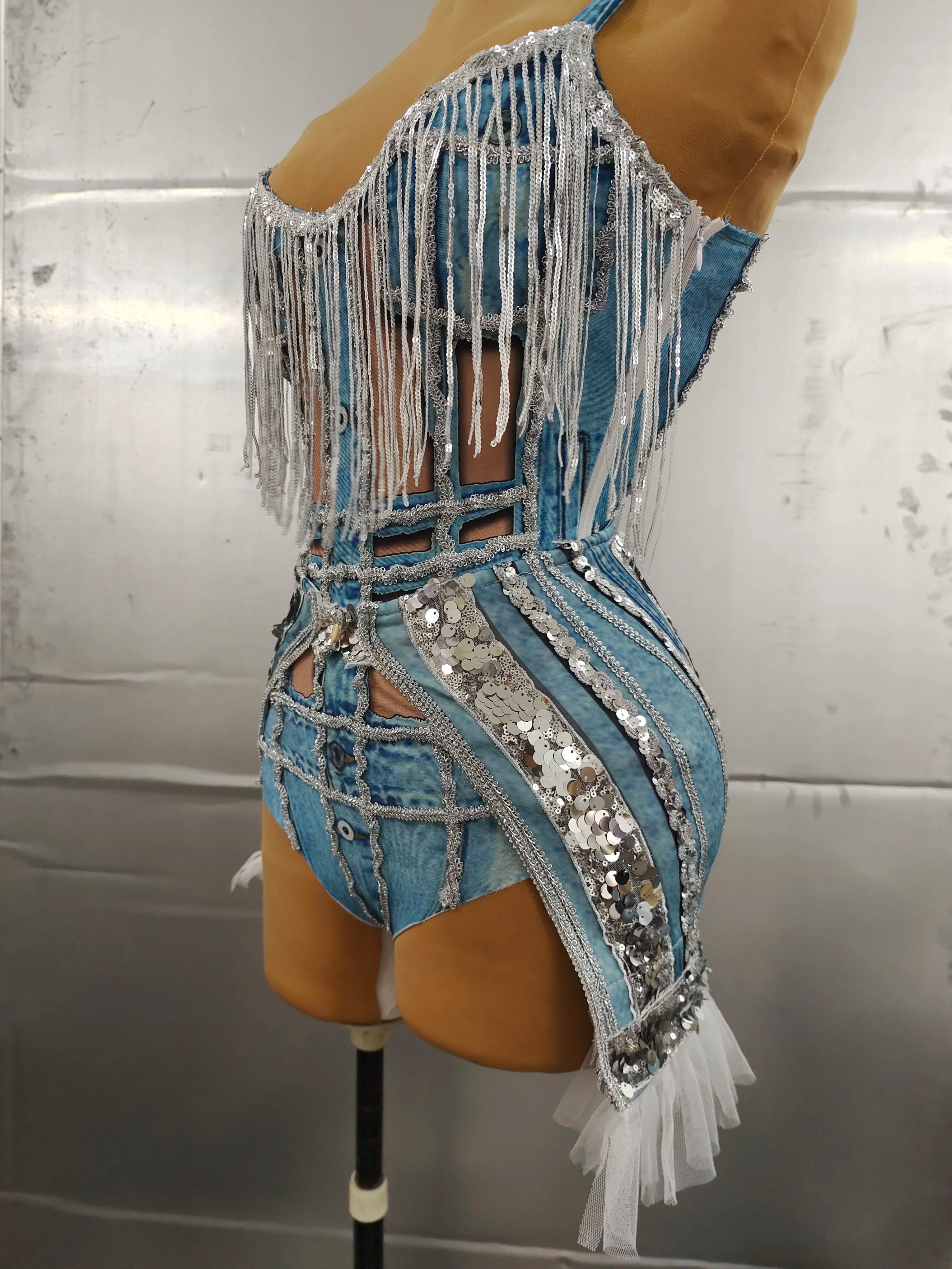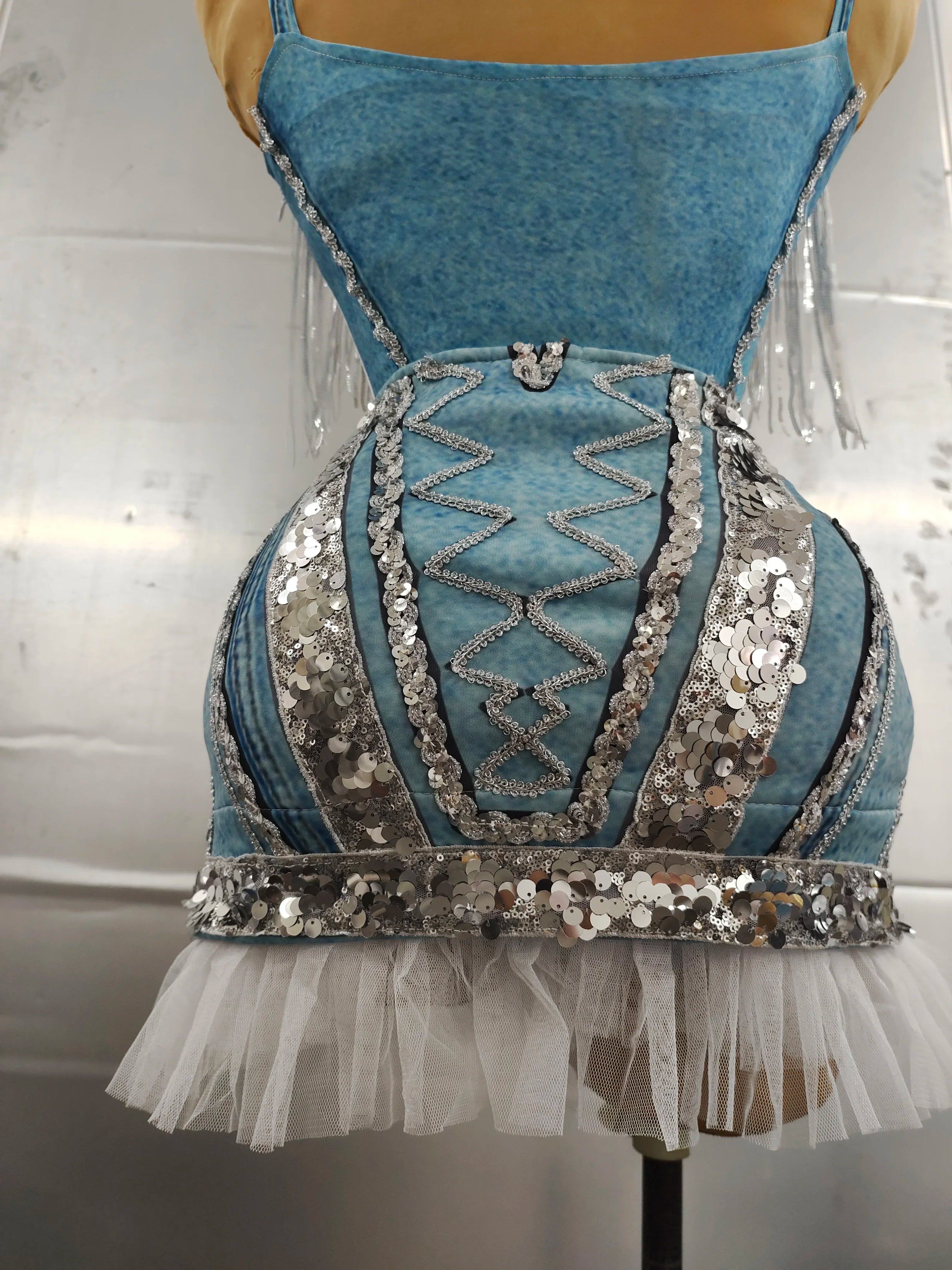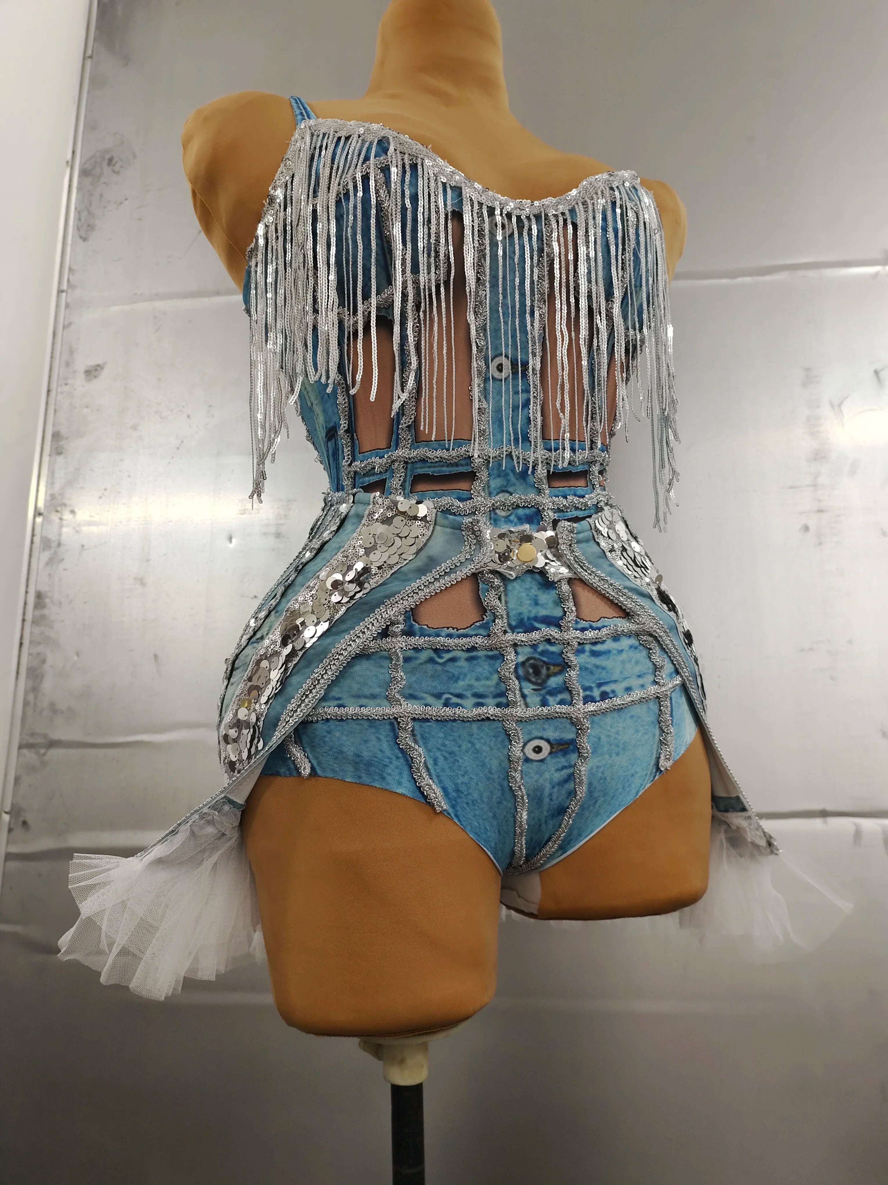 Get ready to steal the spotlight with our?Nightclub Party Pole Dancing Costume. This stylish faux denim bodysuit and skirt set is designed for maximum impact, making it the perfect outfit for DJs, gogo dancers, and bar performers. Its sexy silhouette ensures you look stunning on stage, while the comfortable fabric allows for ease of movement during your performances. Ideal for singers and dancers alike, this ensemble will have you turning heads all night long.