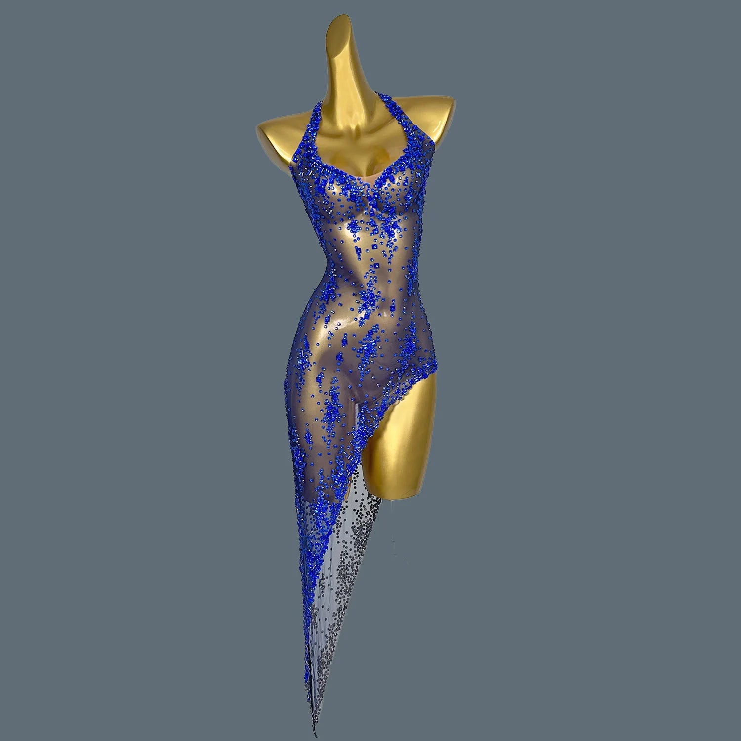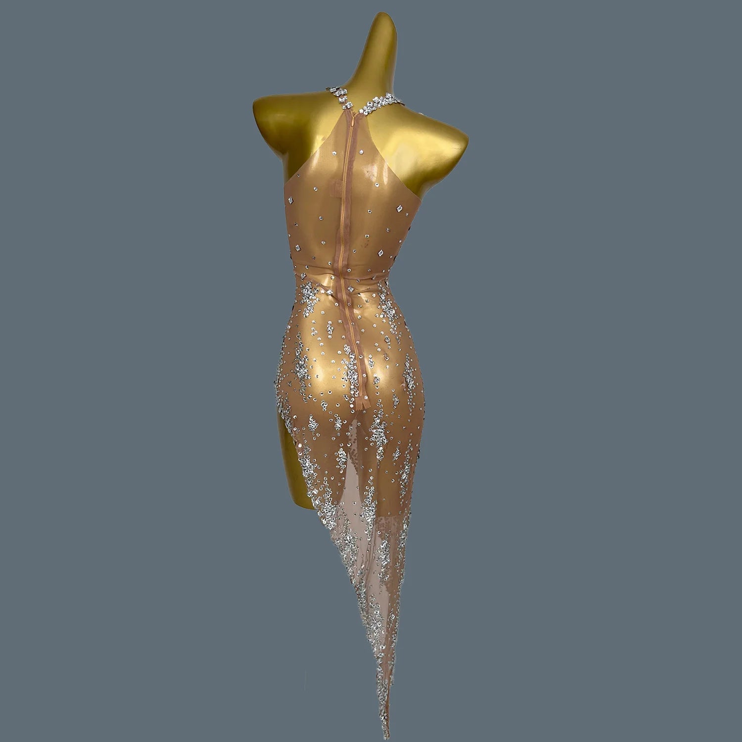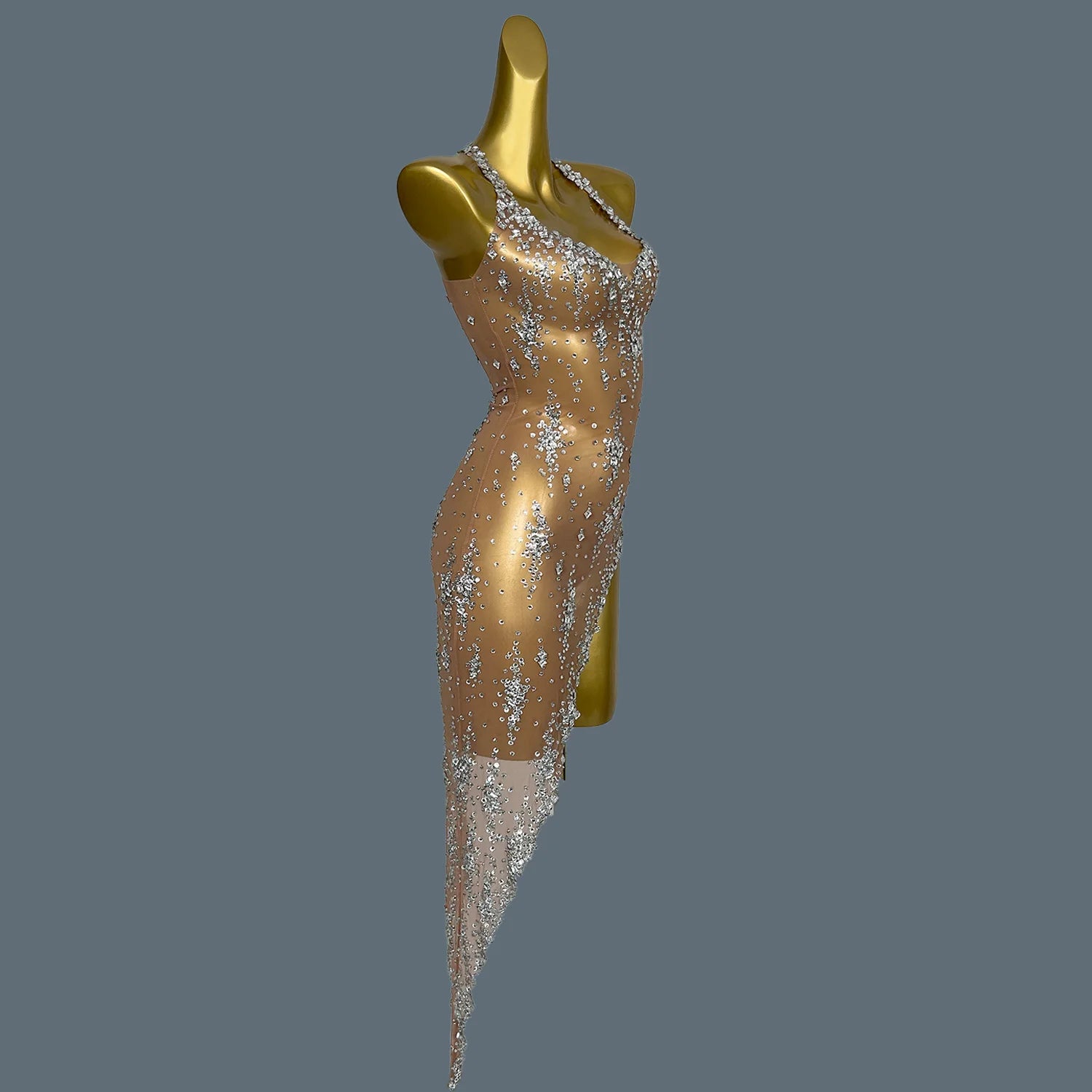 Elevate your stage presence with this stunning nightclub singer costume, perfect for parties and birthday celebrations. This eye-catching outfit features a sleeveless, asymmetric design adorned with sparkling rhinestones that catch the light beautifully. Whether you're performing or dancing the night away, this glamorous dress will ensure you stand out in style.