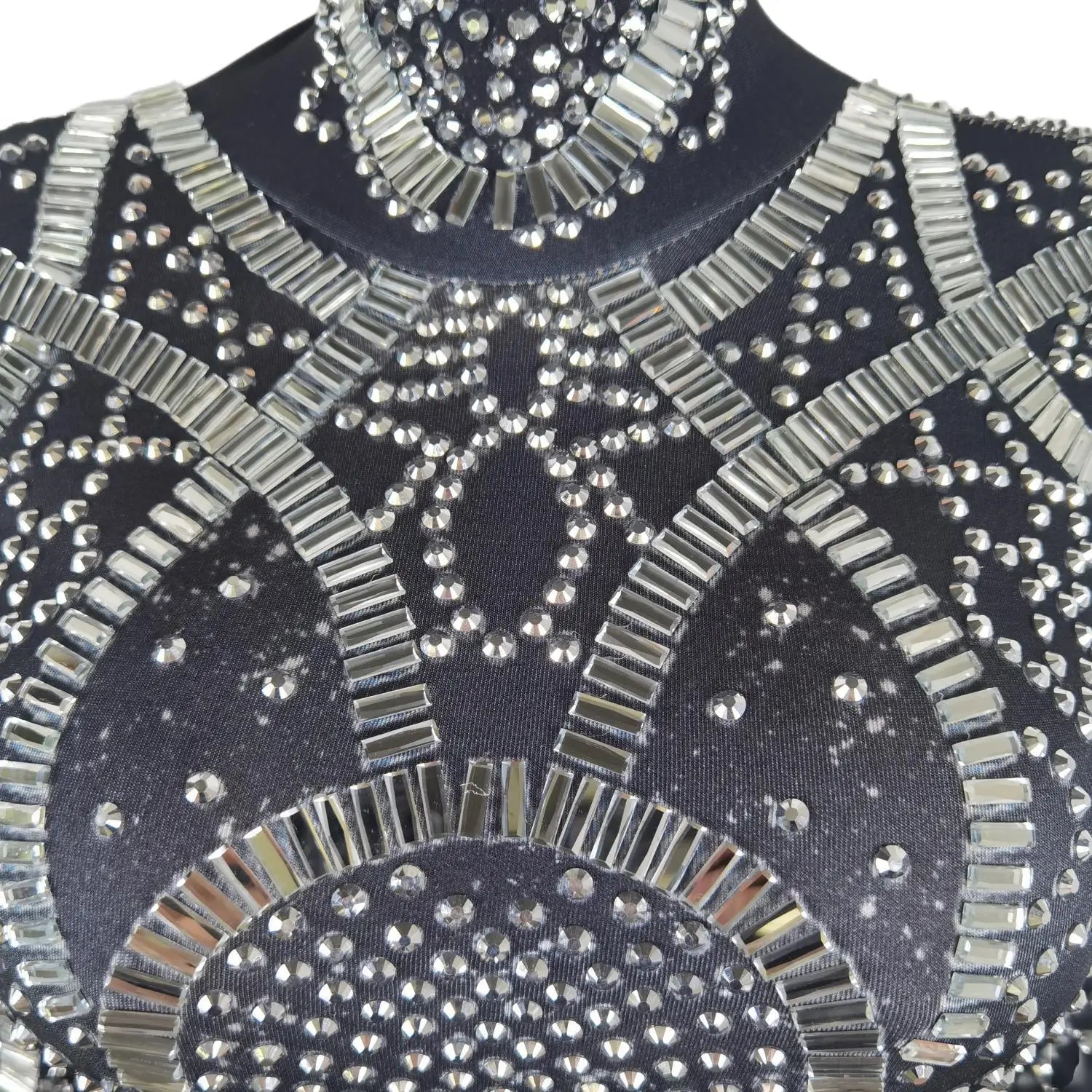 Step into the spotlight with this Nightclub Crystals Elastic Leotard — a silver rhinestone‑embellished, long‑sleeve stretch bodysuit designed for DJs, singers, dancers, and performance teams who need high‑impact sparkle and stage‑ready functionality.
