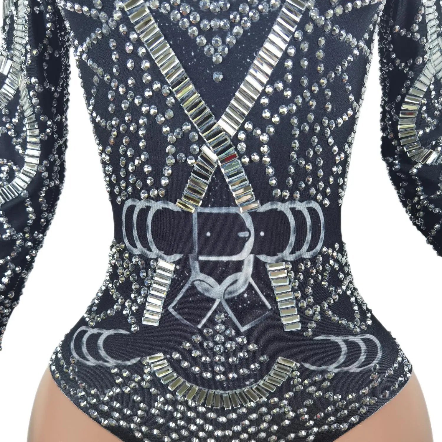 Nightclub Women Crystals Elastic Leotard Silver Rhinestones Long Sleeve Bodysuit Bar DJ Singer Jazz Dance Team Costume