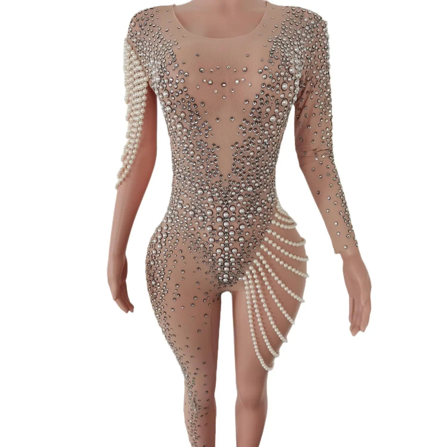 Nude Stretch Party Jumpsuit Rhinestones Fashion Acrobatics Costumes Pearls Nightclub Pole Dance Clothing Elastics Women Jumpsuit