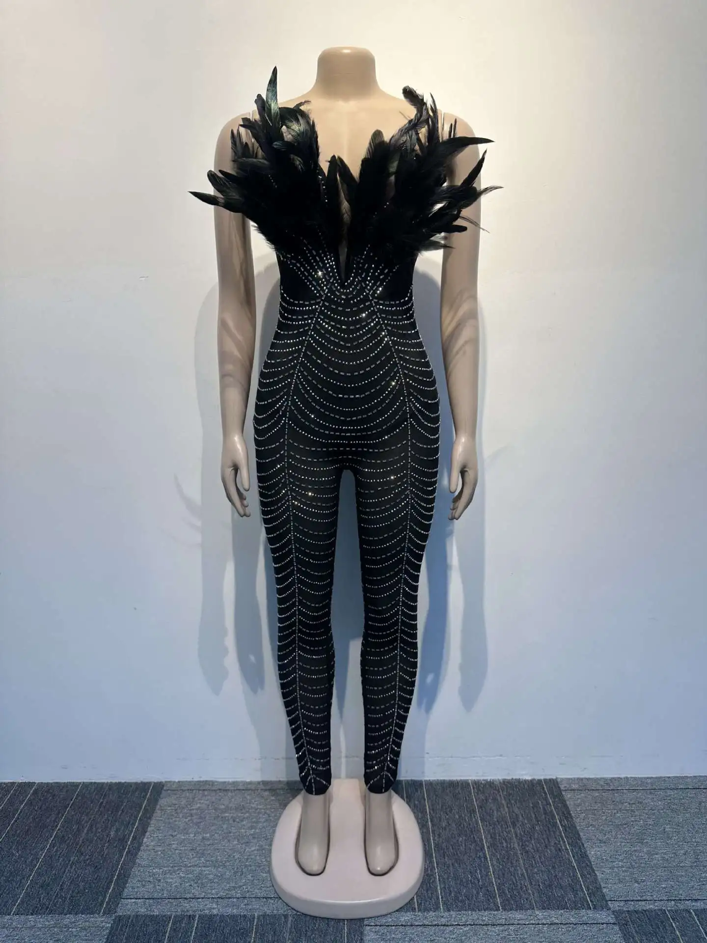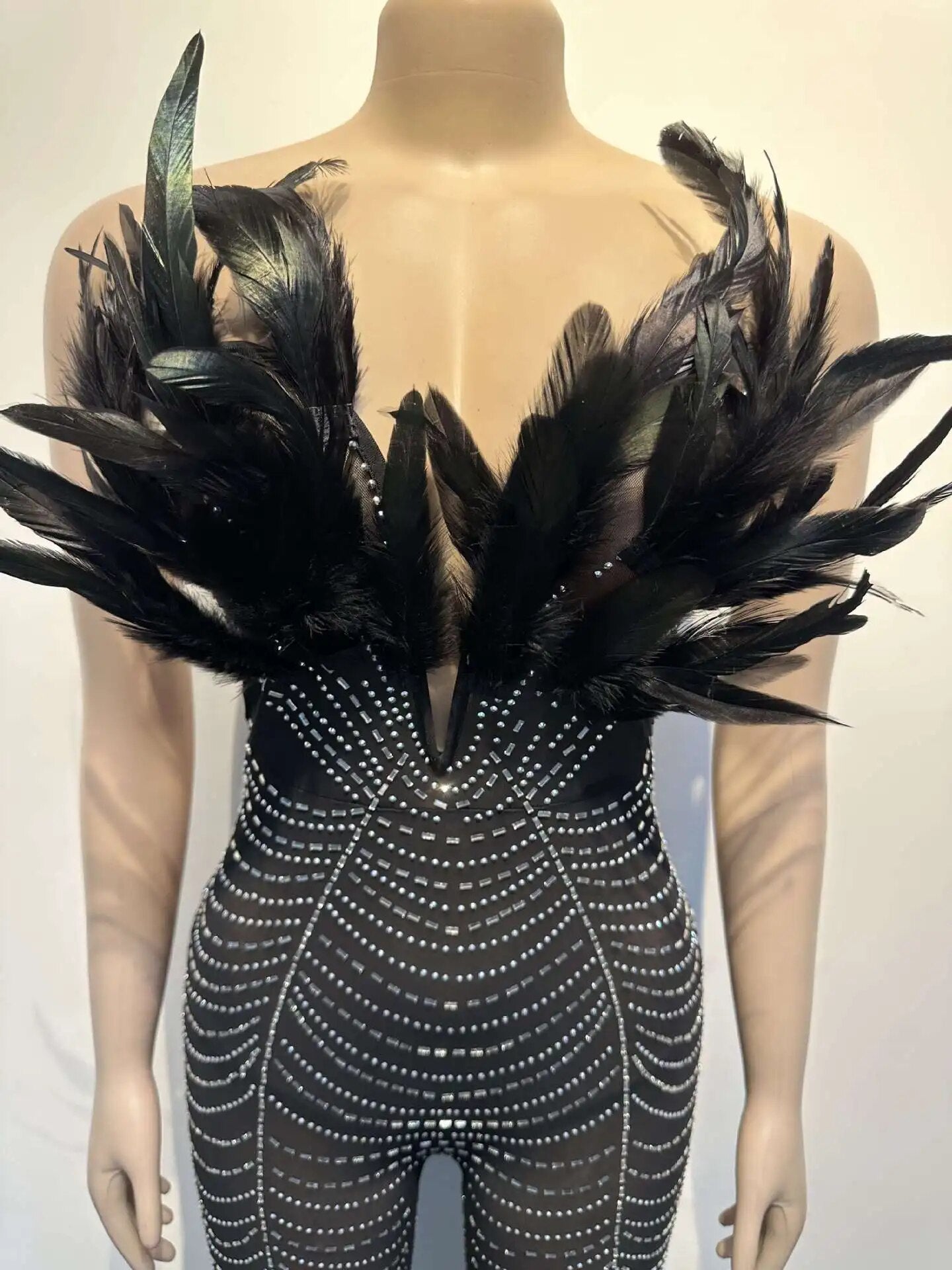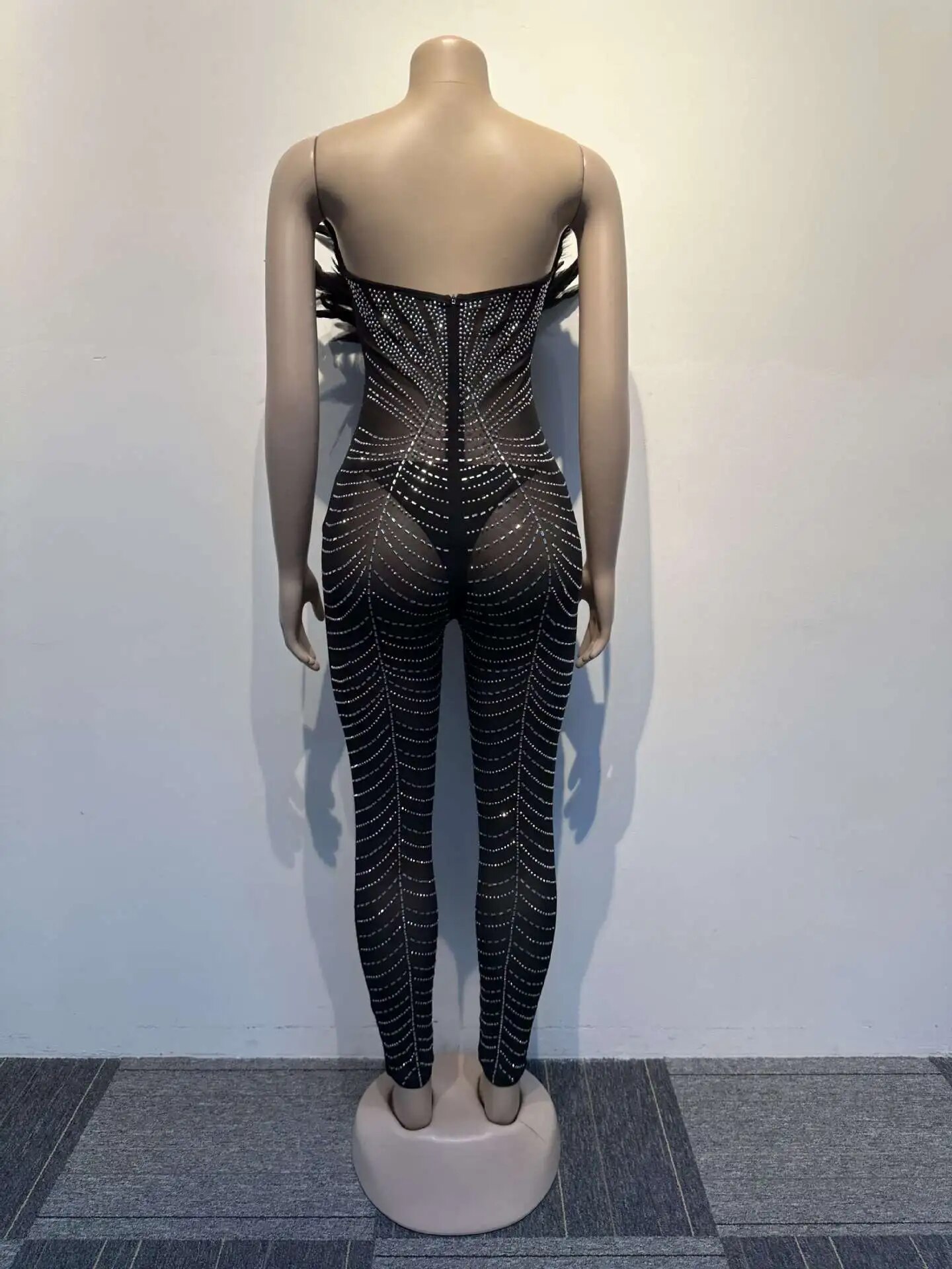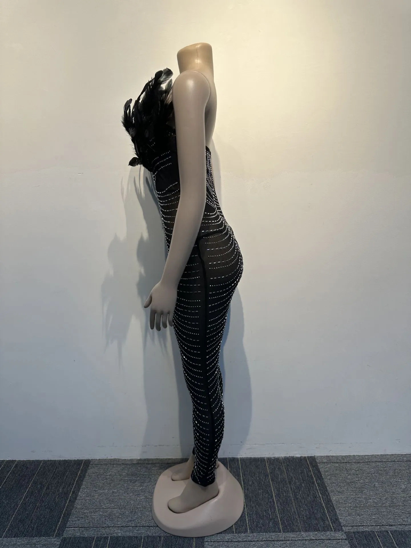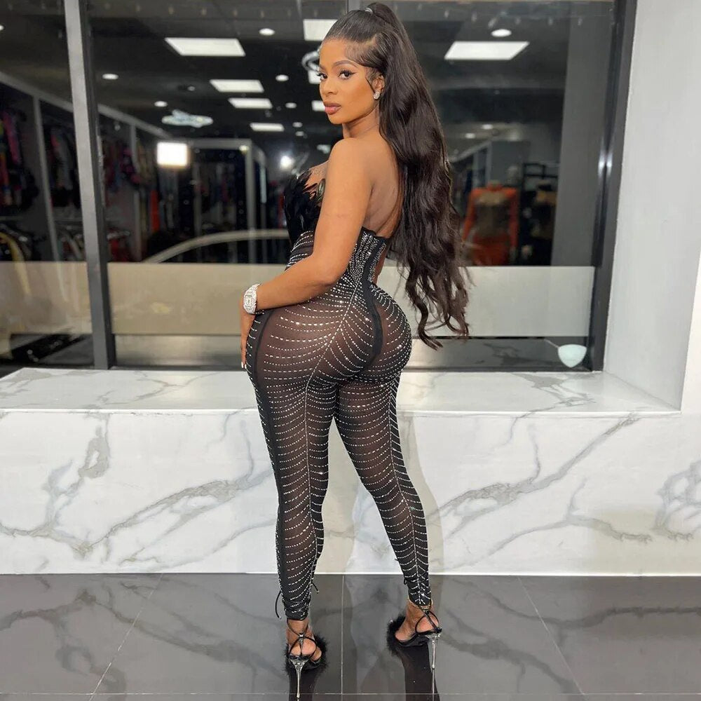 Off The Shoulder Mesh Rhinestone Beaded Feather Prom Corset Jumpsuit See Through Night Club Evening Wedding Party Sexy Jumpsuits