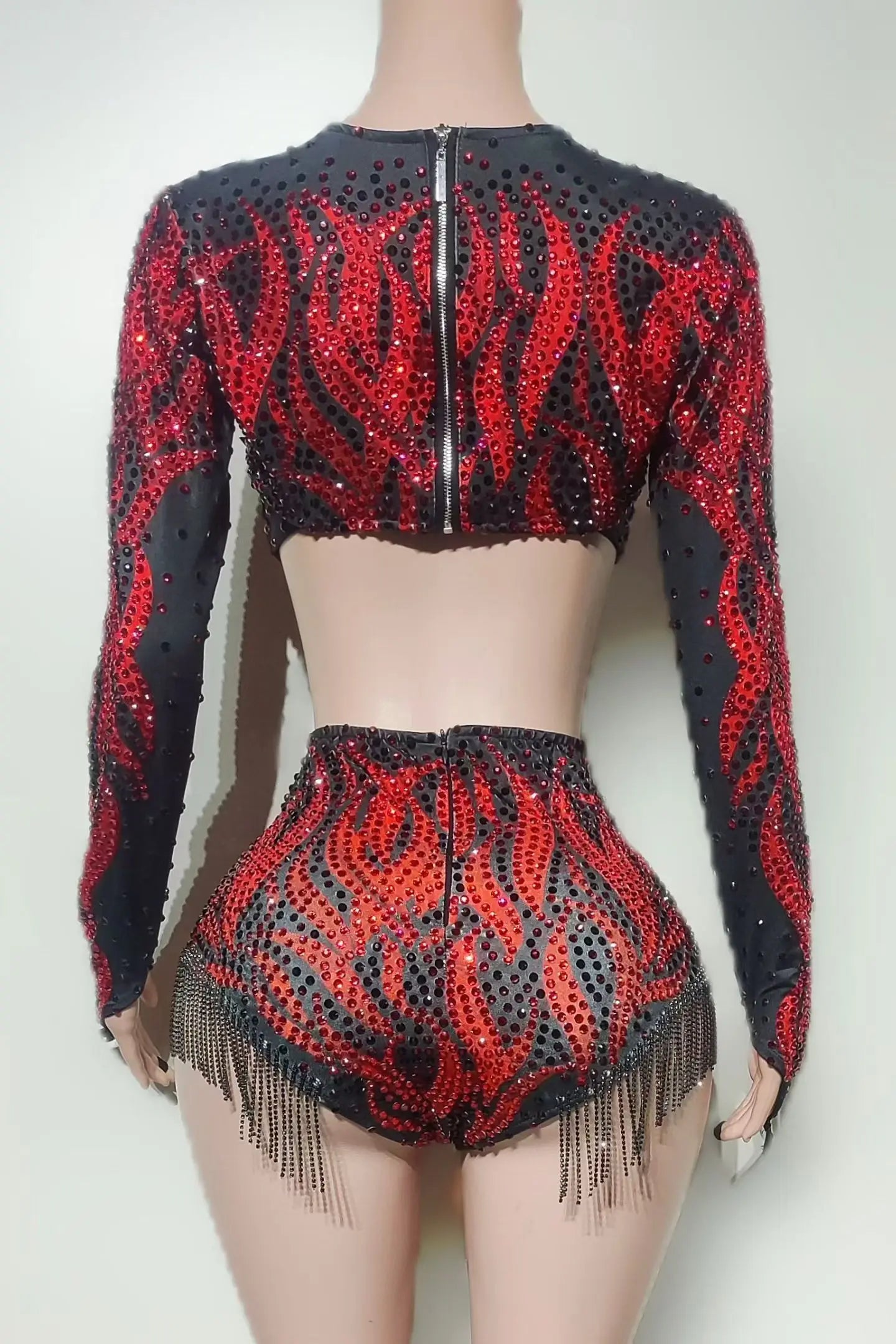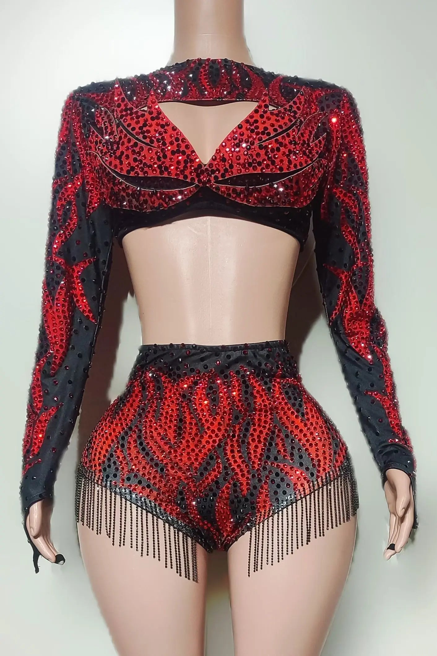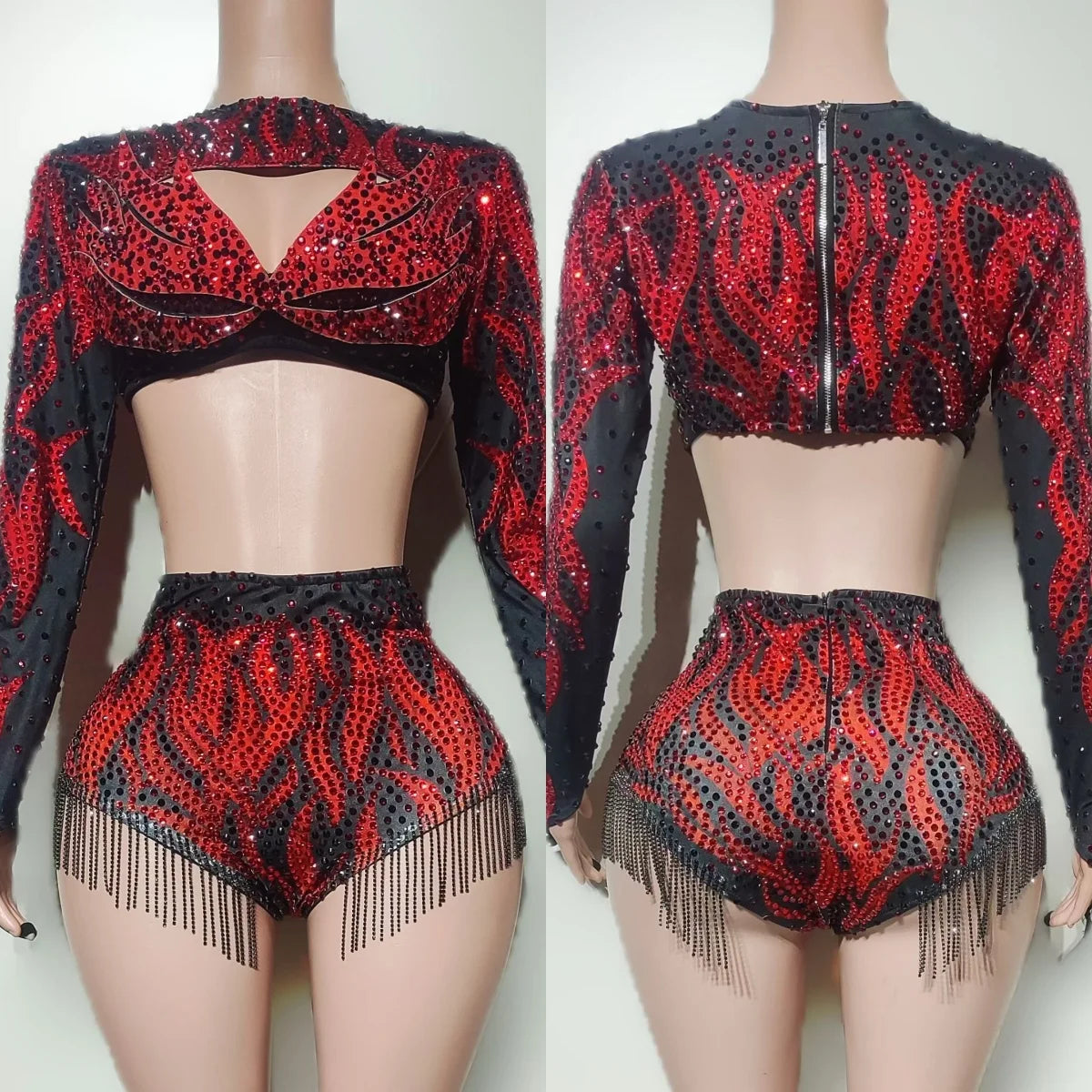 Party Show Sparkly Rhinestone Red Low-cut Crop Tops Bodysuit 聽2Pieces Set Tassel Nightclub Drag Queen Performer Outfit