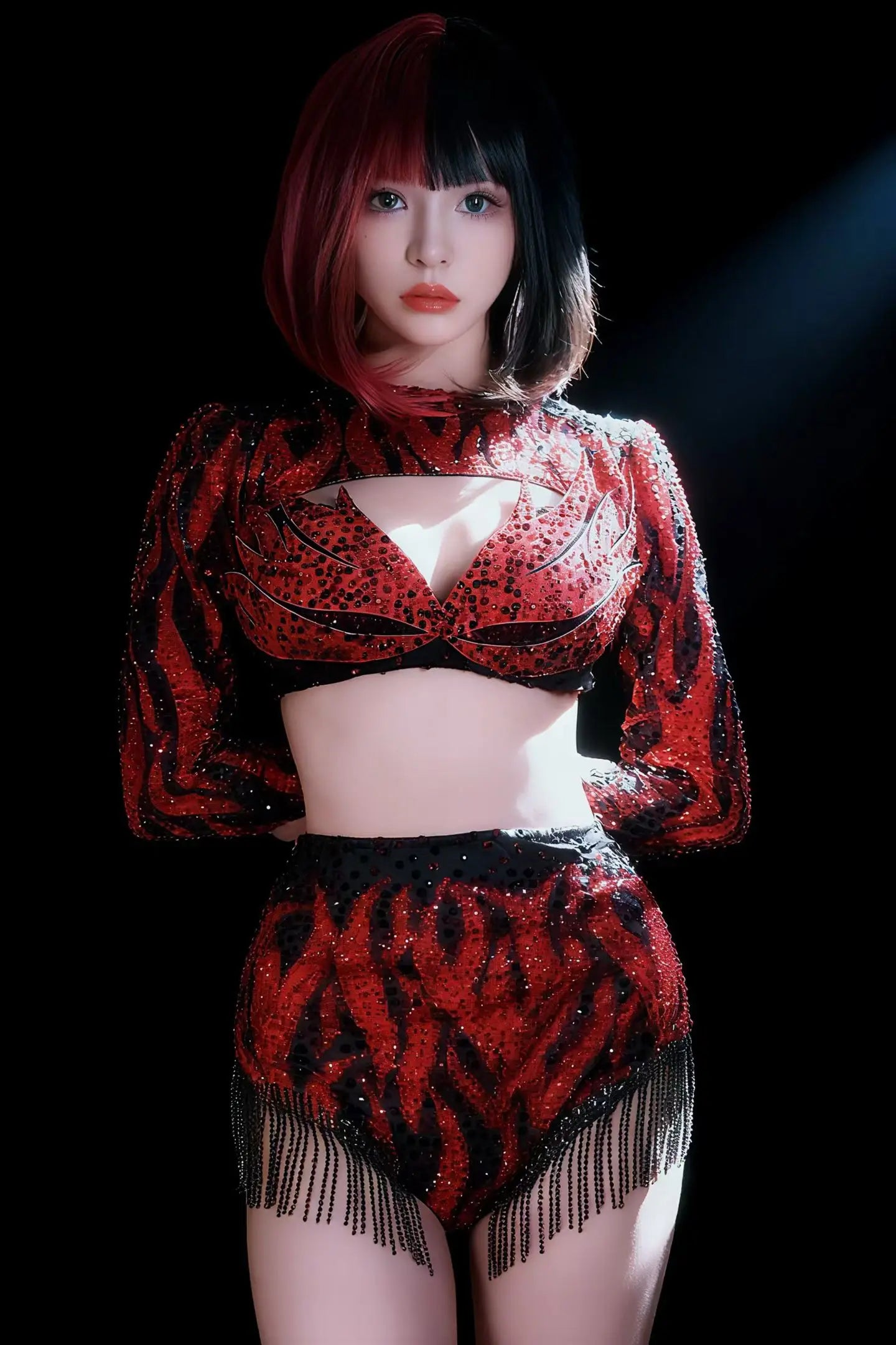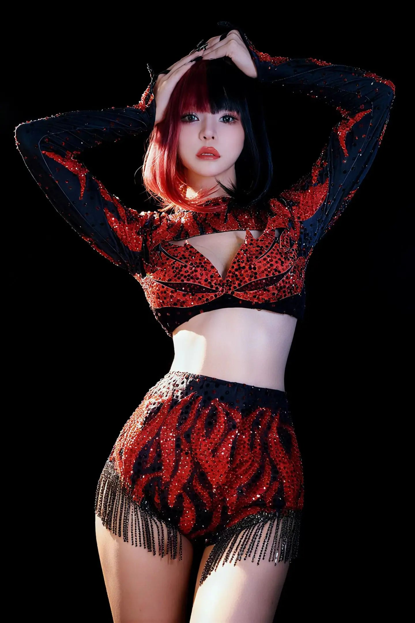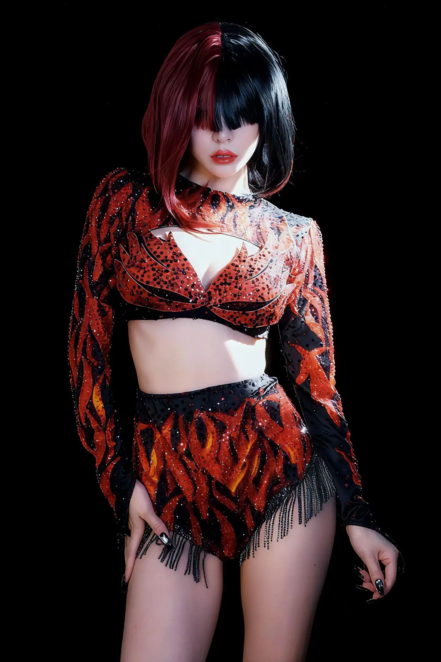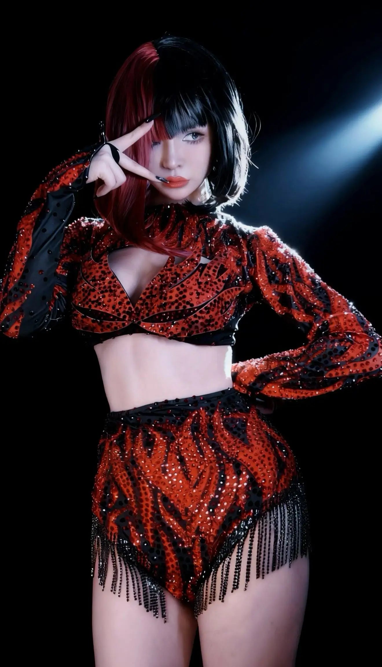 Party Show Sparkly Rhinestone Red Low-cut Crop Tops Bodysuit 聽2Pieces Set Tassel Nightclub Drag Queen Performer Outfit