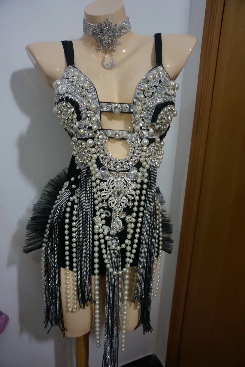 Pearl Tassels sexy bodysuit Shining crystals jumpsuit female costumes Bright diamond Rompers singer dancer DJ DS show costume