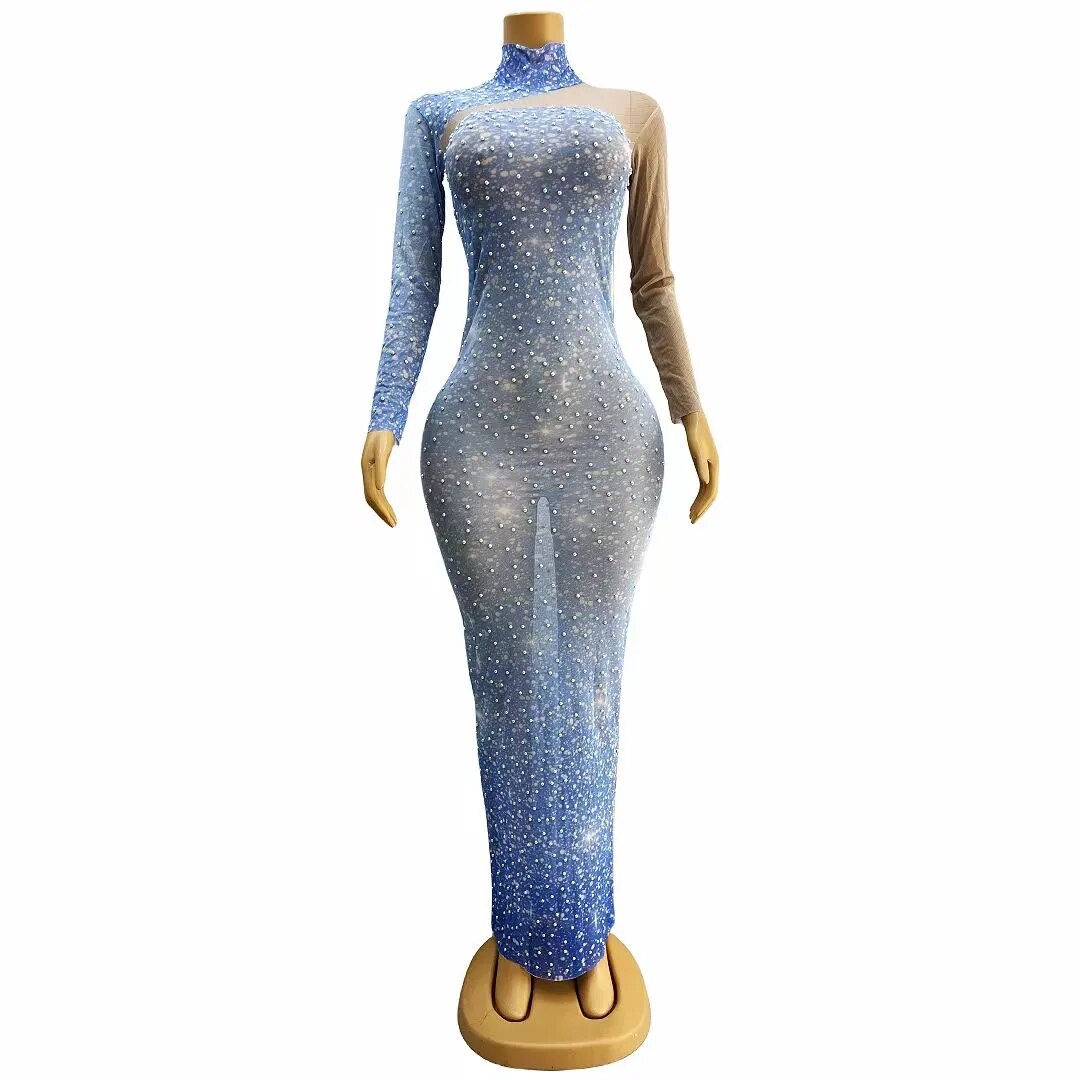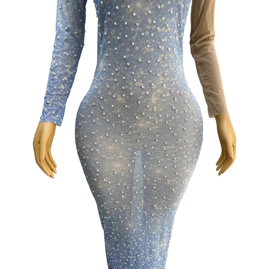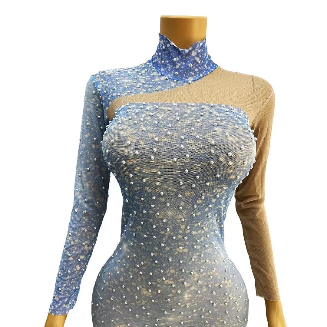 Pearls Sky Blue Transparent Long SleevesCelebrate Dress Birthday Sexy Outfit Prom PartyWearlantian
