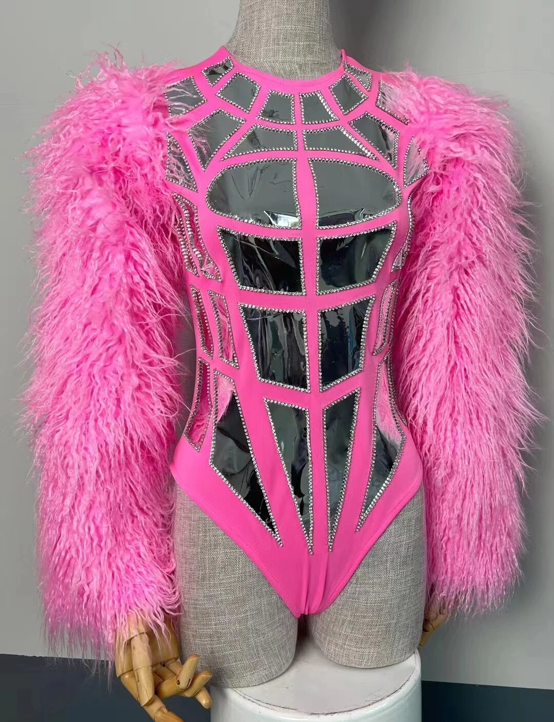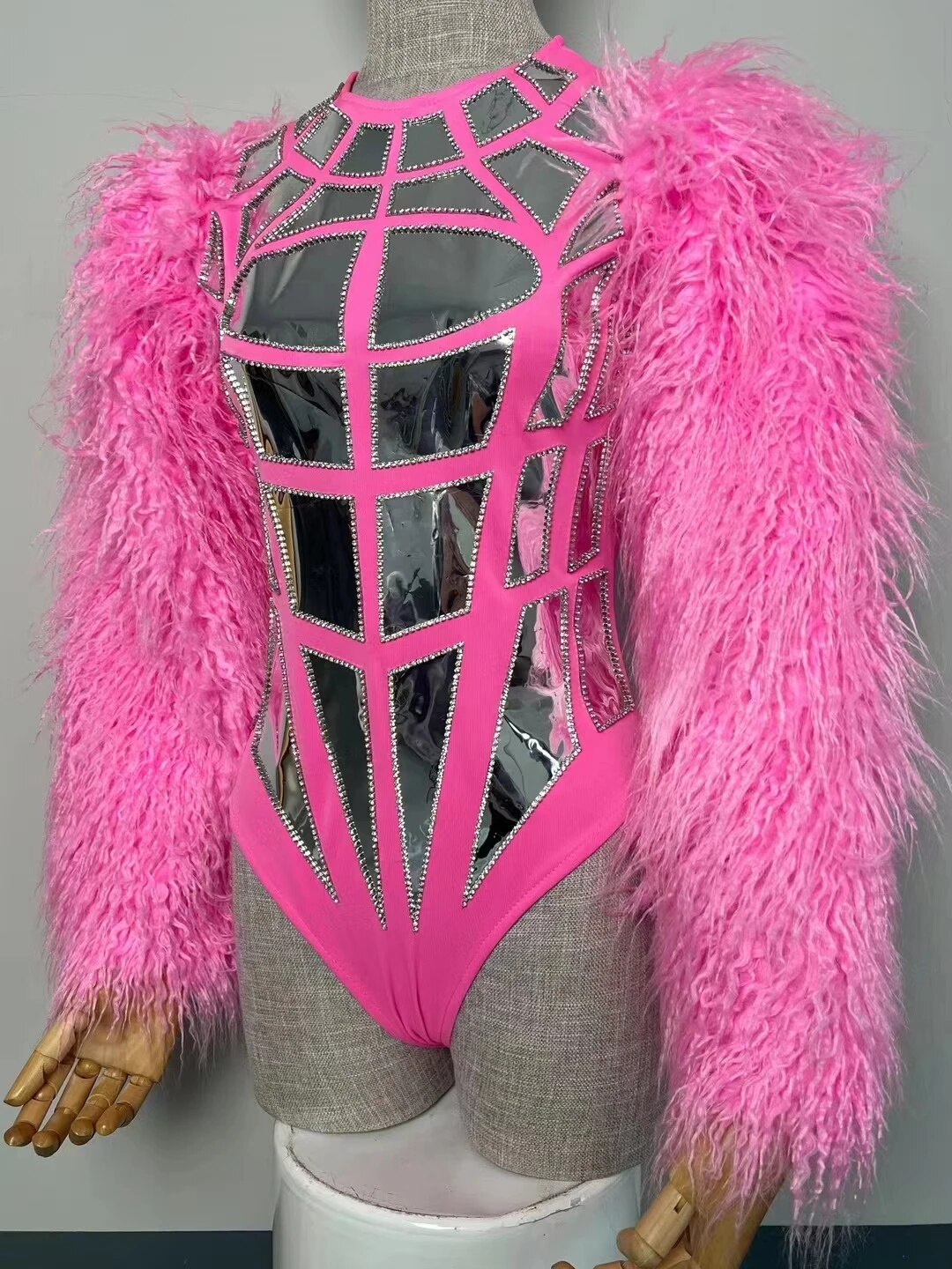Pink Fur Sleeve Silver Laser Mirror Bodysuit Women Dance Team Sexy DJ Gogo Stage Wear Nightclub Party Show Drag Queen Costume