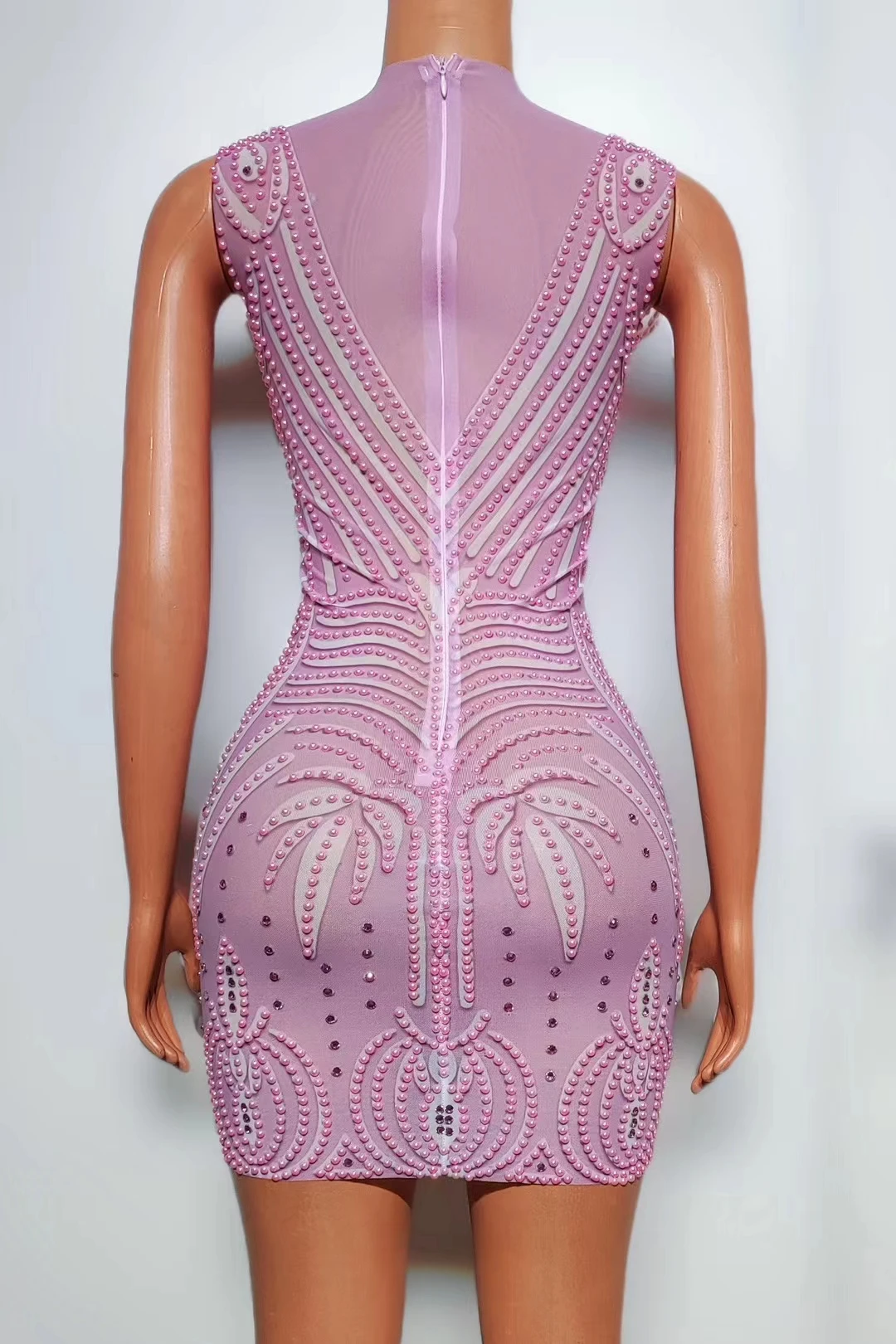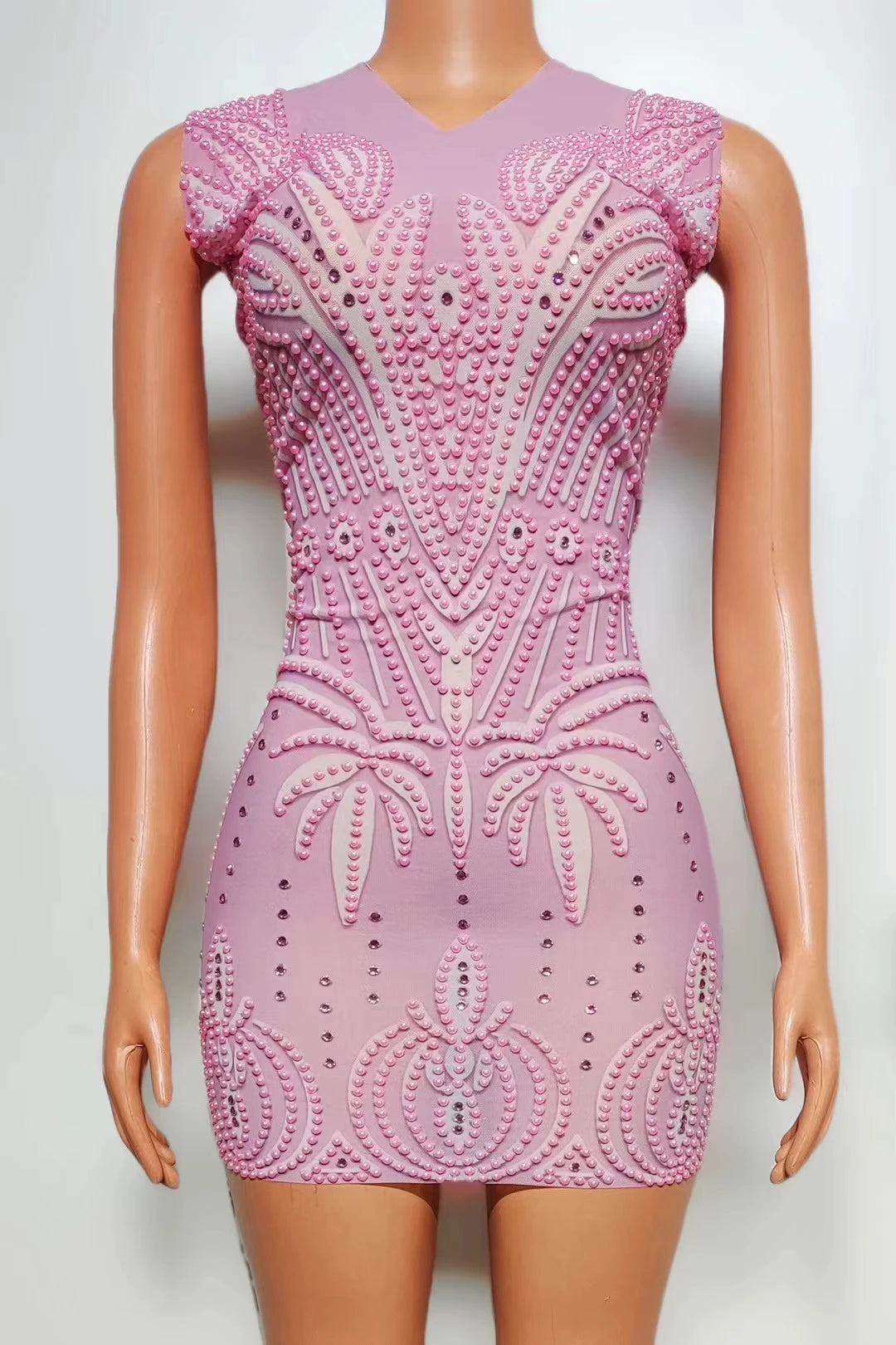 Pink Sleeveless Short Dress Luxury Pearls Bling Rhinestones Playful Charming Birthday Dress Dance Party Elegant Dress Yingying