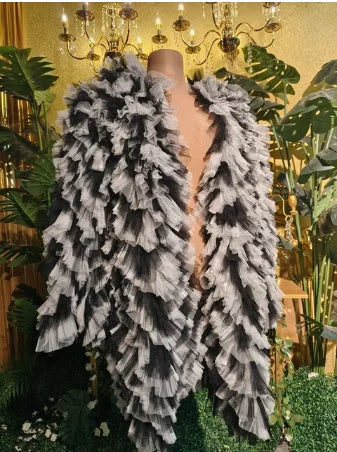 A dramatic, lightweightpleated mesh coatdesigned for singers, dancers, go‑go performers, drag artists, DJs, and clubwear. Combines sculptural volume with breathable stretch mesh so the coat reads onstage while allowing freedom of movement, quick changes, and long performance hours.