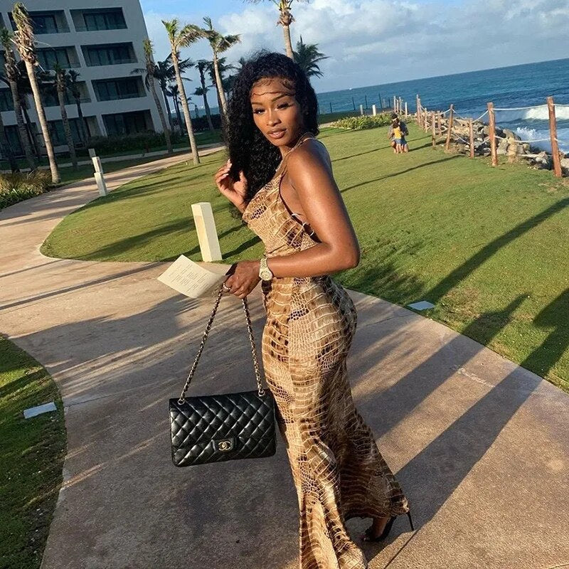 Print Sexy Long Fishtail Dress For Women Robe New Spaghetti Strap Sleeveless Backless Ruched Maxi Dress