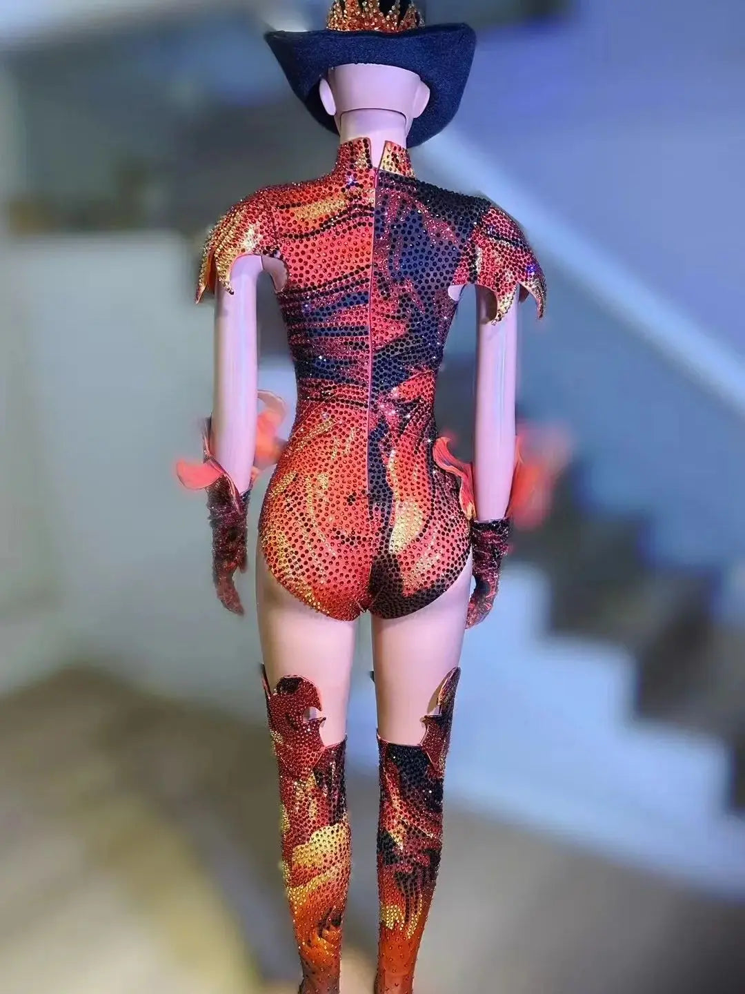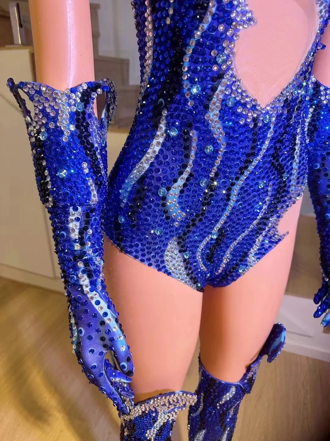 Red Blue Rhinestones Bodsyuit Gloves Hat Women Sexy Perspective Pole Dance Outfit Stage Gogo Wear Drag Queen Costumes