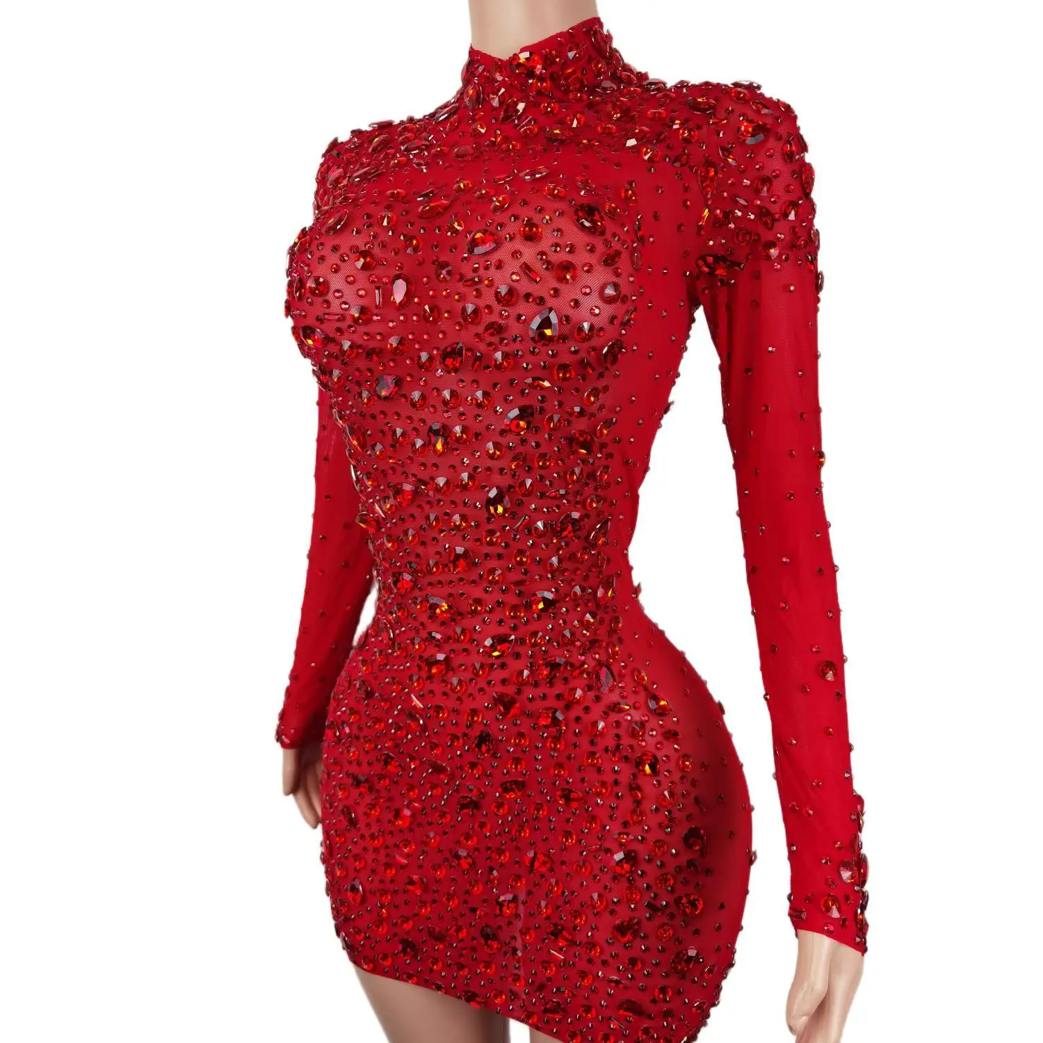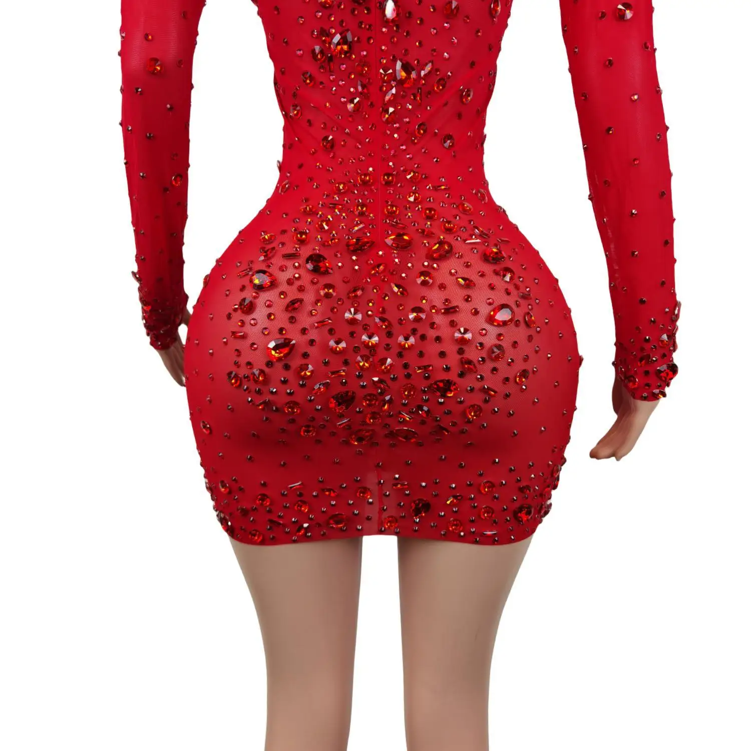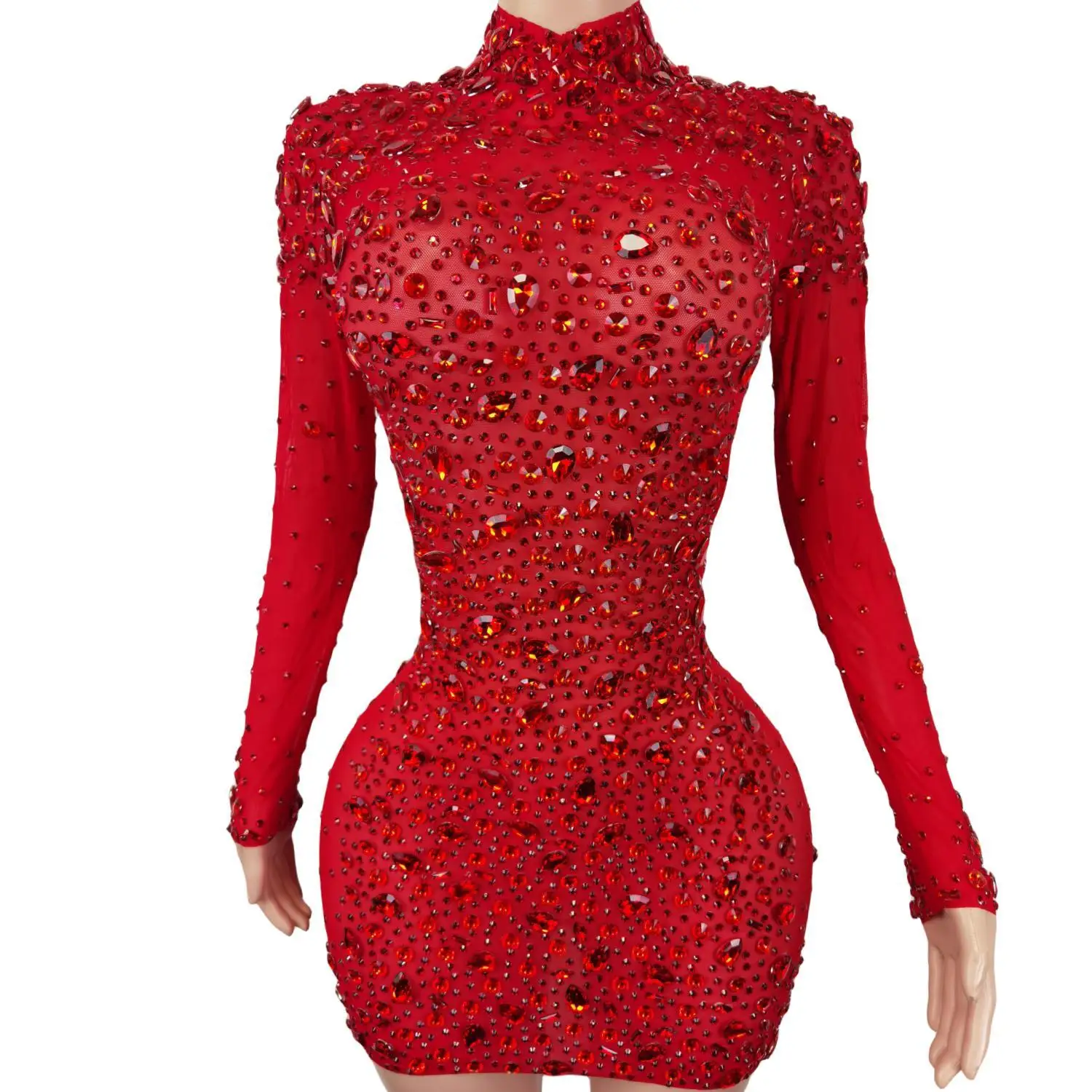 Red Rhinestones Mesh Dresses for Women Birthday Celebrate Evening Stretch Costume Sexy Stage Dance Performance Dress Cuixing