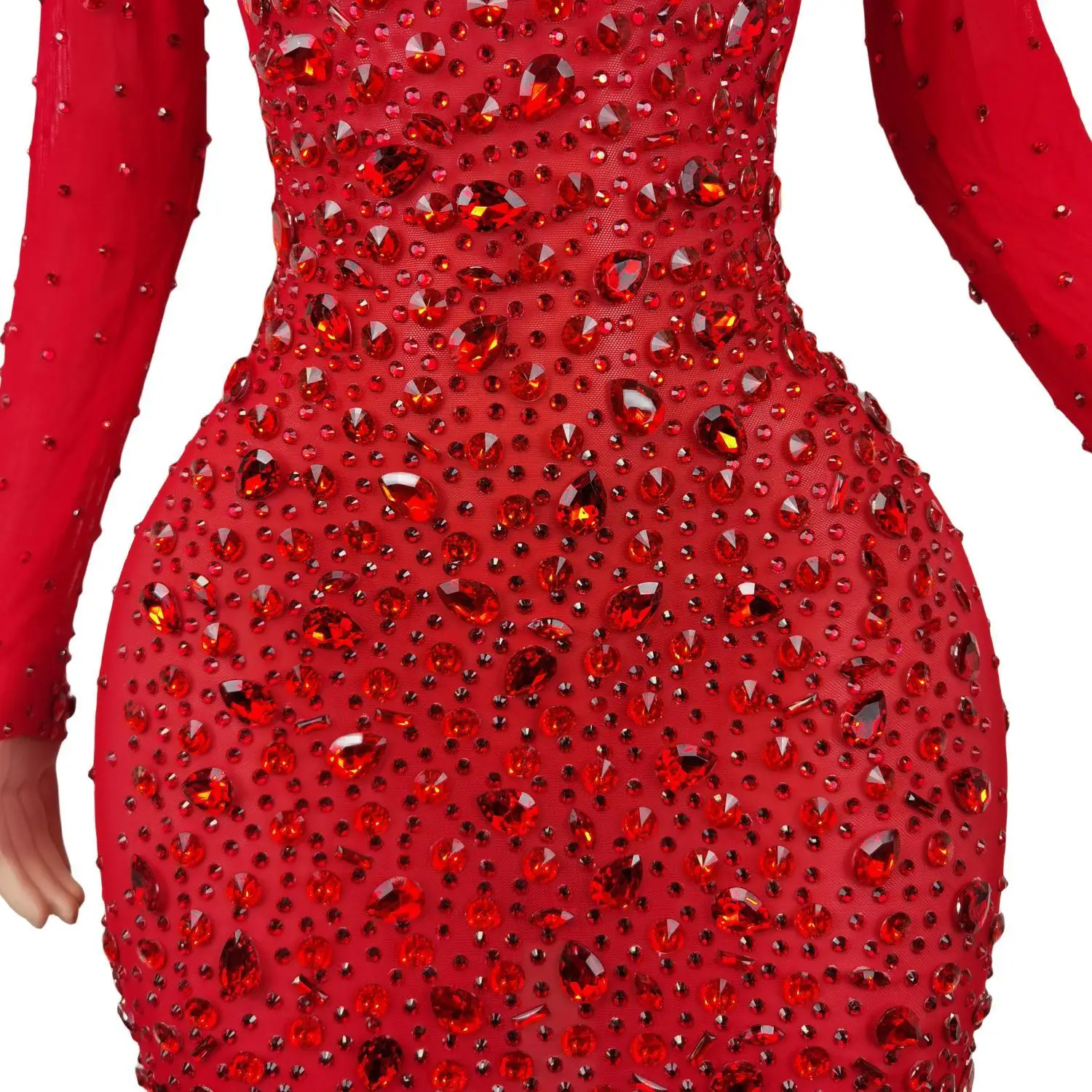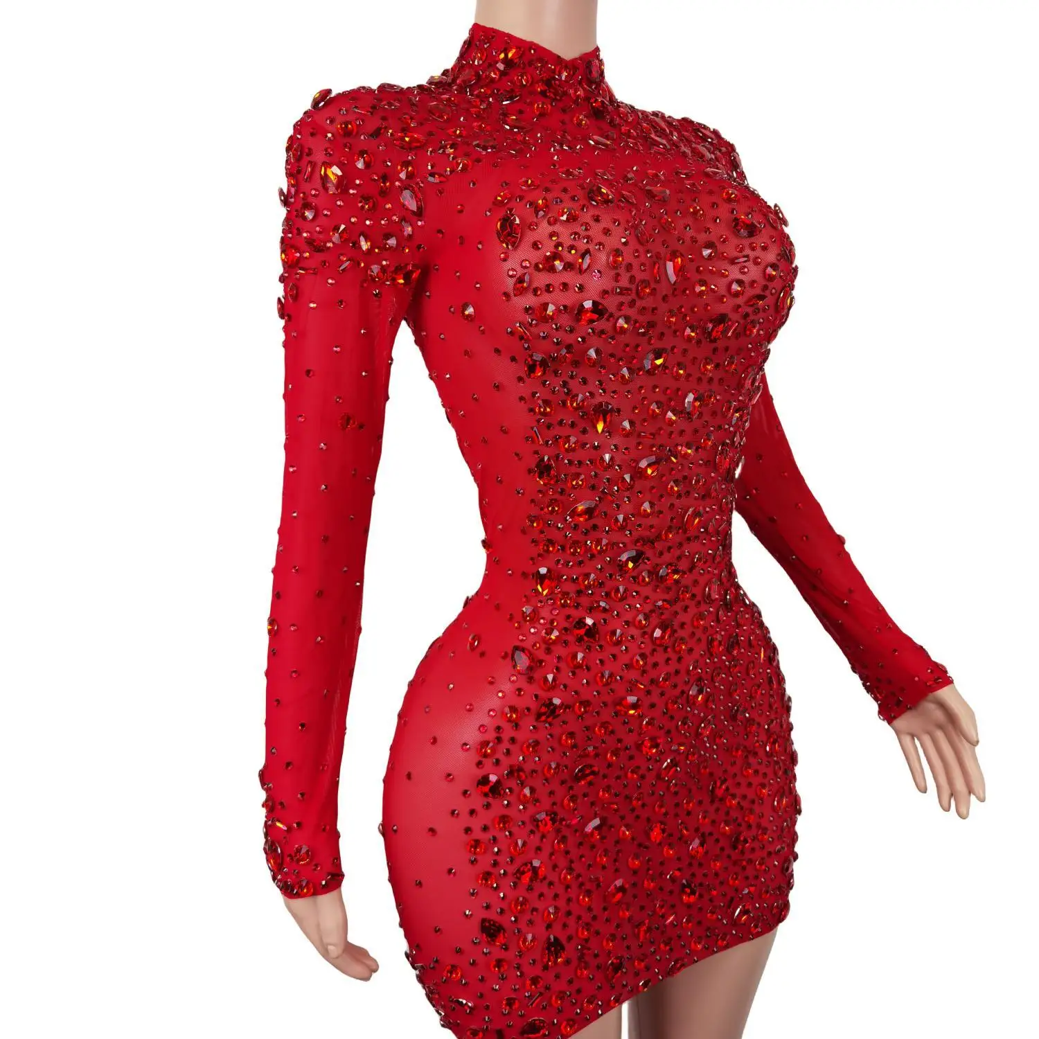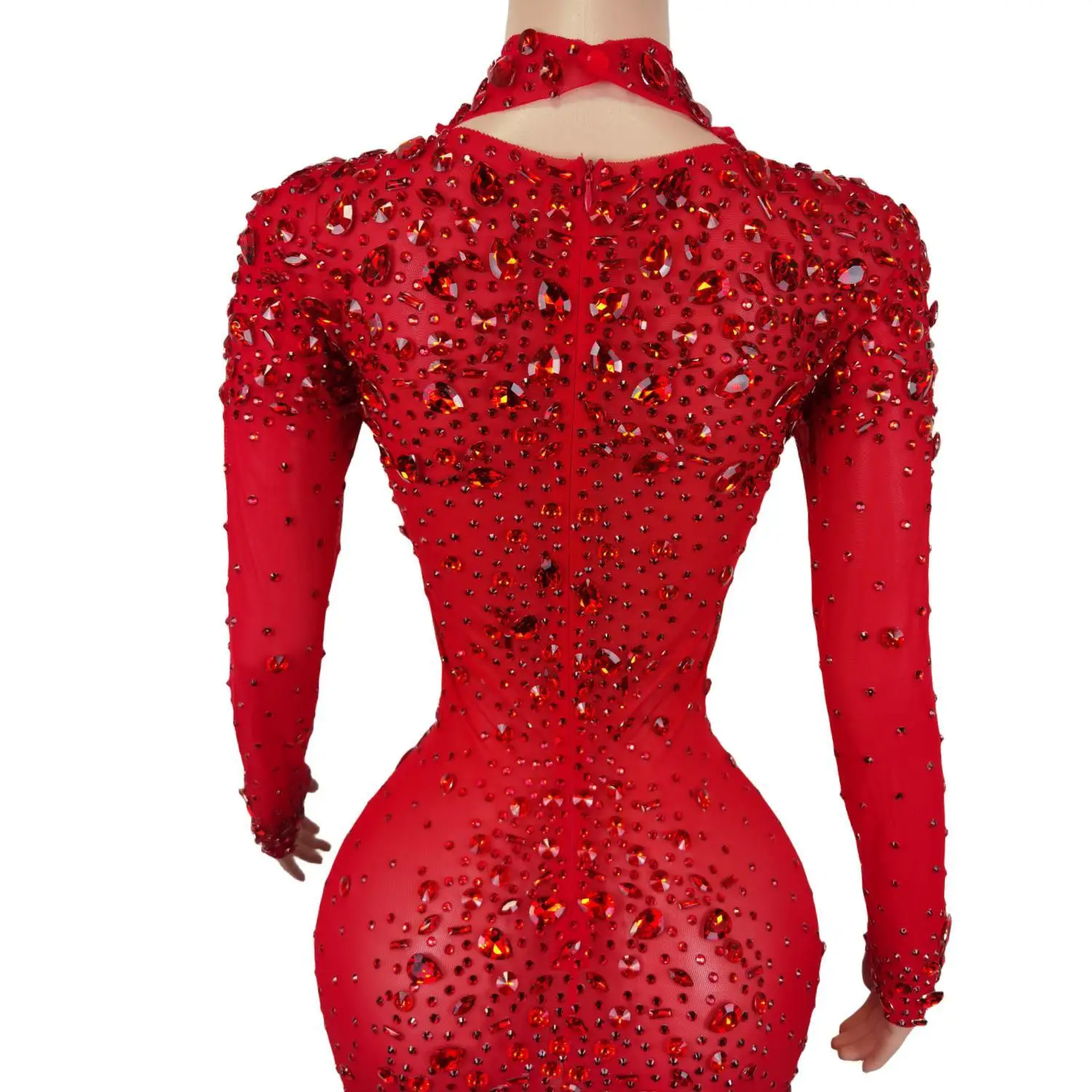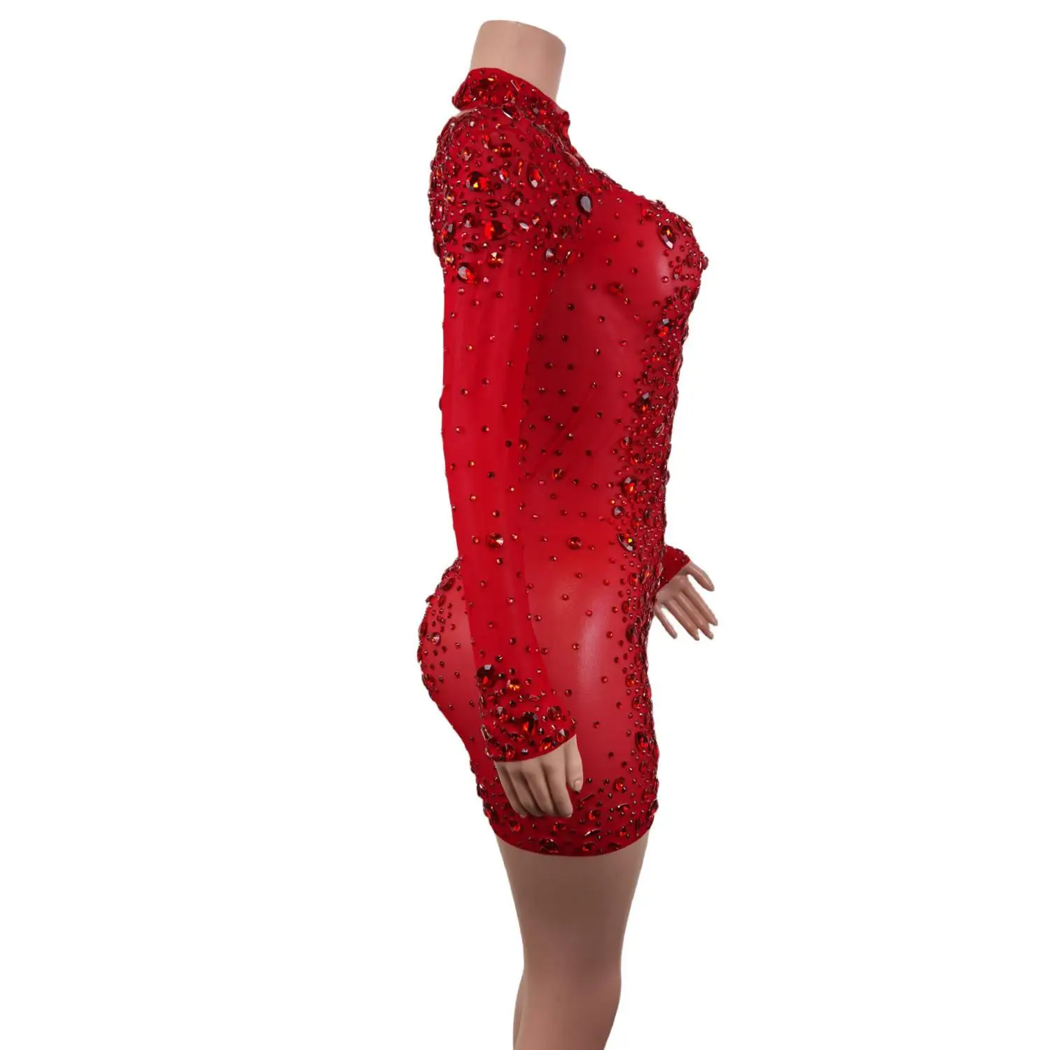 Red Rhinestones Mesh Dresses for Women Birthday Celebrate Evening Stretch Costume Sexy Stage Dance Performance Dress Cuixing