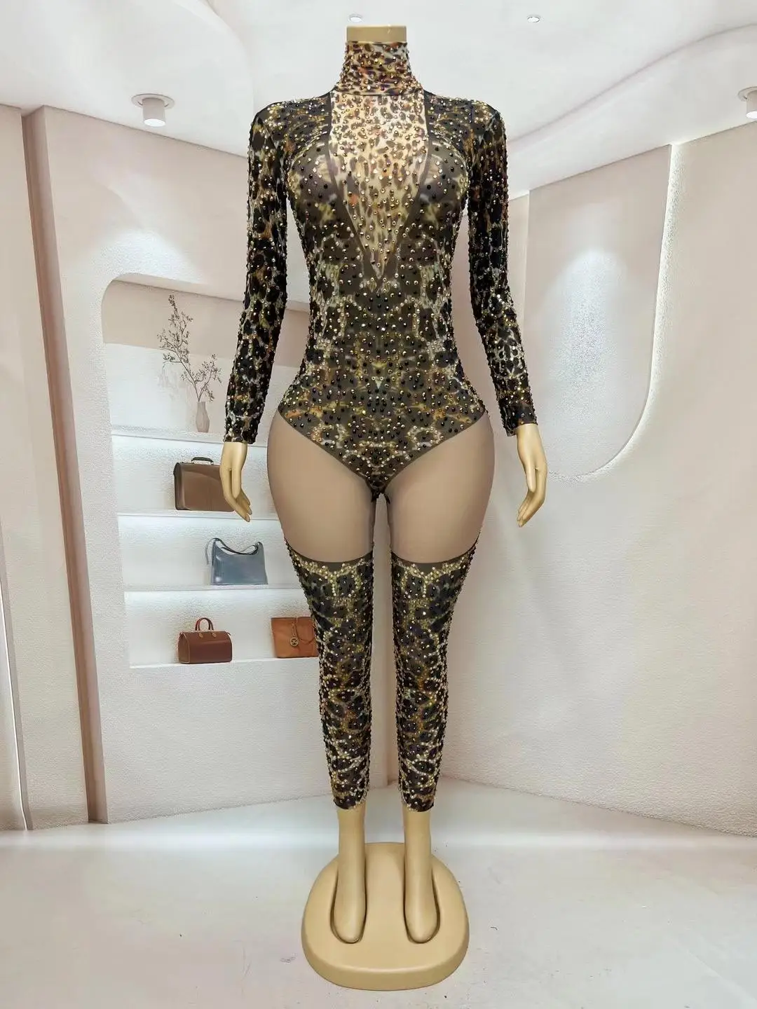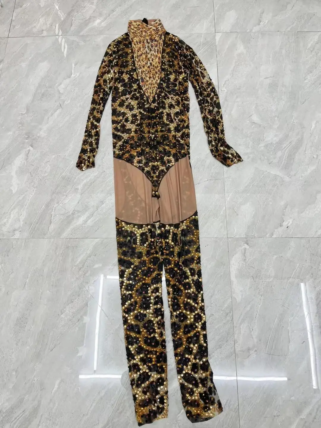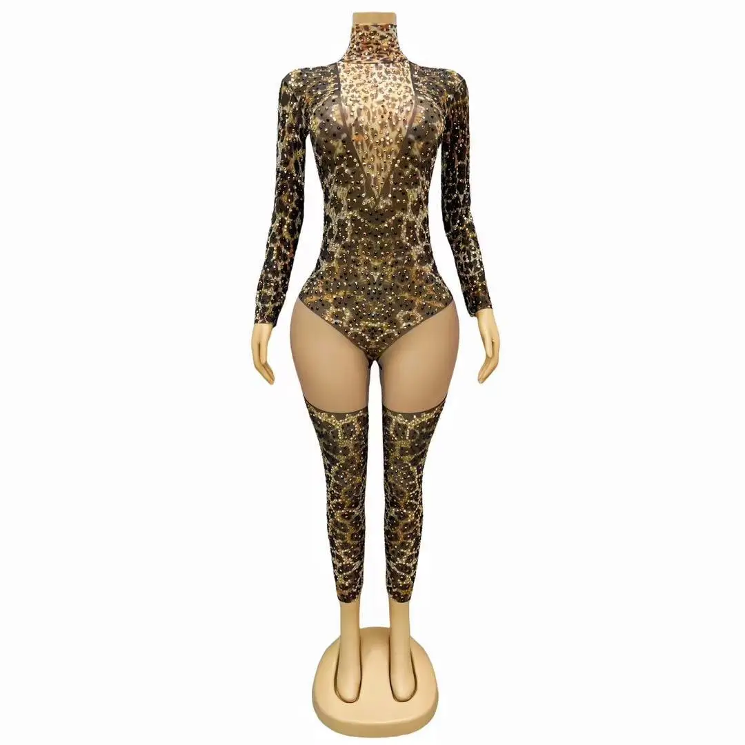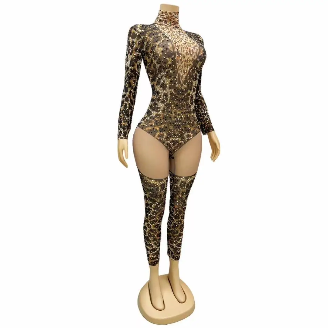 Rhinestone Leopard Mesh Jumpsuit for Female Singer Stage Costume Party Nightclub Rave Outfit Gogo Dance Clothes Liebao