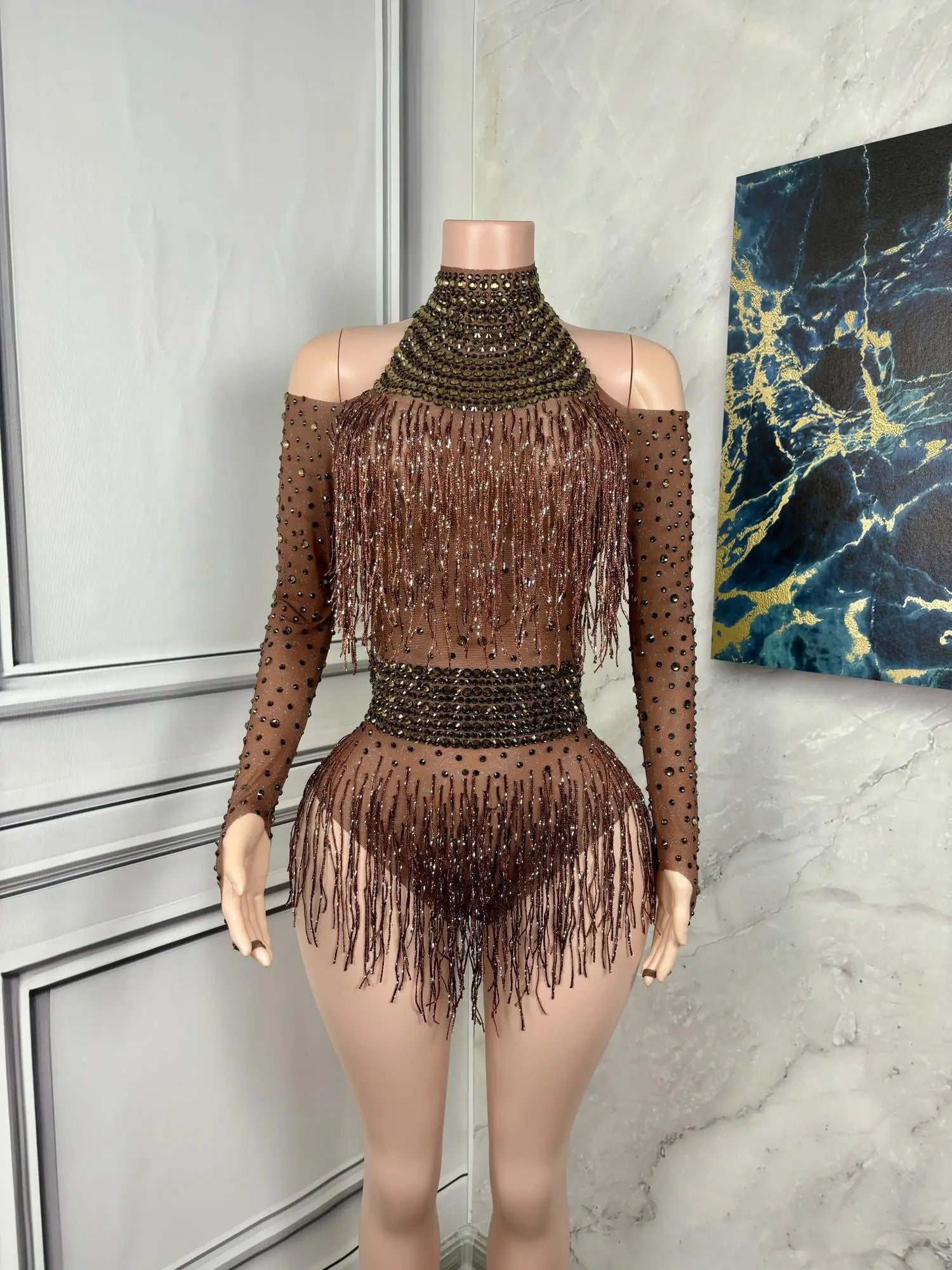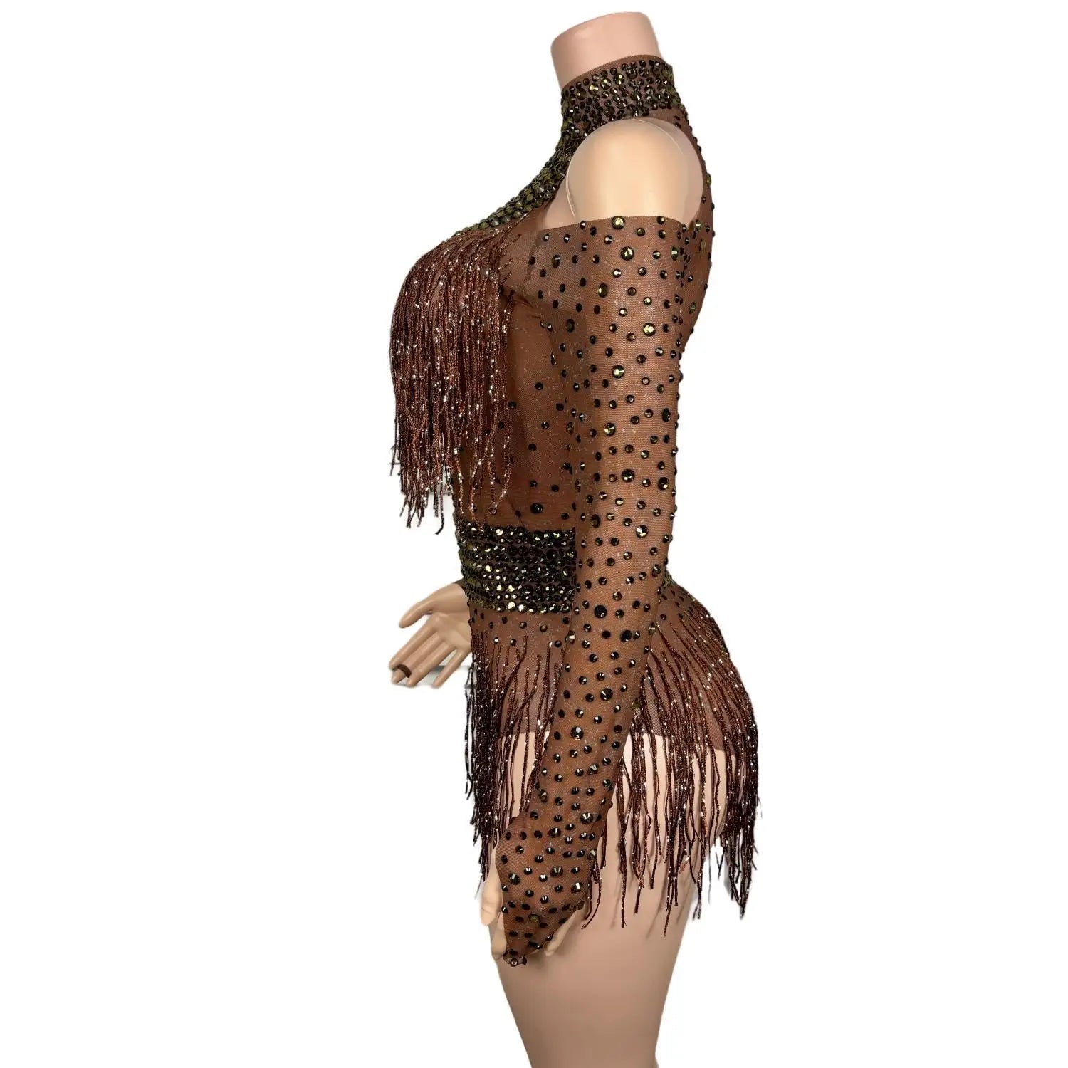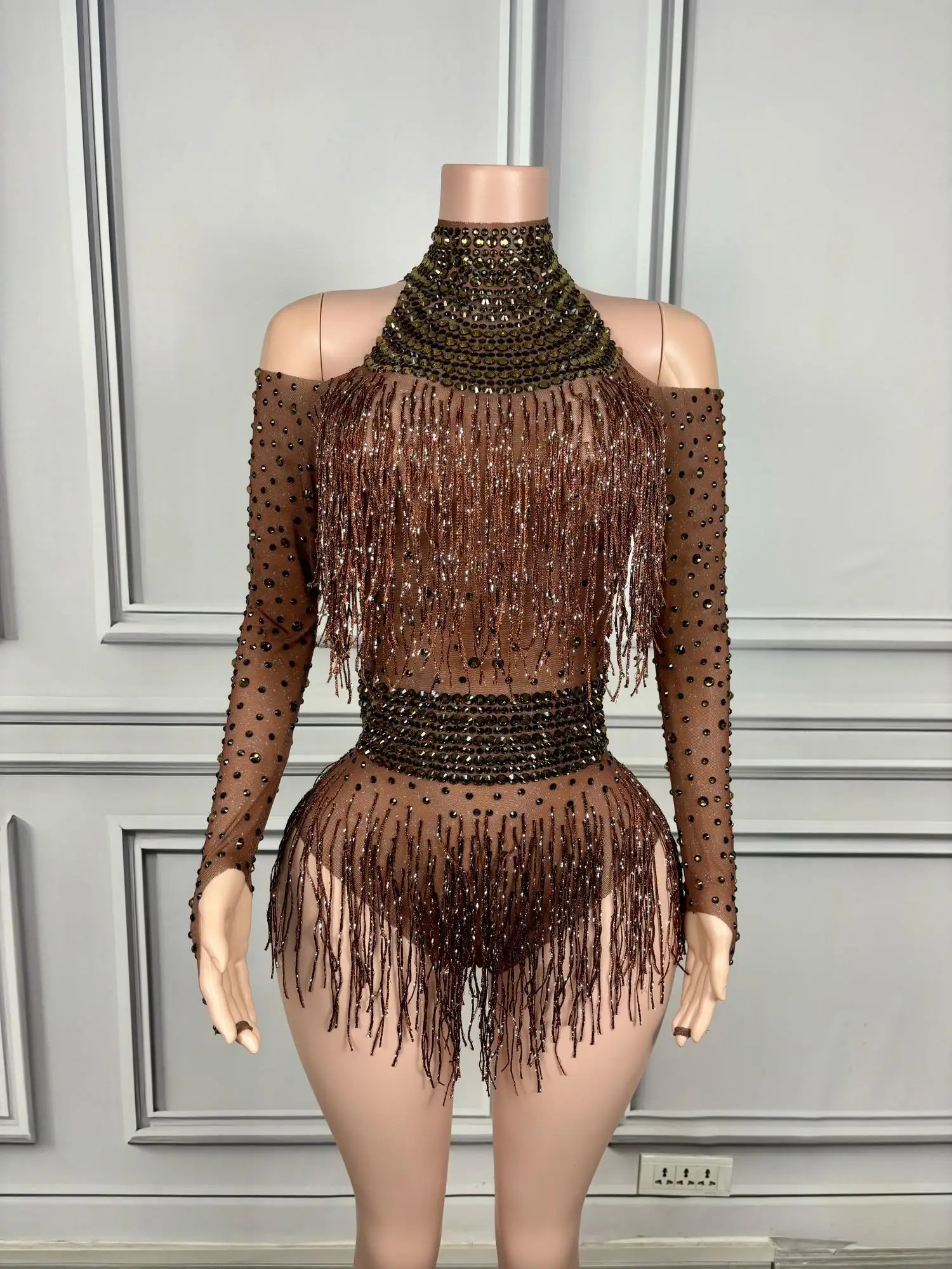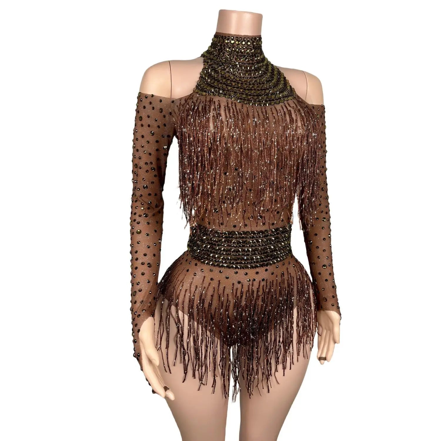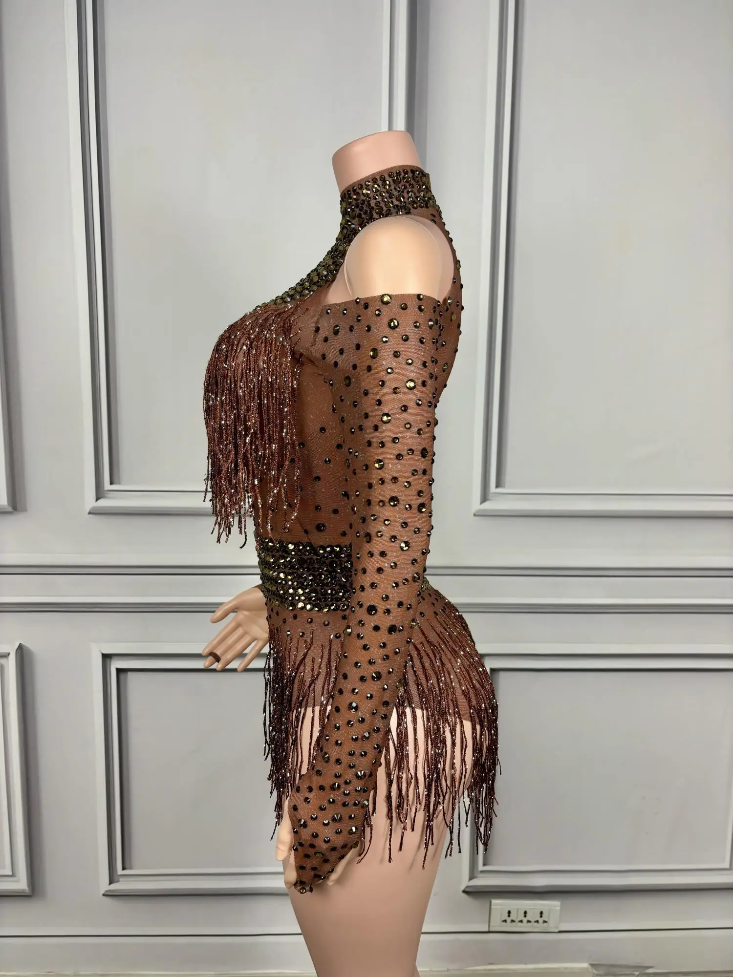 Rhinestone Tassel Short Long Sleeved Jumpsuits Prom Party Clothing Bodysuits Lady Fashion Dance Performance Costumes Nvtuan